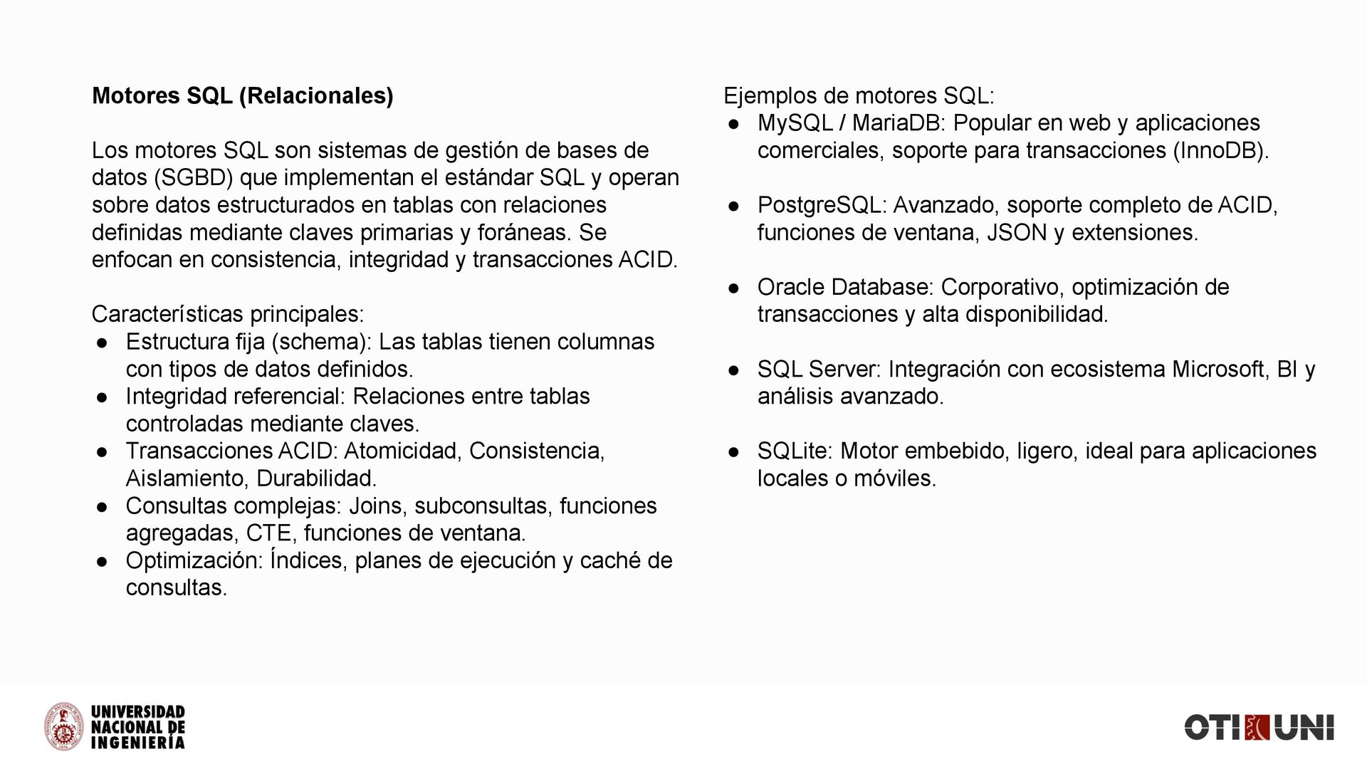 de bases de datos (SGBD) que implementan el estándar SQL y operan sobre datos estructurados en tablas con relaciones definidas mediante claves primarias y foráneas. Se enfocan en consistencia, integridad y transacciones ACID. Características principales: • Estructura fija (schema): Las tablas tienen columnas con tipos de datos definidos. • Integridad referencial: Relaciones entre tablas controladas mediante claves. • Transacciones ACID: Atomicidad, Consistencia, Aislamiento, Durabilidad. • Consultas complejas: Joins, subconsultas, funciones agregadas, CTE, funciones de ventana. • Optimización: Índices, planes de ejecución y caché de consultas. Ejemplos de motores SQL: • MySQL / MariaDB: Popular en web y aplicaciones comerciales, soporte para transacciones (InnoDB). • PostgreSQL: Avanzado, soporte completo de ACID, funciones de ventana, JSON y extensiones. • Oracle Database: Corporativo, optimización de transacciones y alta disponibilidad. • SQL Server: Integración con ecosistema Microsoft, BI y análisis avanzado. • SQLite: Motor embebido, ligero, ideal para aplicaciones locales o móviles.