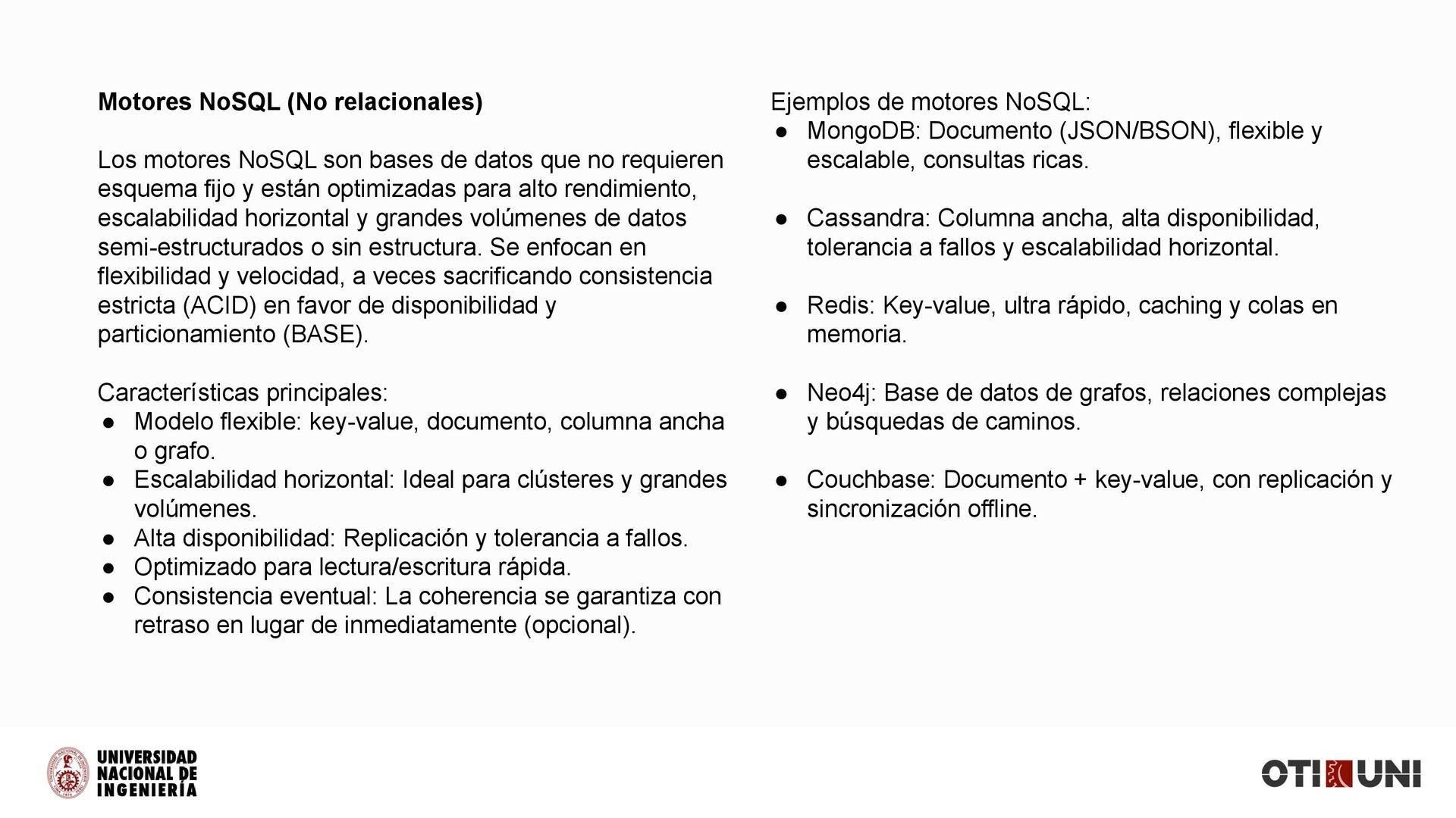 datos que no requieren esquema fijo y están optimizadas para alto rendimiento, escalabilidad horizontal y grandes volúmenes de datos semi-estructurados o sin estructura. Se enfocan en flexibilidad y velocidad, a veces sacrificando consistencia estricta (ACID) en favor de disponibilidad y particionamiento (BASE). Características principales: • Modelo flexible: key-value, documento, columna ancha o grafo. • Escalabilidad horizontal: Ideal para clústeres y grandes volúmenes. • Alta disponibilidad: Replicación y tolerancia a fallos. • Optimizado para lectura/escritura rápida. • Consistencia eventual: La coherencia se garantiza con retraso en lugar de inmediatamente (opcional). Ejemplos de motores NoSQL: • MongoDB: Documento (JSON/BSON), flexible y escalable, consultas ricas. • Cassandra: Columna ancha, alta disponibilidad, tolerancia a fallos y escalabilidad horizontal. • Redis: Key-value, ultra rápido, caching y colas en memoria. • Neo4j: Base de datos de grafos, relaciones complejas y búsquedas de caminos. • Couchbase: Documento + key-value, con replicación y sincronización offline.