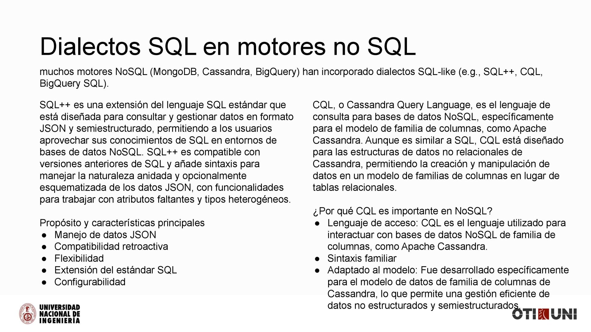 Cassandra, BigQuery) han incorporado dialectos SQL-like (e.g., SQL++, CQL, BigQuery SQL). SQL++ es una extensión del lenguaje SQL estándar que está diseñada para consultar y gestionar datos en formato JSON y semiestructurado, permitiendo a los usuarios aprovechar sus conocimientos de SQL en entornos de bases de datos NoSQL. SQL++ es compatible con versiones anteriores de SQL y añade sintaxis para manejar la naturaleza anidada y opcionalmente esquematizada de los datos JSON, con funcionalidades para trabajar con atributos faltantes y tipos heterogéneos. Propósito y características principales • Manejo de datos JSON • Compatibilidad retroactiva • Flexibilidad • Extensión del estándar SQL • Configurabilidad CQL, o Cassandra Query Language, es el lenguaje de consulta para bases de datos NoSQL, específicamente para el modelo de familia de columnas, como Apache Cassandra. Aunque es similar a SQL, CQL está diseñado para las estructuras de datos no relacionales de Cassandra, permitiendo la creación y manipulación de datos en un modelo de familias de columnas en lugar de tablas relacionales. ¿Por qué CQL es importante en NoSQL? • Lenguaje de acceso: CQL es el lenguaje utilizado para interactuar con bases de datos NoSQL de familia de columnas, como Apache Cassandra. • Sintaxis familiar • Adaptado al modelo: Fue desarrollado específicamente para el modelo de datos de familia de columnas de Cassandra, lo que permite una gestión eficiente de datos no estructurados y semiestructurados.