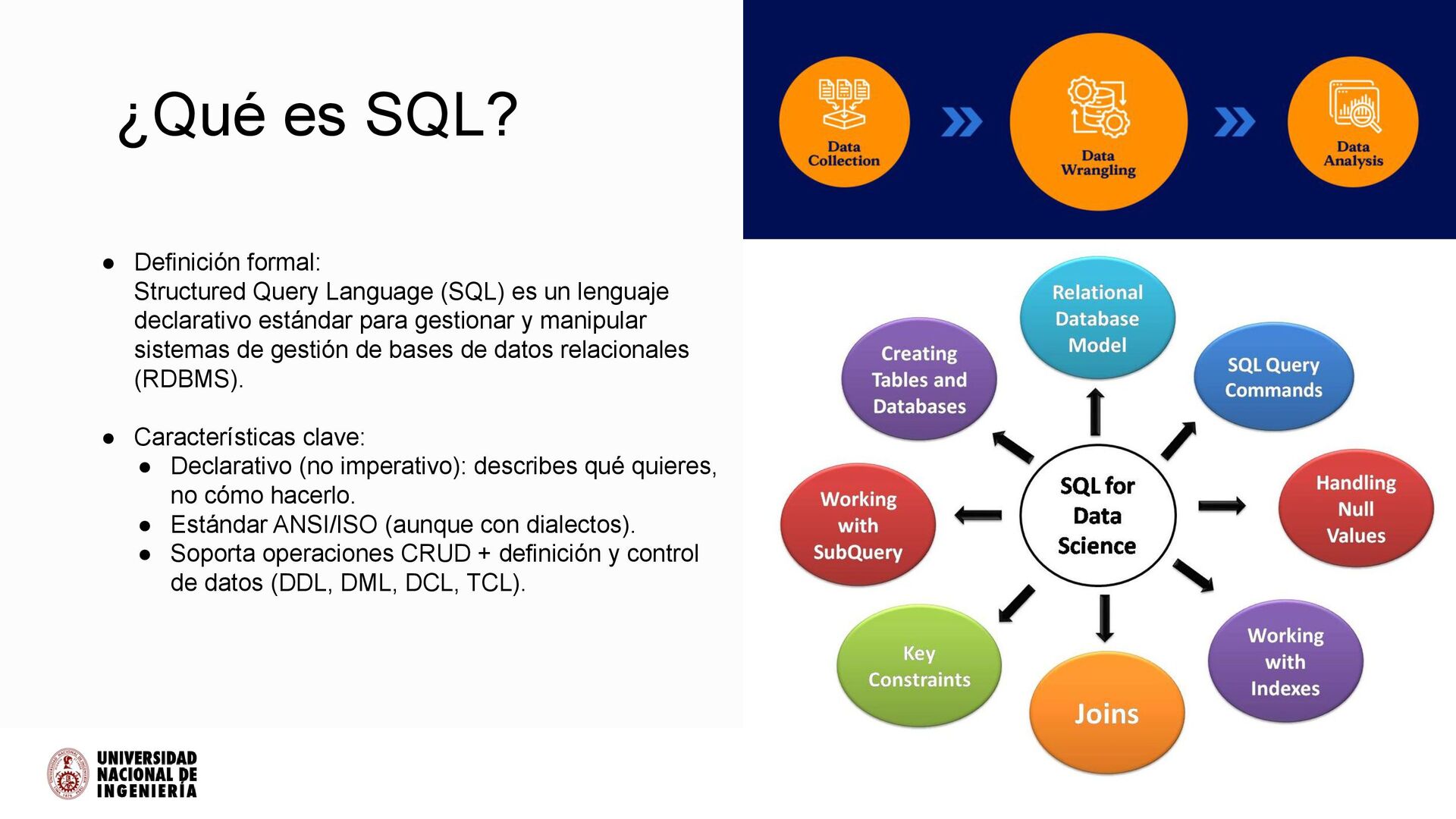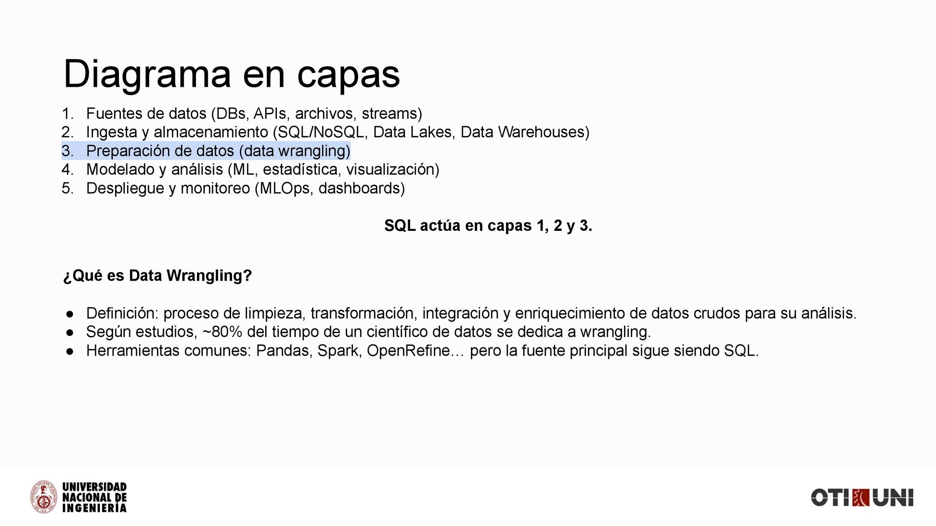 streams) 2. Ingesta y almacenamiento (SQL/NoSQL, Data Lakes, Data Warehouses) 3. Preparación de datos (data wrangling) 4. Modelado y análisis (ML, estadística, visualización) 5. Despliegue y monitoreo (MLOps, dashboards) SQL actúa en capas 1, 2 y 3. ¿Qué es Data Wrangling? • Definición: proceso de limpieza, transformación, integración y enriquecimiento de datos crudos para su análisis. • Según estudios, ~80% del tiempo de un científico de datos se dedica a wrangling. • Herramientas comunes: Pandas, Spark, OpenRefine… pero la fuente principal sigue siendo SQL.