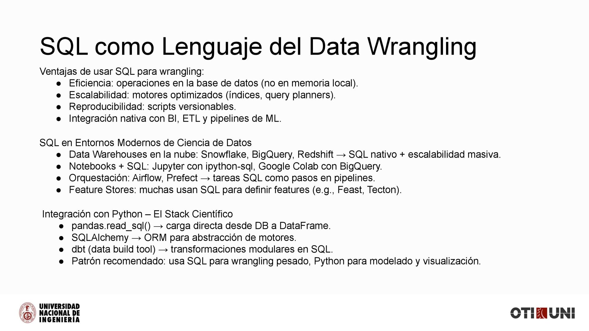 para wrangling: • Eficiencia: operaciones en la base de datos (no en memoria local). • Escalabilidad: motores optimizados (índices, query planners). • Reproducibilidad: scripts versionables. • Integración nativa con BI, ETL y pipelines de ML. SQL en Entornos Modernos de Ciencia de Datos • Data Warehouses en la nube: Snowflake, BigQuery, Redshift → SQL nativo + escalabilidad masiva. • Notebooks + SQL: Jupyter con ipython-sql, Google Colab con BigQuery. • Orquestación: Airflow, Prefect → tareas SQL como pasos en pipelines. • Feature Stores: muchas usan SQL para definir features (e.g., Feast, Tecton). Integración con Python – El Stack Científico • pandas.read_sql() → carga directa desde DB a DataFrame. • SQLAlchemy → ORM para abstracción de motores. • dbt (data build tool) → transformaciones modulares en SQL. • Patrón recomendado: usa SQL para wrangling pesado, Python para modelado y visualización.