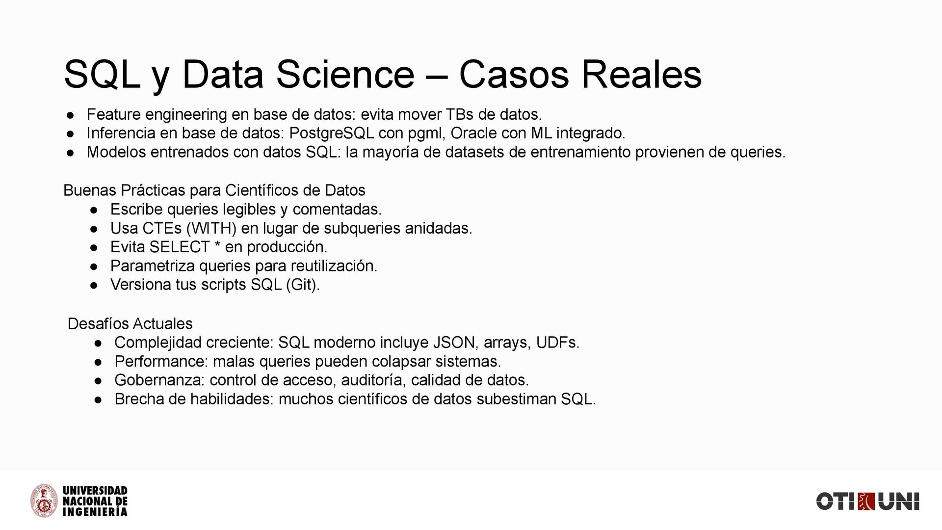 en base de datos: evita mover TBs de datos. • Inferencia en base de datos: PostgreSQL con pgml, Oracle con ML integrado. • Modelos entrenados con datos SQL: la mayoría de datasets de entrenamiento provienen de queries. Buenas Prácticas para Científicos de Datos • Escribe queries legibles y comentadas. • Usa CTEs (WITH) en lugar de subqueries anidadas. • Evita SELECT * en producción. • Parametriza queries para reutilización. • Versiona tus scripts SQL (Git). Desafíos Actuales • Complejidad creciente: SQL moderno incluye JSON, arrays, UDFs. • Performance: malas queries pueden colapsar sistemas. • Gobernanza: control de acceso, auditoría, calidad de datos. • Brecha de habilidades: muchos científicos de datos subestiman SQL.