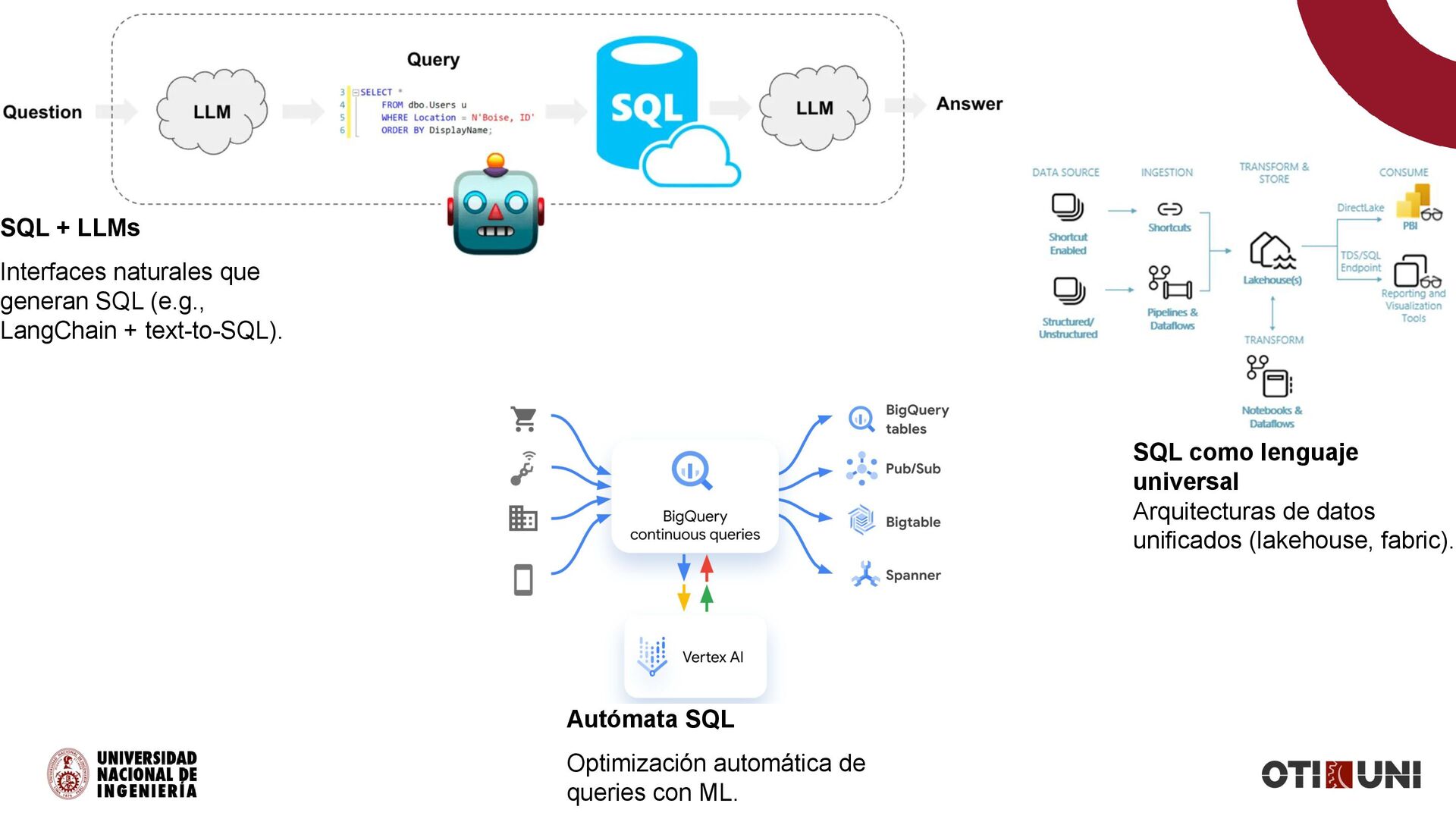 + text-to-SQL). Autómata SQL Optimización automática de queries con ML. SQL como lenguaje universal Arquitecturas de datos unificados (lakehouse, fabric).