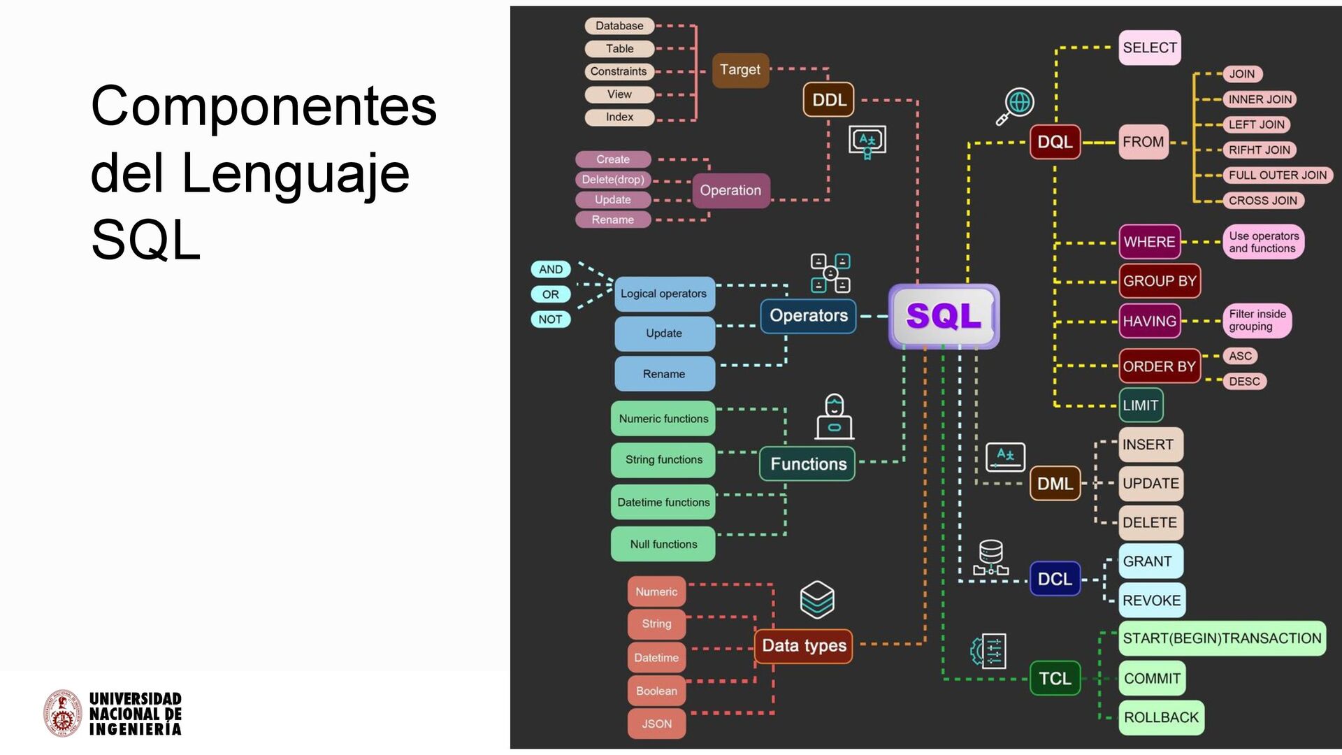 es un lenguaje declarativo estándar para gestionar y manipular sistemas de gestión de bases de datos relacionales (RDBMS). • Características clave: • Declarativo (no imperativo): describes qué quieres, no cómo hacerlo. • Estándar ANSI/ISO (aunque con dialectos). • Soporta operaciones CRUD + definición y control de datos (DDL, DML, DCL, TCL).