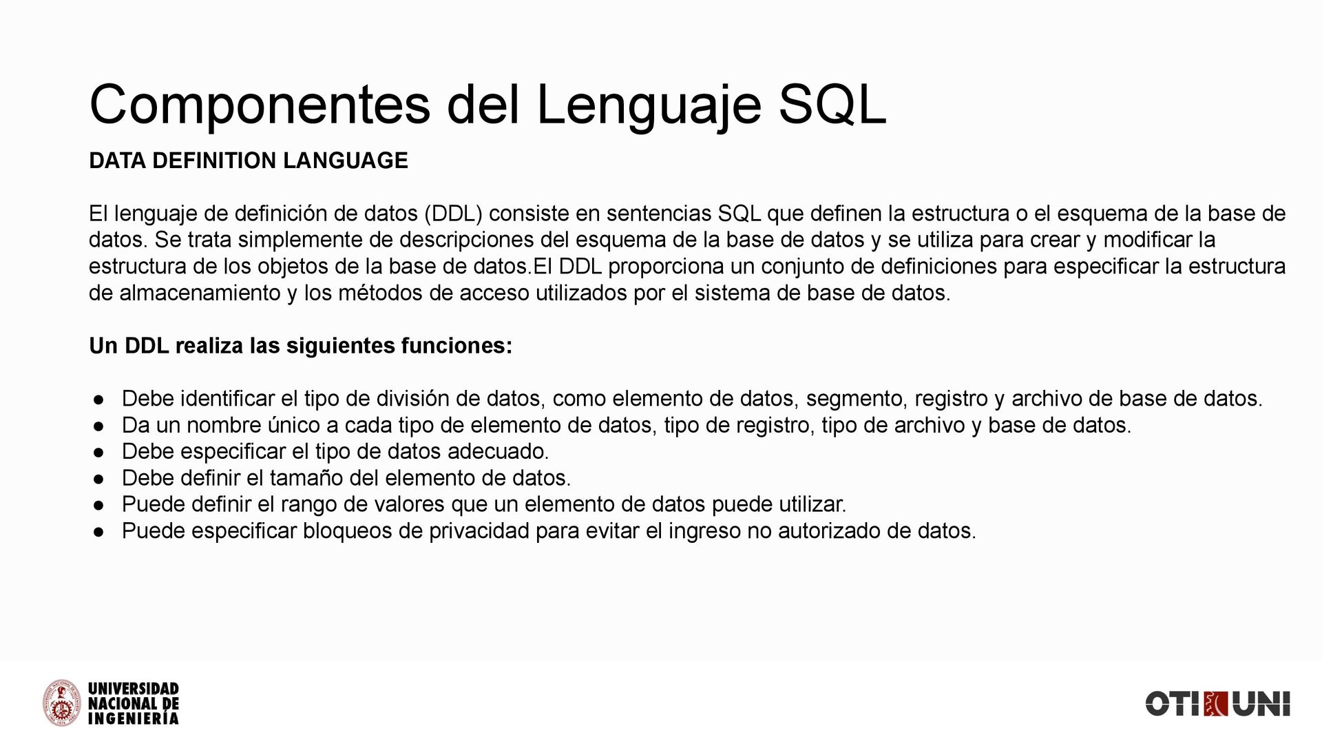 definición de datos (DDL) consiste en sentencias SQL que definen la estructura o el esquema de la base de datos. Se trata simplemente de descripciones del esquema de la base de datos y se utiliza para crear y modificar la estructura de los objetos de la base de datos.El DDL proporciona un conjunto de definiciones para especificar la estructura de almacenamiento y los métodos de acceso utilizados por el sistema de base de datos. Un DDL realiza las siguientes funciones: • Debe identificar el tipo de división de datos, como elemento de datos, segmento, registro y archivo de base de datos. • Da un nombre único a cada tipo de elemento de datos, tipo de registro, tipo de archivo y base de datos. • Debe especificar el tipo de datos adecuado. • Debe definir el tamaño del elemento de datos. • Puede definir el rango de valores que un elemento de datos puede utilizar. • Puede especificar bloqueos de privacidad para evitar el ingreso no autorizado de datos.