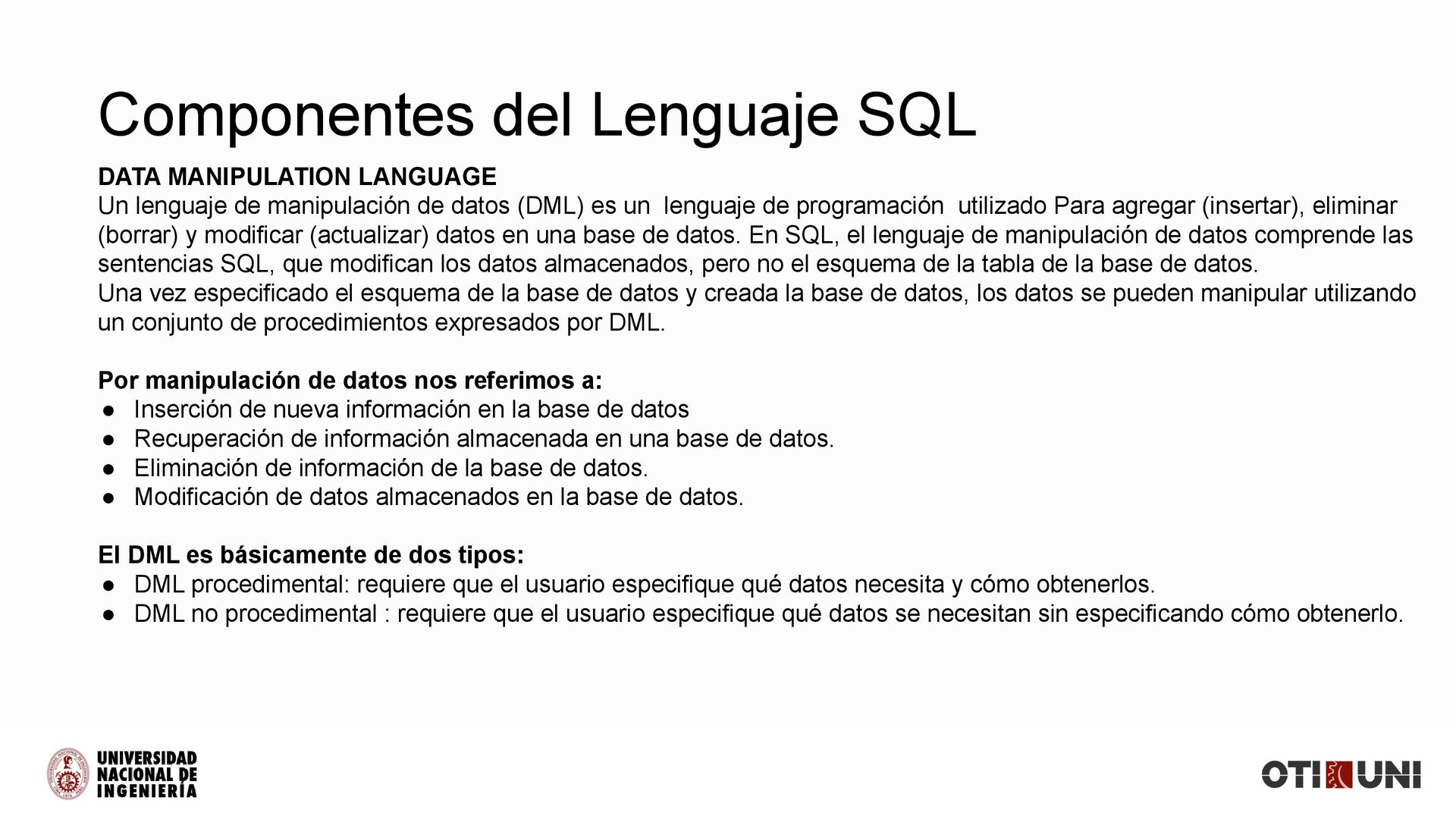 manipulación de datos (DML) es un lenguaje de programación utilizado Para agregar (insertar), eliminar (borrar) y modificar (actualizar) datos en una base de datos. En SQL, el lenguaje de manipulación de datos comprende las sentencias SQL, que modifican los datos almacenados, pero no el esquema de la tabla de la base de datos. Una vez especificado el esquema de la base de datos y creada la base de datos, los datos se pueden manipular utilizando un conjunto de procedimientos expresados por DML. Por manipulación de datos nos referimos a: • Inserción de nueva información en la base de datos • Recuperación de información almacenada en una base de datos. • Eliminación de información de la base de datos. • Modificación de datos almacenados en la base de datos. El DML es básicamente de dos tipos: • DML procedimental: requiere que el usuario especifique qué datos necesita y cómo obtenerlos. • DML no procedimental : requiere que el usuario especifique qué datos se necesitan sin especificando cómo obtenerlo.