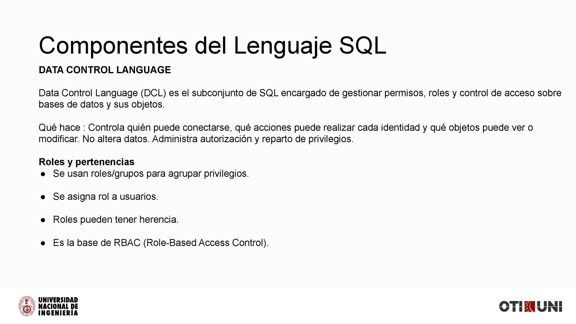 (DCL) es el subconjunto de SQL encargado de gestionar permisos, roles y control de acceso sobre bases de datos y sus objetos. Qué hace : Controla quién puede conectarse, qué acciones puede realizar cada identidad y qué objetos puede ver o modificar. No altera datos. Administra autorización y reparto de privilegios. Roles y pertenencias • Se usan roles/grupos para agrupar privilegios. • Se asigna rol a usuarios. • Roles pueden tener herencia. • Es la base de RBAC (Role-Based Access Control).