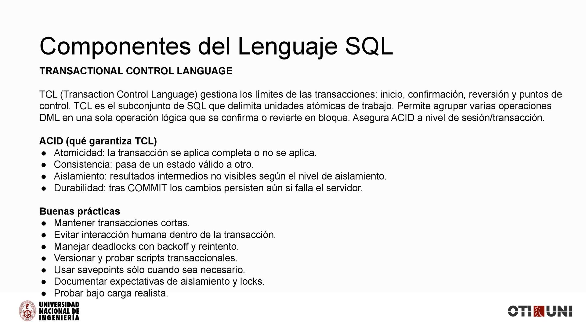 Language) gestiona los límites de las transacciones: inicio, confirmación, reversión y puntos de control. TCL es el subconjunto de SQL que delimita unidades atómicas de trabajo. Permite agrupar varias operaciones DML en una sola operación lógica que se confirma o revierte en bloque. Asegura ACID a nivel de sesión/transacción. ACID (qué garantiza TCL) • Atomicidad: la transacción se aplica completa o no se aplica. • Consistencia: pasa de un estado válido a otro. • Aislamiento: resultados intermedios no visibles según el nivel de aislamiento. • Durabilidad: tras COMMIT los cambios persisten aún si falla el servidor. Buenas prácticas • Mantener transacciones cortas. • Evitar interacción humana dentro de la transacción. • Manejar deadlocks con backoff y reintento. • Versionar y probar scripts transaccionales. • Usar savepoints sólo cuando sea necesario. • Documentar expectativas de aislamiento y locks. • Probar bajo carga realista.