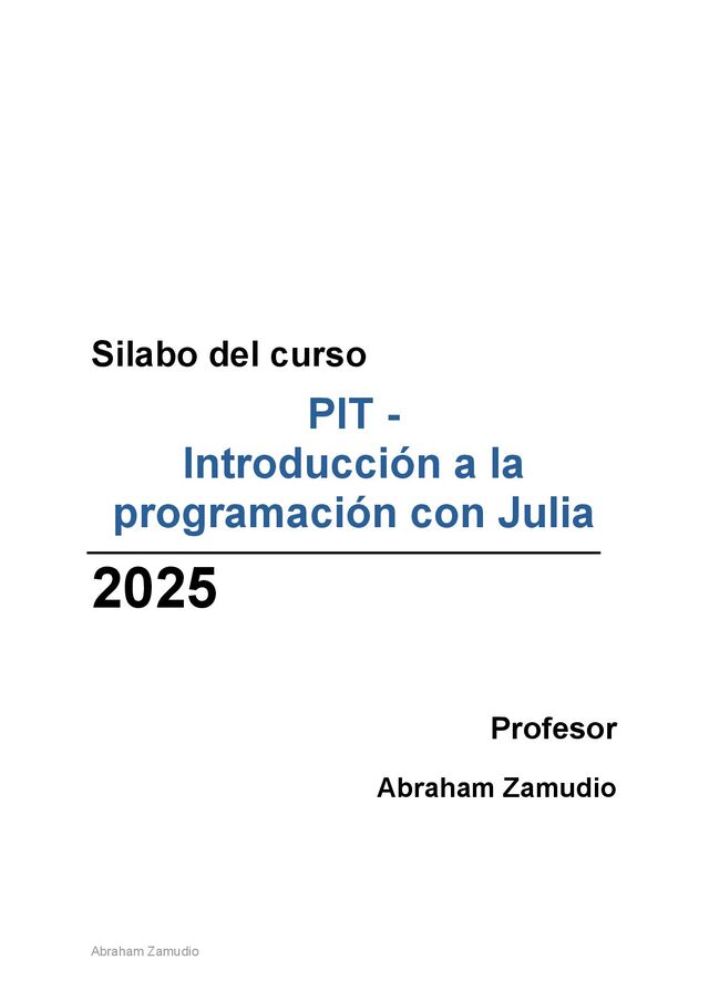 programación con Julia Horas : 16 hrs (4 hrs / clase) 2. Presentación Diseñado meticulosamente para programadores con conocimientos básicos que ya están familiarizados con los conceptos fundamentales de la lógica de programación y la sintaxis de al menos un lenguaje (como Python, R, C/C++, etc.), este curso está concebido como una expansión de sus horizontes y una inmersión guiada en el fascinante mundo de Julia. No solo aprenderán un nuevo lenguaje, sino que descubrirán una herramienta poderosa que redefine la forma en que se abordan los problemas computacionales de alta demanda. Julia no es solo otro lenguaje en la vasta constelación de herramientas de desarrollo; es una alternativa de vanguardia que combina la simplicidad y la expresividad de los lenguajes de scripting con el rendimiento vertiginoso de los lenguajes compilados. Esta característica única lo convierte en una opción ideal para la computación aplicada de alta demanda de computo, donde la velocidad es crucial para simulaciones complejas, modelos matemáticos y el procesamiento de grandes volúmenes de datos. Su diseño inherente para el análisis de datos lo posiciona como un competidor serio en el ecosistema de la ciencia de datos, permitiendo a los usuarios realizar manipulaciones, transformaciones y análisis estadísticos con una eficiencia sin precedentes. Además, su creciente ecosistema de paquetes y su enfoque en el "despacho múltiple" lo hacen increíblemente potente para el desarrollo en el campo de la inteligencia artificial, desde el aprendizaje automático hasta las redes neuronales profundas, donde la optimización del rendimiento es vital para entrenar modelos robustos y ejecutar inferencias rápidas. A lo largo de este curso intensivo de 16 horas, cuidadosamente estructuradas y distribuidas en 4 sesiones dinámicas de 4 horas cada una, los participantes no solo escucharán sobre Julia, sino que lo experimentarán de primera mano. El enfoque que le doy al curso es eminentemente práctico y progresivo, asegurando que cada concepto se construya sobre el anterior, consolidando el conocimiento a través de ejemplos del mundo real, ejercicios interactivos y pequeños proyectos que desafiarán a los estudiantes a aplicar lo aprendido de inmediato. Creo firmemente que la mejor manera de dominar un lenguaje es usándolo activamente, resolviendo problemas y experimentando con sus capacidades. Cada sesión ha sido diseñada para maximizar el aprendizaje, combinando explicaciones claras y concisas de la teoría subyacente con demostraciones en vivo y tiempo dedicado a la práctica guiada. Al finalizar este curso, los participantes no solo habrán adquirido una comprensión fundamental de la sintaxis y la semántica de Julia, sino que también habrán desarrollado la confianza para abordar problemas de programación más complejos. Están equipados con las herramientas y el conocimiento necesarios para comenzar a explorar las vastas aplicaciones de Julia en sus propios campos de interés, ya sea en la investigación académica, el desarrollo de software o el análisis de datos industriales. Este es solo el comienzo de su viaje con Julia, un viaje que promete eficiencia, potencia y una comunidad en rápido crecimiento. Abraham Zamudio