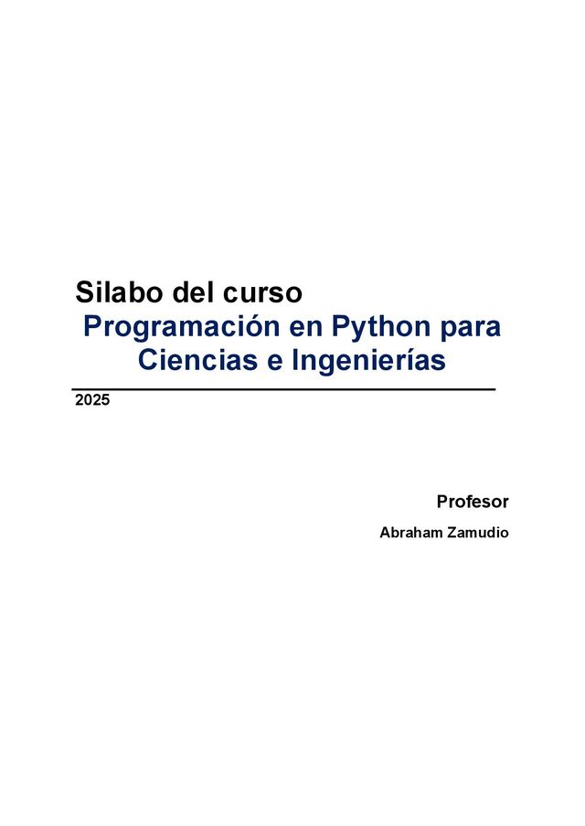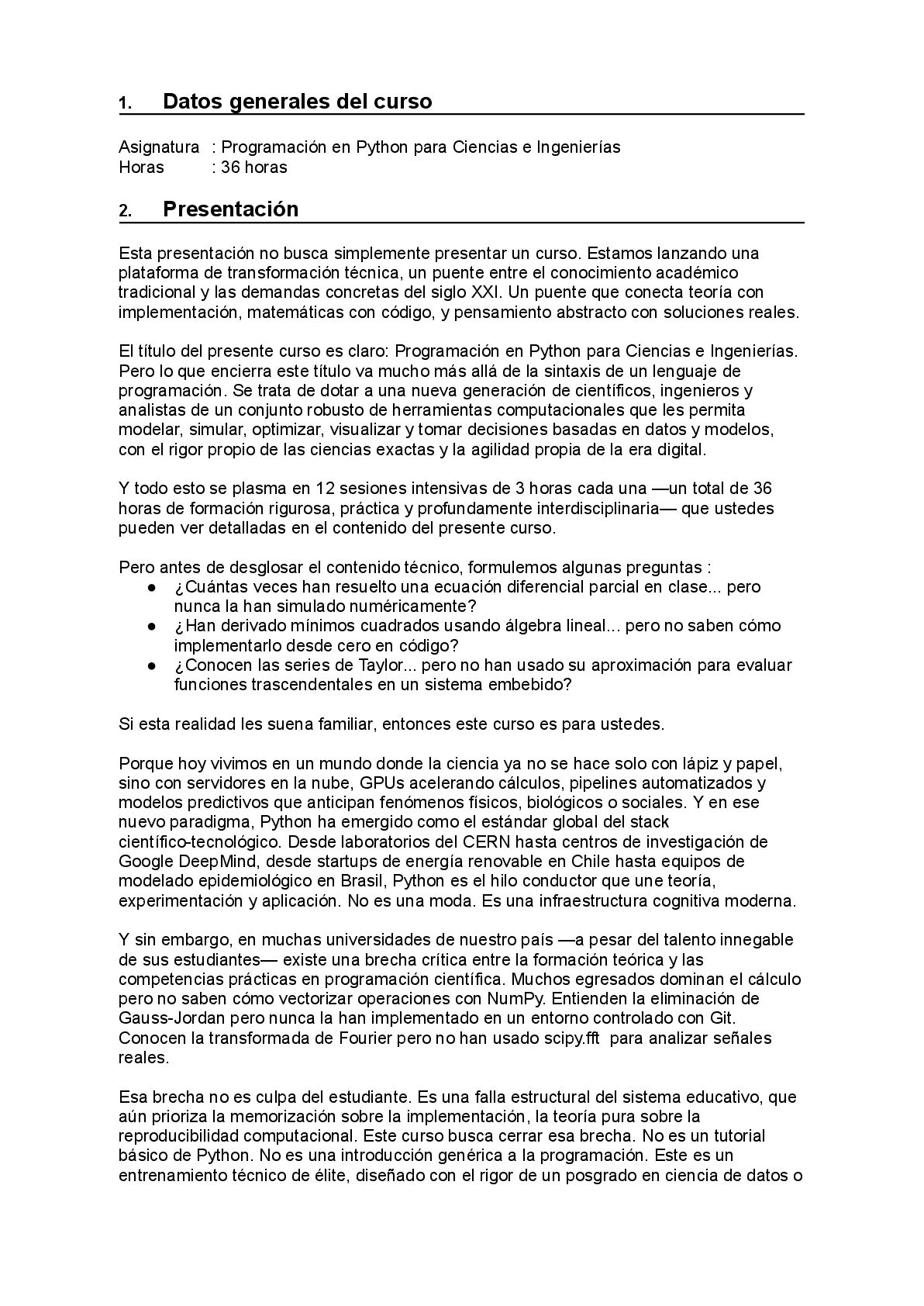 para Ciencias e Ingenierías Horas : 36 horas 2. Presentación Esta presentación no busca simplemente presentar un curso. Estamos lanzando una plataforma de transformación técnica, un puente entre el conocimiento académico tradicional y las demandas concretas del siglo XXI. Un puente que conecta teoría con implementación, matemáticas con código, y pensamiento abstracto con soluciones reales. El título del presente curso es claro: Programación en Python para Ciencias e Ingenierías. Pero lo que encierra este título va mucho más allá de la sintaxis de un lenguaje de programación. Se trata de dotar a una nueva generación de científicos, ingenieros y analistas de un conjunto robusto de herramientas computacionales que les permita modelar, simular, optimizar, visualizar y tomar decisiones basadas en datos y modelos, con el rigor propio de las ciencias exactas y la agilidad propia de la era digital. Y todo esto se plasma en 12 sesiones intensivas de 3 horas cada una —un total de 36 horas de formación rigurosa, práctica y profundamente interdisciplinaria— que ustedes pueden ver detalladas en el contenido del presente curso. Pero antes de desglosar el contenido técnico, formulemos algunas preguntas : • ¿Cuántas veces han resuelto una ecuación diferencial parcial en clase... pero nunca la han simulado numéricamente? • ¿Han derivado mínimos cuadrados usando álgebra lineal... pero no saben cómo implementarlo desde cero en código? • ¿Conocen las series de Taylor... pero no han usado su aproximación para evaluar funciones trascendentales en un sistema embebido? Si esta realidad les suena familiar, entonces este curso es para ustedes. Porque hoy vivimos en un mundo donde la ciencia ya no se hace solo con lápiz y papel, sino con servidores en la nube, GPUs acelerando cálculos, pipelines automatizados y modelos predictivos que anticipan fenómenos físicos, biológicos o sociales. Y en ese nuevo paradigma, Python ha emergido como el estándar global del stack científico-tecnológico. Desde laboratorios del CERN hasta centros de investigación de Google DeepMind, desde startups de energía renovable en Chile hasta equipos de modelado epidemiológico en Brasil, Python es el hilo conductor que une teoría, experimentación y aplicación. No es una moda. Es una infraestructura cognitiva moderna. Y sin embargo, en muchas universidades de nuestro país —a pesar del talento innegable de sus estudiantes— existe una brecha crítica entre la formación teórica y las competencias prácticas en programación científica. Muchos egresados dominan el cálculo pero no saben cómo vectorizar operaciones con NumPy. Entienden la eliminación de Gauss-Jordan pero nunca la han implementado en un entorno controlado con Git. Conocen la transformada de Fourier pero no han usado scipy.fft para analizar señales reales. Esa brecha no es culpa del estudiante. Es una falla estructural del sistema educativo, que aún prioriza la memorización sobre la implementación, la teoría pura sobre la reproducibilidad computacional. Este curso busca cerrar esa brecha. No es un tutorial básico de Python. No es una introducción genérica a la programación. Este es un entrenamiento técnico de élite, diseñado con el rigor de un posgrado en ciencia de datos o