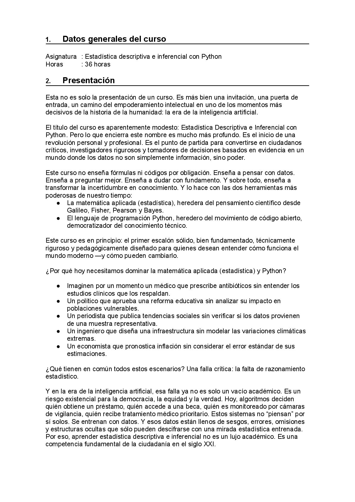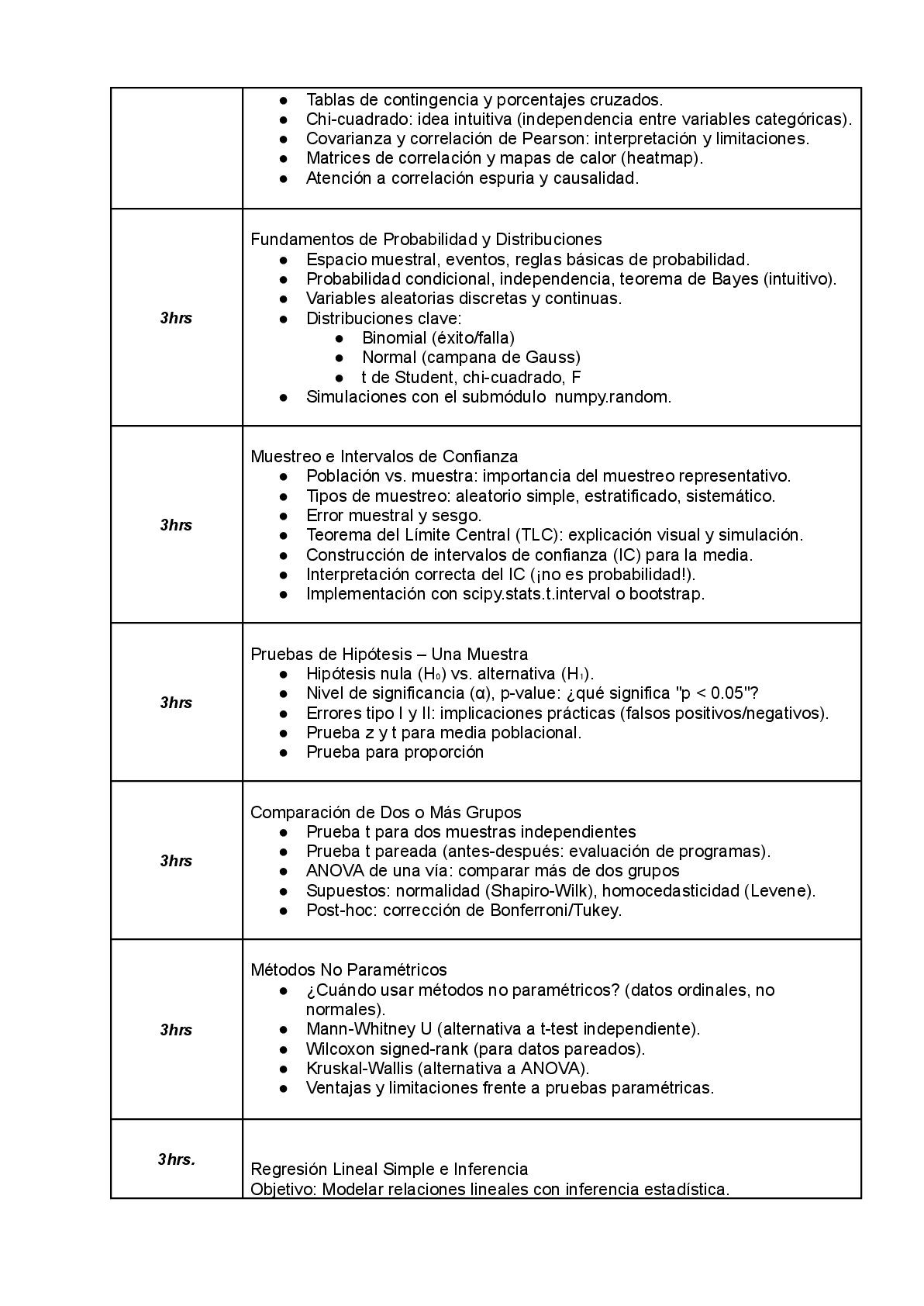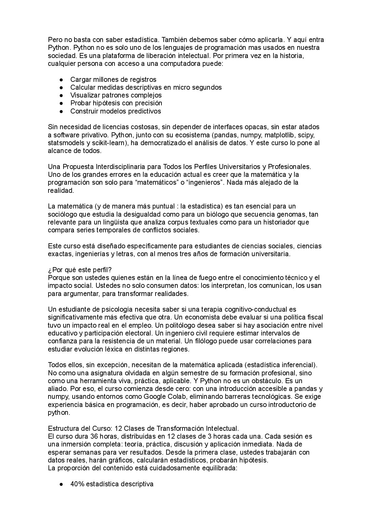 aplicarla. Y aquí entra Python. Python no es solo uno de los lenguajes de programación mas usados en nuestra sociedad. Es una plataforma de liberación intelectual. Por primera vez en la historia, cualquier persona con acceso a una computadora puede: • Cargar millones de registros • Calcular medidas descriptivas en micro segundos • Visualizar patrones complejos • Probar hipótesis con precisión • Construir modelos predictivos Sin necesidad de licencias costosas, sin depender de interfaces opacas, sin estar atados a software privativo. Python, junto con su ecosistema (pandas, numpy, matplotlib, scipy, statsmodels y scikit-learn), ha democratizado el análisis de datos. Y este curso lo pone al alcance de todos. Una Propuesta Interdisciplinaria para Todos los Perfiles Universitarios y Profesionales. Uno de los grandes errores en la educación actual es creer que la matemática y la programación son solo para “matemáticos” o “ingenieros”. Nada más alejado de la realidad. La matemática (y de manera más puntual : la estadística) es tan esencial para un sociólogo que estudia la desigualdad como para un biólogo que secuencia genomas, tan relevante para un lingüista que analiza corpus textuales como para un historiador que compara series temporales de conflictos sociales. Este curso está diseñado específicamente para estudiantes de ciencias sociales, ciencias exactas, ingenierías y letras, con al menos tres años de formación universitaria. ¿Por qué este perfil? Porque son ustedes quienes están en la línea de fuego entre el conocimiento técnico y el impacto social. Ustedes no solo consumen datos: los interpretan, los comunican, los usan para argumentar, para transformar realidades. Un estudiante de psicología necesita saber si una terapia cognitivo-conductual es significativamente más efectiva que otra. Un economista debe evaluar si una política fiscal tuvo un impacto real en el empleo. Un politólogo desea saber si hay asociación entre nivel educativo y participación electoral. Un ingeniero civil requiere estimar intervalos de confianza para la resistencia de un material. Un filólogo puede usar correlaciones para estudiar evolución léxica en distintas regiones. Todos ellos, sin excepción, necesitan de la matemática aplicada (estadística inferencial). No como una asignatura olvidada en algún semestre de su formación profesional, sino como una herramienta viva, práctica, aplicable. Y Python no es un obstáculo. Es un aliado. Por eso, el curso comienza desde cero: con una introducción accesible a pandas y numpy, usando entornos como Google Colab, eliminando barreras tecnológicas. Se exige experiencia básica en programación, es decir, haber aprobado un curso introductorio de python. Estructura del Curso: 12 Clases de Transformación Intelectual. El curso dura 36 horas, distribuidas en 12 clases de 3 horas cada una. Cada sesión es una inmersión completa: teoría, práctica, discusión y aplicación inmediata. Nada de esperar semanas para ver resultados. Desde la primera clase, ustedes trabajarán con datos reales, harán gráficos, calcularán estadísticos, probarán hipótesis. La proporción del contenido está cuidadosamente equilibrada: • 40% estadística descriptiva