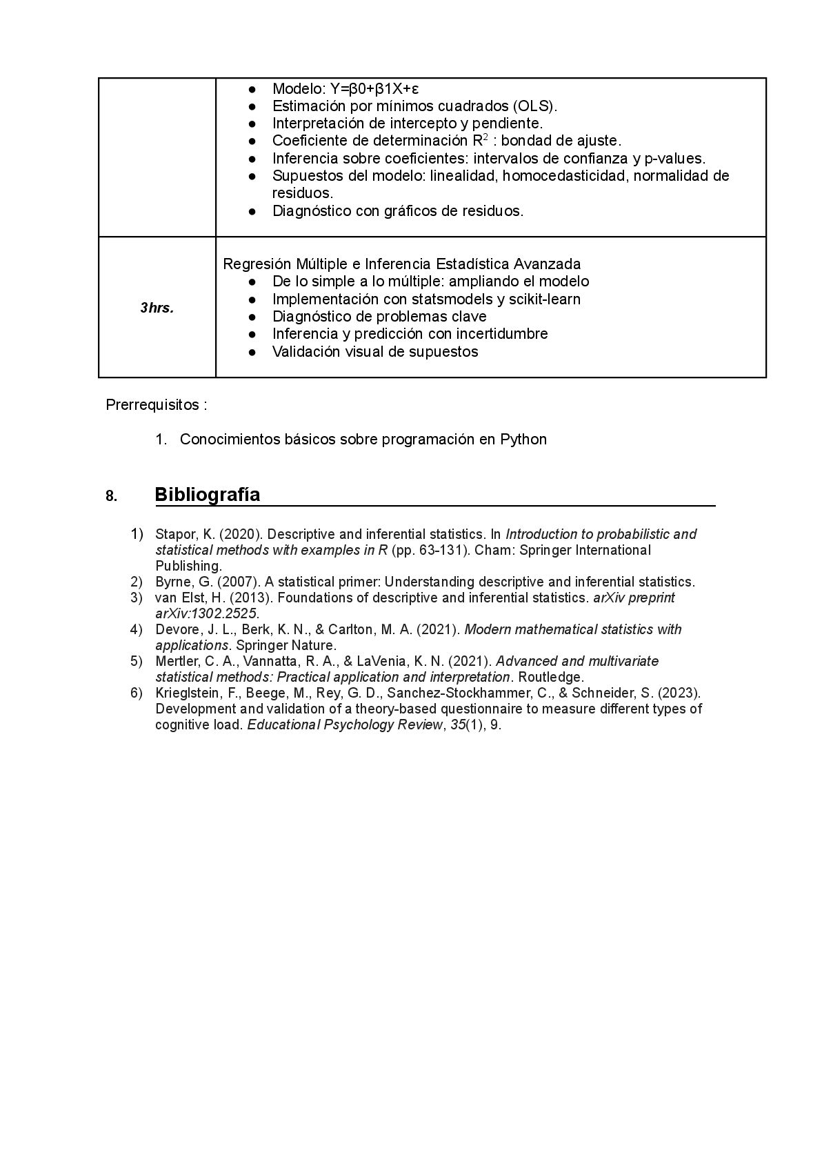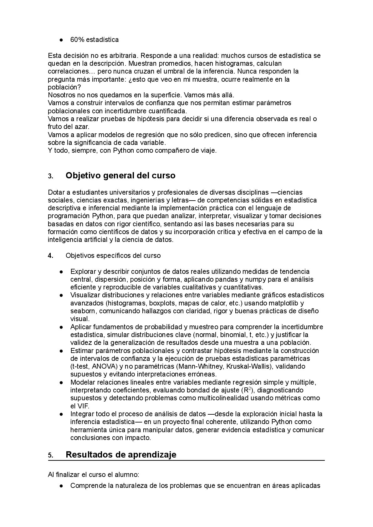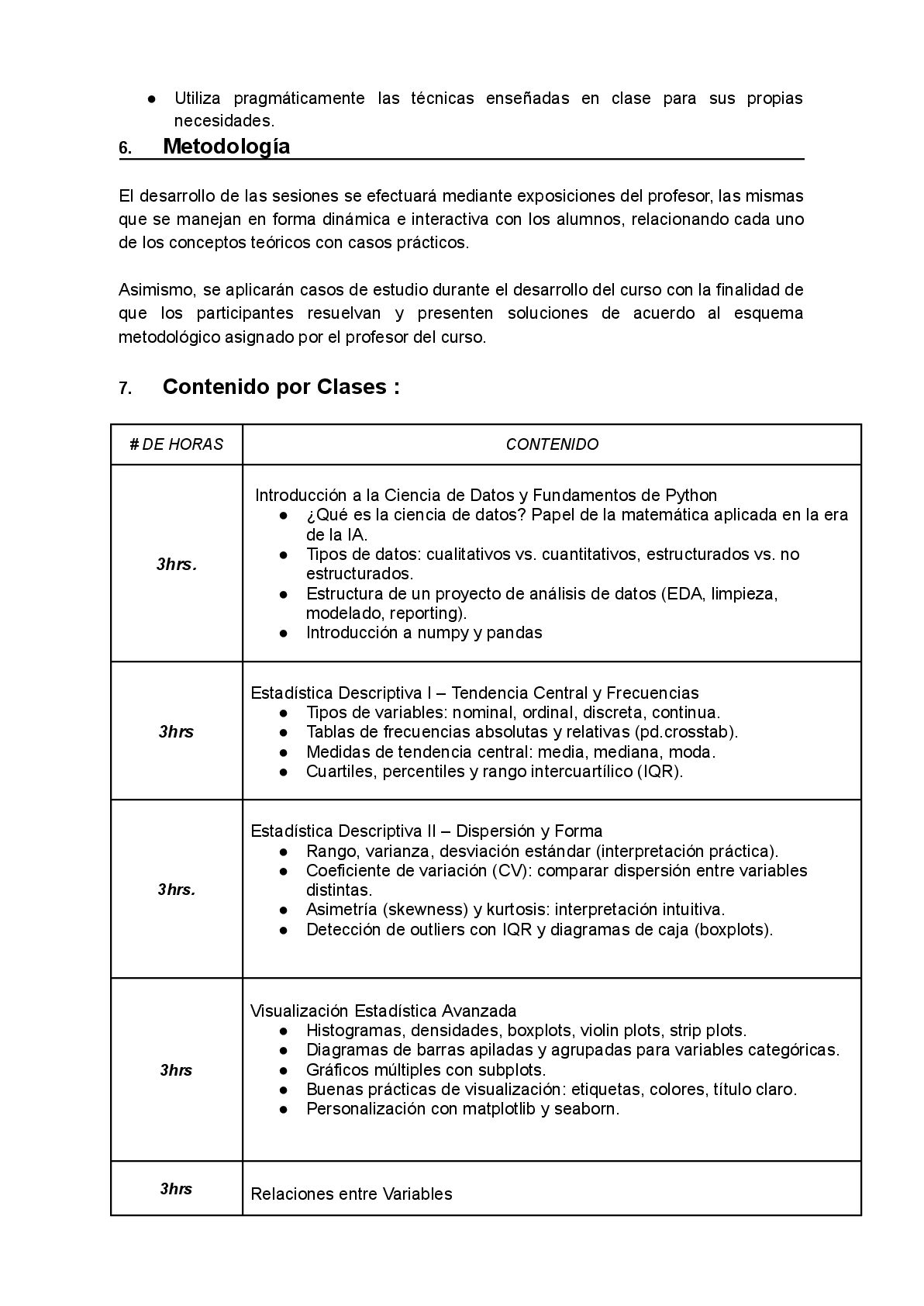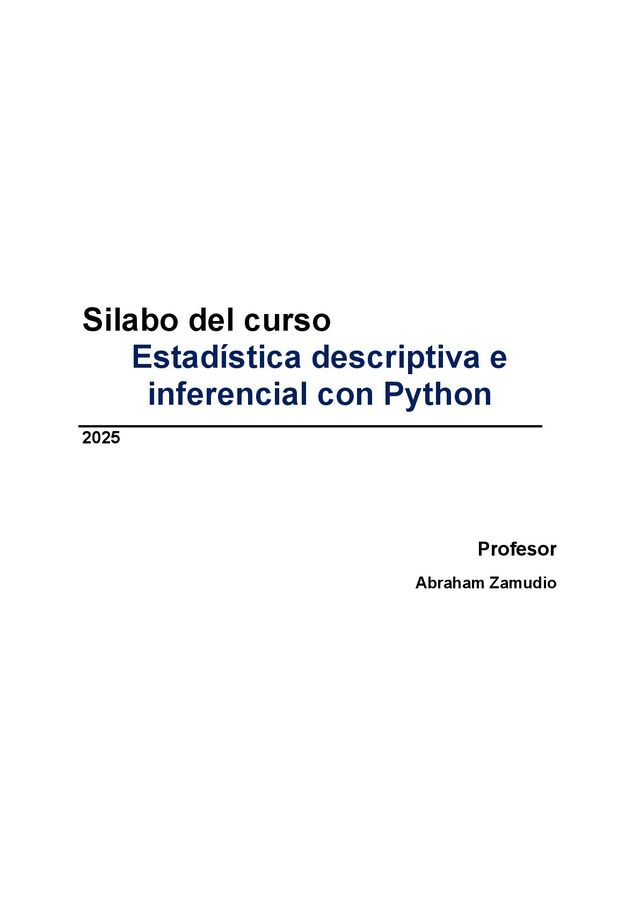 aplicarla. Y aquí entra Python. Python no es solo uno de los lenguajes de programación mas usados en nuestra sociedad. Es una plataforma de liberación intelectual. Por primera vez en la historia, cualquier persona con acceso a una computadora puede: • Cargar millones de registros • Calcular medidas descriptivas en micro segundos • Visualizar patrones complejos • Probar hipótesis con precisión • Construir modelos predictivos Sin necesidad de licencias costosas, sin depender de interfaces opacas, sin estar atados a software privativo. Python, junto con su ecosistema (pandas, numpy, matplotlib, scipy, statsmodels y scikit-learn), ha democratizado el análisis de datos. Y este curso lo pone al alcance de todos. Una Propuesta Interdisciplinaria para Todos los Perfiles Universitarios y Profesionales. Uno de los grandes errores en la educación actual es creer que la matemática y la programación son solo para “matemáticos” o “ingenieros”. Nada más alejado de la realidad. La matemática (y de manera más puntual : la estadística) es tan esencial para un sociólogo que estudia la desigualdad como para un biólogo que secuencia genomas, tan relevante para un lingüista que analiza corpus textuales como para un historiador que compara series temporales de conflictos sociales. Este curso está diseñado específicamente para estudiantes de ciencias sociales, ciencias exactas, ingenierías y letras, con al menos tres años de formación universitaria. ¿Por qué este perfil? Porque son ustedes quienes están en la línea de fuego entre el conocimiento técnico y el impacto social. Ustedes no solo consumen datos: los interpretan, los comunican, los usan para argumentar, para transformar realidades. Un estudiante de psicología necesita saber si una terapia cognitivo-conductual es significativamente más efectiva que otra. Un economista debe evaluar si una política fiscal tuvo un impacto real en el empleo. Un politólogo desea saber si hay asociación entre nivel educativo y participación electoral. Un ingeniero civil requiere estimar intervalos de confianza para la resistencia de un material. Un filólogo puede usar correlaciones para estudiar evolución léxica en distintas regiones. Todos ellos, sin excepción, necesitan de la matemática aplicada (estadística inferencial). No como una asignatura olvidada en algún semestre de su formación profesional, sino como una herramienta viva, práctica, aplicable. Y Python no es un obstáculo. Es un aliado. Por eso, el curso comienza desde cero: con una introducción accesible a pandas y numpy, usando entornos como Google Colab, eliminando barreras tecnológicas. Se exige experiencia básica en programación, es decir, haber aprobado un curso introductorio de python. Estructura del Curso: 12 Clases de Transformación Intelectual. El curso dura 36 horas, distribuidas en 12 clases de 3 horas cada una. Cada sesión es una inmersión completa: teoría, práctica, discusión y aplicación inmediata. Nada de esperar semanas para ver resultados. Desde la primera clase, ustedes trabajarán con datos reales, harán gráficos, calcularán estadísticos, probarán hipótesis. La proporción del contenido está cuidadosamente equilibrada: • 40% estadística descriptiva