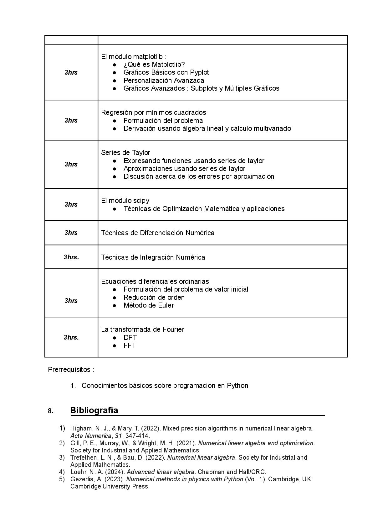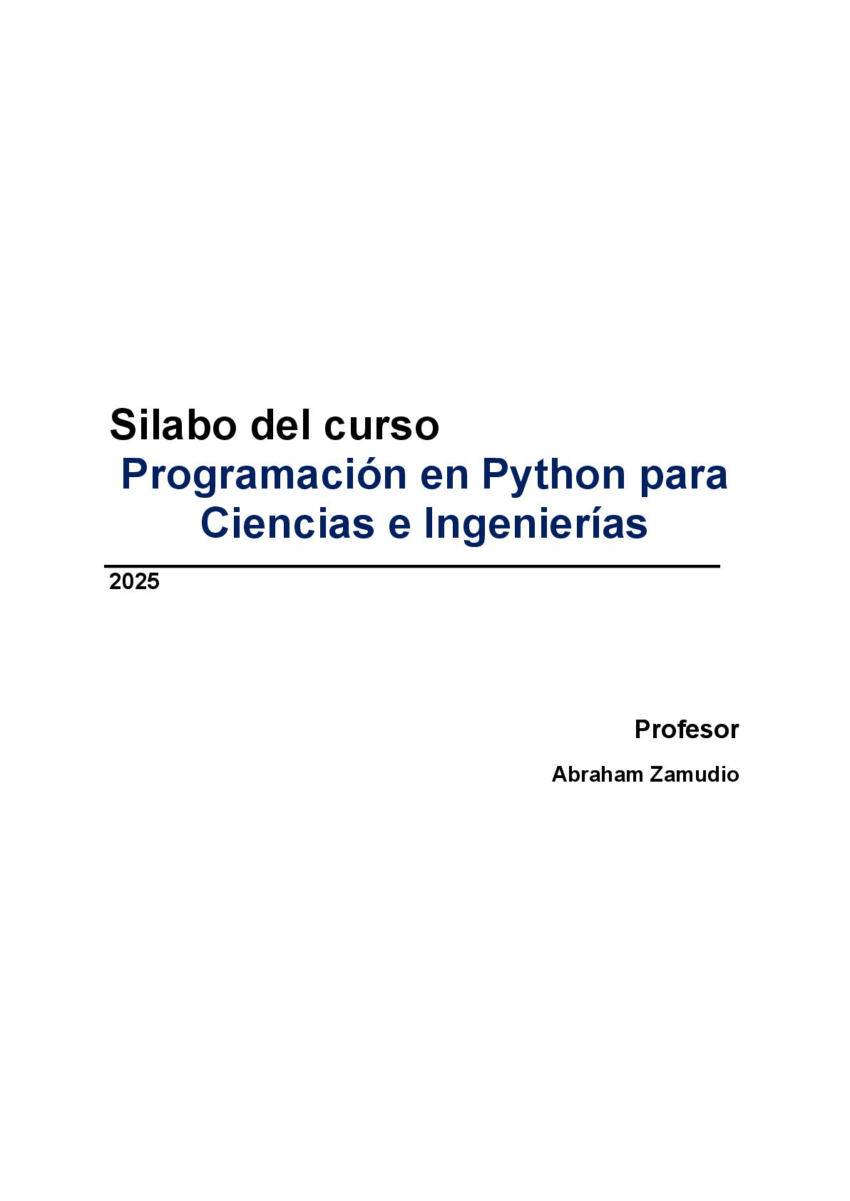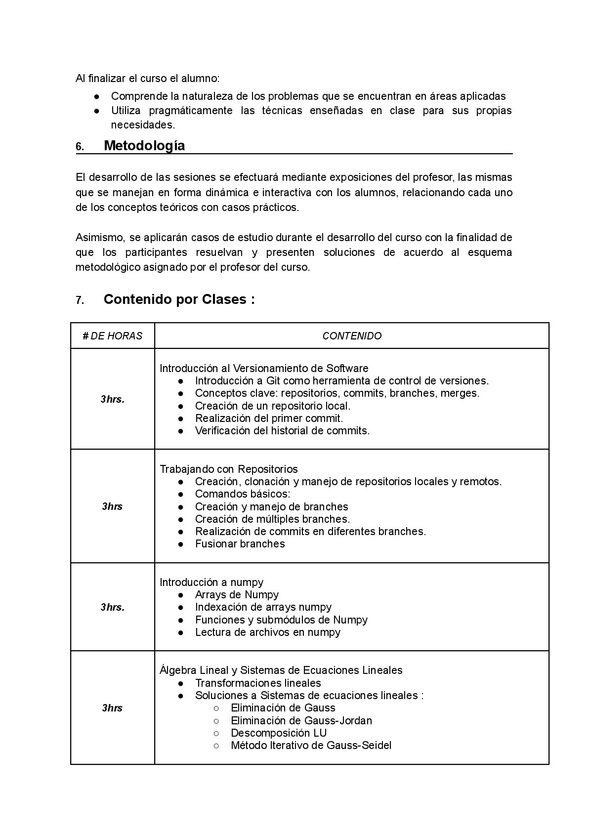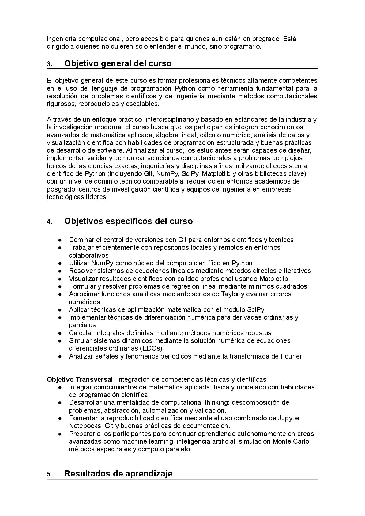 para Ciencias e Ingenierías Horas : 36 horas 2. Presentación Esta presentación no busca simplemente presentar un curso. Estamos lanzando una plataforma de transformación técnica, un puente entre el conocimiento académico tradicional y las demandas concretas del siglo XXI. Un puente que conecta teoría con implementación, matemáticas con código, y pensamiento abstracto con soluciones reales. El título del presente curso es claro: Programación en Python para Ciencias e Ingenierías. Pero lo que encierra este título va mucho más allá de la sintaxis de un lenguaje de programación. Se trata de dotar a una nueva generación de científicos, ingenieros y analistas de un conjunto robusto de herramientas computacionales que les permita modelar, simular, optimizar, visualizar y tomar decisiones basadas en datos y modelos, con el rigor propio de las ciencias exactas y la agilidad propia de la era digital. Y todo esto se plasma en 12 sesiones intensivas de 3 horas cada una —un total de 36 horas de formación rigurosa, práctica y profundamente interdisciplinaria— que ustedes pueden ver detalladas en el contenido del presente curso. Pero antes de desglosar el contenido técnico, formulemos algunas preguntas : • ¿Cuántas veces han resuelto una ecuación diferencial parcial en clase... pero nunca la han simulado numéricamente? • ¿Han derivado mínimos cuadrados usando álgebra lineal... pero no saben cómo implementarlo desde cero en código? • ¿Conocen las series de Taylor... pero no han usado su aproximación para evaluar funciones trascendentales en un sistema embebido? Si esta realidad les suena familiar, entonces este curso es para ustedes. Porque hoy vivimos en un mundo donde la ciencia ya no se hace solo con lápiz y papel, sino con servidores en la nube, GPUs acelerando cálculos, pipelines automatizados y modelos predictivos que anticipan fenómenos físicos, biológicos o sociales. Y en ese nuevo paradigma, Python ha emergido como el estándar global del stack científico-tecnológico. Desde laboratorios del CERN hasta centros de investigación de Google DeepMind, desde startups de energía renovable en Chile hasta equipos de modelado epidemiológico en Brasil, Python es el hilo conductor que une teoría, experimentación y aplicación. No es una moda. Es una infraestructura cognitiva moderna. Y sin embargo, en muchas universidades de nuestro país —a pesar del talento innegable de sus estudiantes— existe una brecha crítica entre la formación teórica y las competencias prácticas en programación científica. Muchos egresados dominan el cálculo pero no saben cómo vectorizar operaciones con NumPy. Entienden la eliminación de Gauss-Jordan pero nunca la han implementado en un entorno controlado con Git. Conocen la transformada de Fourier pero no han usado scipy.fft para analizar señales reales. Esa brecha no es culpa del estudiante. Es una falla estructural del sistema educativo, que aún prioriza la memorización sobre la implementación, la teoría pura sobre la reproducibilidad computacional. Este curso busca cerrar esa brecha. No es un tutorial básico de Python. No es una introducción genérica a la programación. Este es un entrenamiento técnico de élite, diseñado con el rigor de un posgrado en ciencia de datos o