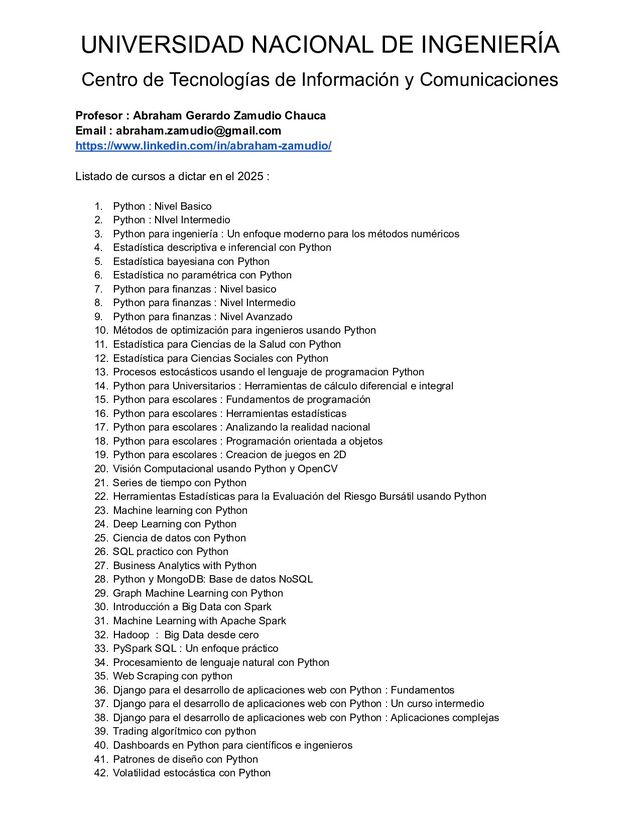 [email protected] https://www.linkedin.com/in/abraham-zamudio/ Listado de cursos a dictar en el 2025 : 1. Python : Nivel Basico 2. Python : NIvel Intermedio 3. Python para ingeniería : Un enfoque moderno para los métodos numéricos 4. Estadística descriptiva e inferencial con Python 5. Estadística bayesiana con Python 6. Estadística no paramétrica con Python 7. Python para finanzas : Nivel basico 8. Python para finanzas : Nivel Intermedio 9. Python para finanzas : Nivel Avanzado 10. Métodos de optimización para ingenieros usando Python 11. Estadística para Ciencias de la Salud con Python 12. Estadística para Ciencias Sociales con Python 13. Procesos estocásticos usando el lenguaje de programacion Python 14. Python para Universitarios : Herramientas de cálculo diferencial e integral 15. Python para escolares : Fundamentos de programación 16. Python para escolares : Herramientas estadísticas 17. Python para escolares : Analizando la realidad nacional 18. Python para escolares : Programación orientada a objetos 19. Python para escolares : Creacion de juegos en 2D 20. Visión Computacional usando Python y OpenCV 21. Series de tiempo con Python 22. Herramientas Estadísticas para la Evaluación del Riesgo Bursátil usando Python 23. Machine learning con Python 24. Deep Learning con Python 25. Ciencia de datos con Python 26. SQL practico con Python 27. Business Analytics with Python 28. Python y MongoDB: Base de datos NoSQL 29. Graph Machine Learning con Python 30. Introducción a Big Data con Spark 31. Machine Learning with Apache Spark 32. Hadoop : Big Data desde cero 33. PySpark SQL : Un enfoque práctico 34. Procesamiento de lenguaje natural con Python 35. Web Scraping con python 36. Django para el desarrollo de aplicaciones web con Python : Fundamentos 37. Django para el desarrollo de aplicaciones web con Python : Un curso intermedio 38. Django para el desarrollo de aplicaciones web con Python : Aplicaciones complejas 39. Trading algorítmico con python 40. Dashboards en Python para científicos e ingenieros 41. Patrones de diseño con Python 42. Volatilidad estocástica con Python