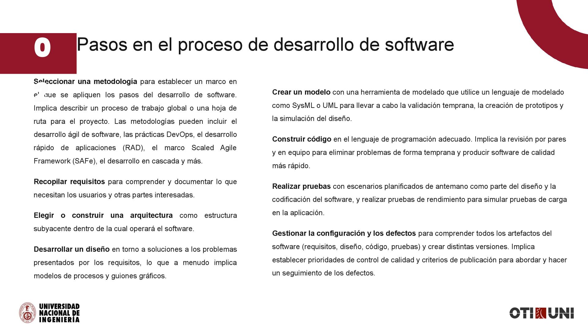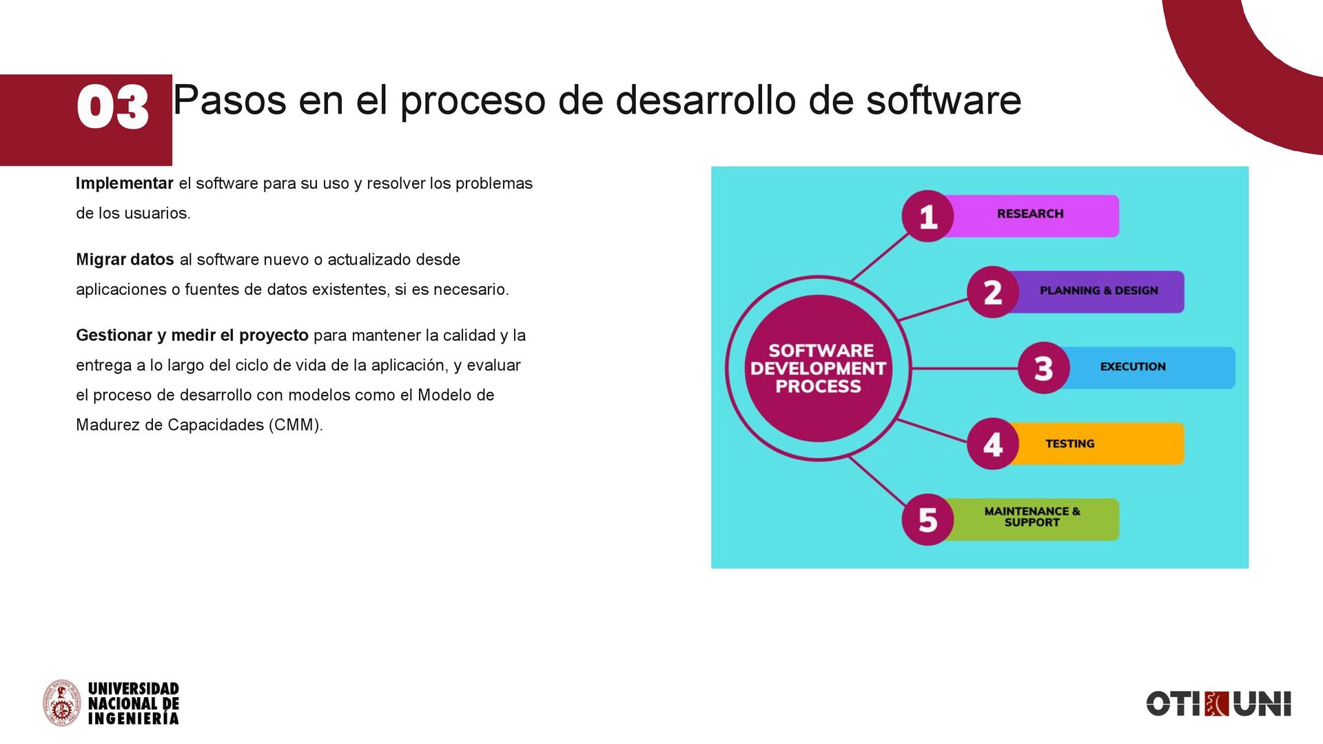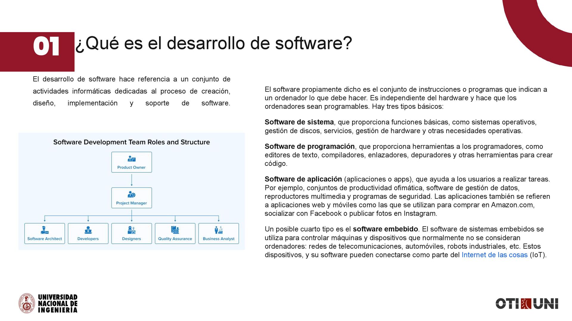 actividades informáticas dedicadas al proceso de creación, diseño, implementación y soporte de software. ¿Qué es el desarrollo de software? 01 El software propiamente dicho es el conjunto de instrucciones o programas que indican a un ordenador lo que debe hacer. Es independiente del hardware y hace que los ordenadores sean programables. Hay tres tipos básicos: Software de sistema, que proporciona funciones básicas, como sistemas operativos, gestión de discos, servicios, gestión de hardware y otras necesidades operativas. Software de programación, que proporciona herramientas a los programadores, como editores de texto, compiladores, enlazadores, depuradores y otras herramientas para crear código. Software de aplicación (aplicaciones o apps), que ayuda a los usuarios a realizar tareas. Por ejemplo, conjuntos de productividad ofimática, software de gestión de datos, reproductores multimedia y programas de seguridad. Las aplicaciones también se refieren a aplicaciones web y móviles como las que se utilizan para comprar en Amazon.com, socializar con Facebook o publicar fotos en Instagram. Un posible cuarto tipo es el software embebido. El software de sistemas embebidos se utiliza para controlar máquinas y dispositivos que normalmente no se consideran ordenadores: redes de telecomunicaciones, automóviles, robots industriales, etc. Estos dispositivos, y su software pueden conectarse como parte del Internet de las cosas (IoT).