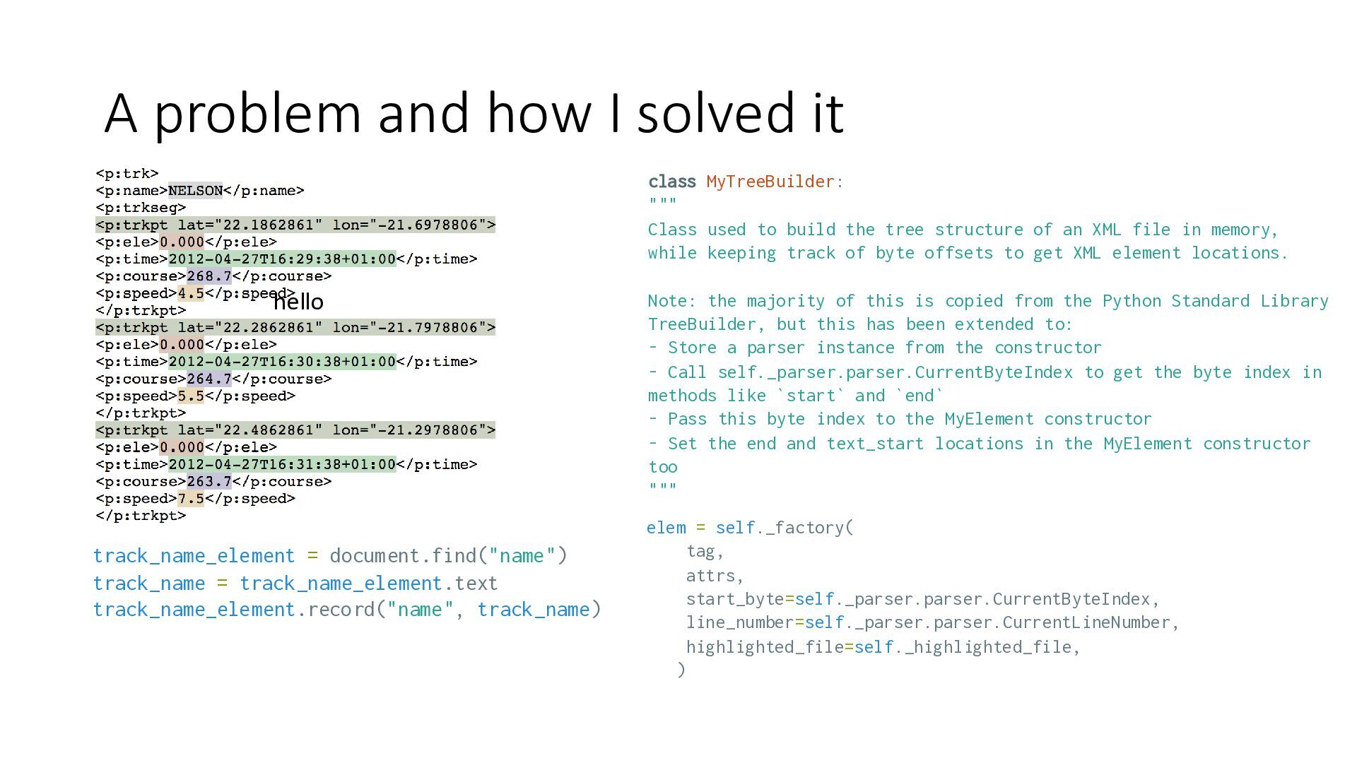 track_name = track_name_element.text track_name_element.record("name", track_name) class MyTreeBuilder: """ Class used to build the tree structure of an XML file in memory, while keeping track of byte offsets to get XML element locations. Note: the majority of this is copied from the Python Standard Library TreeBuilder, but this has been extended to: - Store a parser instance from the constructor - Call self._parser.parser.CurrentByteIndex to get the byte index in methods like `start` and `end` - Pass this byte index to the MyElement constructor - Set the end and text_start locations in the MyElement constructor too """ elem = self._factory( tag, attrs, start_byte=self._parser.parser.CurrentByteIndex, line_number=self._parser.parser.CurrentLineNumber, highlighted_file=self._highlighted_file, ) hello