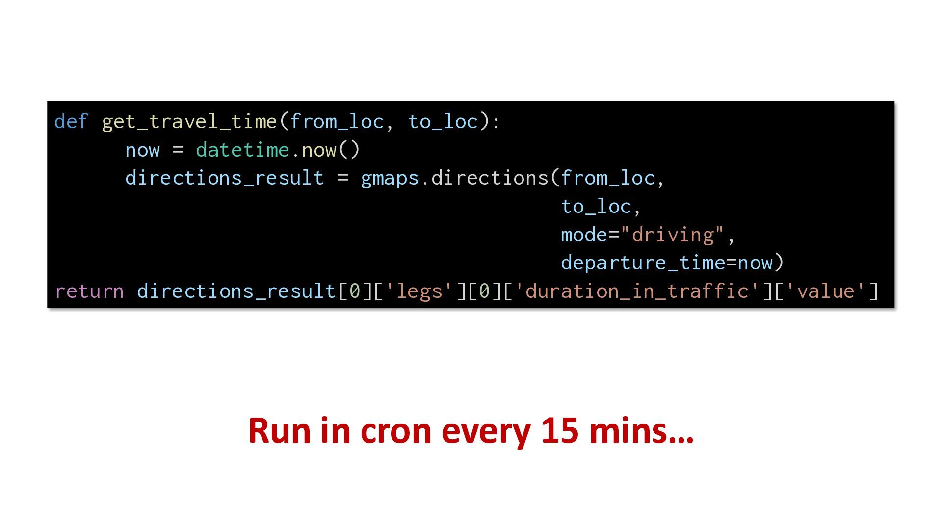 mode="driving", departure_time=now) return directions_result[0]['legs'][0]['duration_in_traffic']['value'] Run in cron every 15 mins…