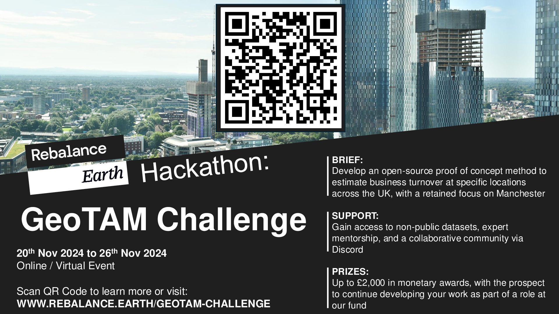 Event Scan QR Code to learn more or visit: WWW.REBALANCE.EARTH/GEOTAM-CHALLENGE BRIEF: Develop an open-source proof of concept method to estimate business turnover at specific locations across the UK, with a retained focus on Manchester SUPPORT: Gain access to non-public datasets, expert mentorship, and a collaborative community via Discord PRIZES: Up to £2,000 in monetary awards, with the prospect to continue developing your work as part of a role at our fund GeoTAM Challenge