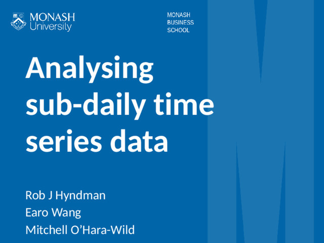 year of data, it is hard to see the interesting features. R classes The ts, zoo, xts and other time series classes do not work well with sub-daily data. Newer packages (timetk and tibbletime) do not play nicely with modelling functions. Forecasting Most time series modelling frameworks handle sub-daily data poorly. Available models include tbats and prophet, but they have limitations. 10