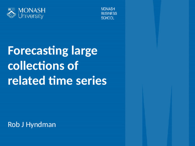 on using an automa c forecas ng algorithm (e.g., ets, auto.arima, ...) 2 Reconcile the resul ng forecasts so they add up correctly using least squares op miza on (i.e., find closest reconciled forecasts to the original forecasts). 3 This is all available in the hts package in R. Forecas ng large collec ons of related me series Hierarchical and grouped me series 8
