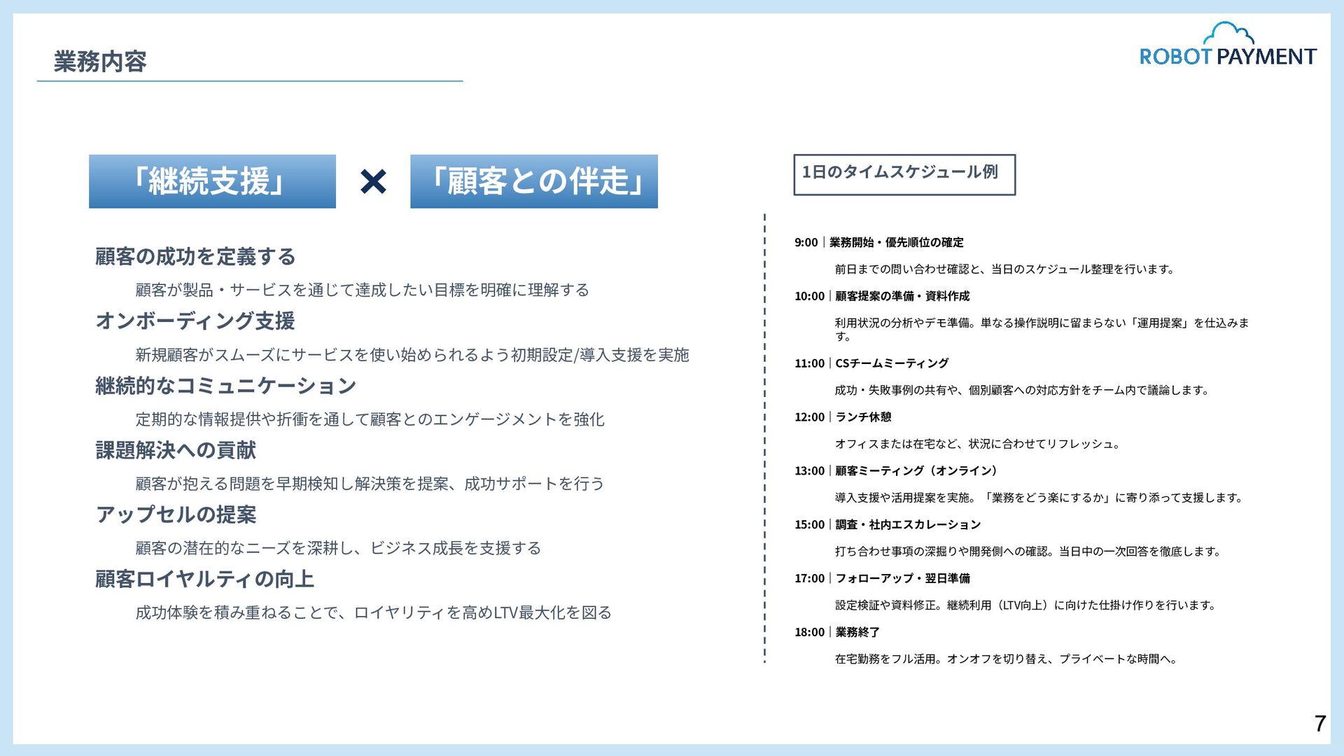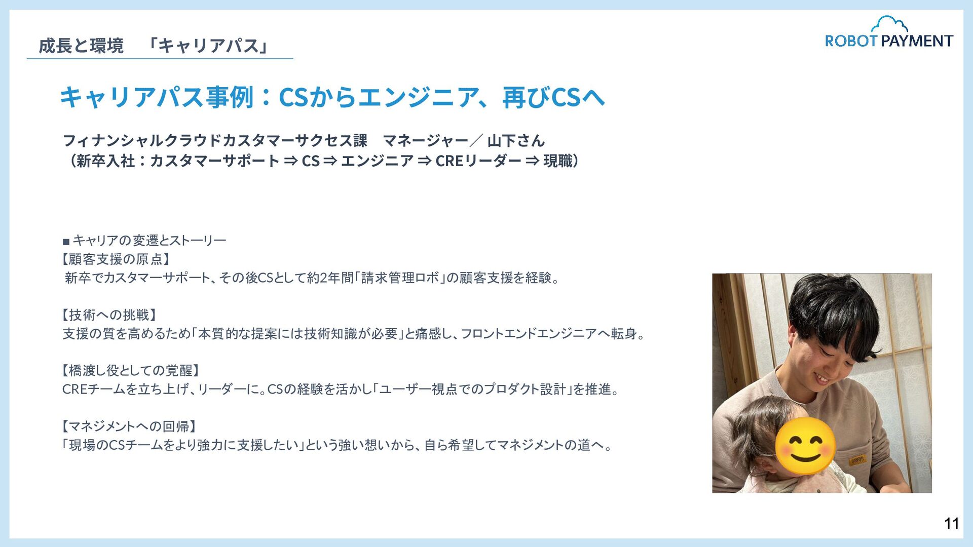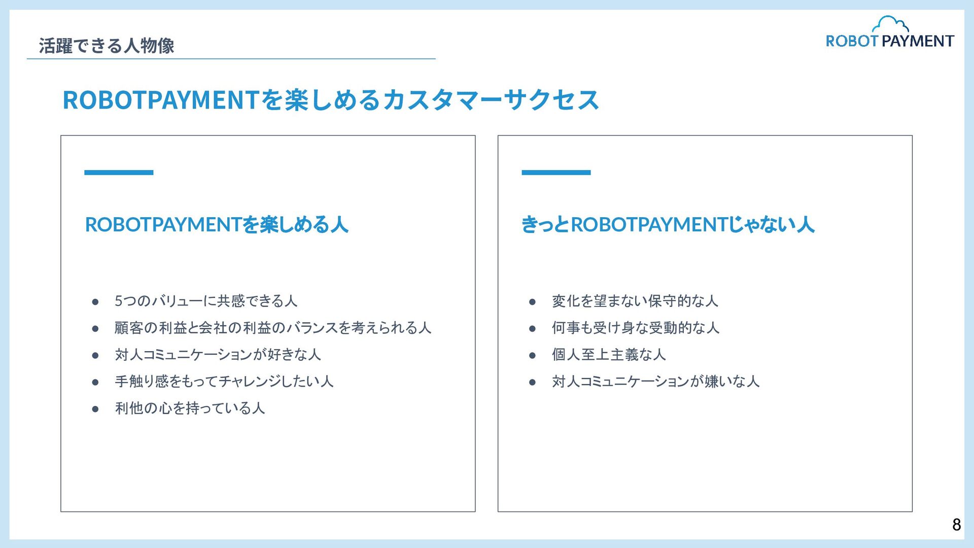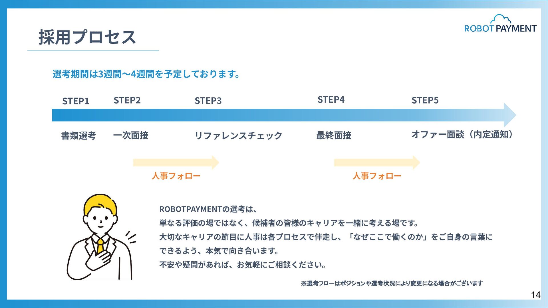 オファー⾯談(内定通知) 採⽤責任者メッセージ 05. 採 用 情 報 ⼀次⾯接 書類選考 最終⾯接 オファー⾯談(内定通知) HRBP 本部⻑ 上村 岳⽣ 私たちはいま、複数の新規事業の⽴ち上げをはじめとする⼤きな変⾰期にあります。 事業も組織も進化の途上にあり、挑戦の連続です。 求めているのは、変化を前向きに楽しめる⼈、そして⾃ら変化を⽣み出せる⼈です。 とはいえ、どれほど優秀であっても、ひとりで越えられる壁には限界があります。 だからこそ私たちは「仲間を⼤切にする」ことを何より重視しています。 仲間を⼤切にするとは、単なる⼼地良さを選んだ協調や同調ではなく、 意⾒の違いや不安も真正⾯から向き合い、それを認める姿勢を意味します。 その実践として掲げているのが「本⾳でコミュニケーションする」というVALUEです。 ⽿ざわりの良い⾔葉ではなく、率直な対話こそが組織の強さを⽣むと信じてるからです。 選考も同じ姿勢で臨みます。評価する‧される関係ではなく、 互いに本⾳で向き合い、未来を共に考えられる時間にできれば幸いです。 13