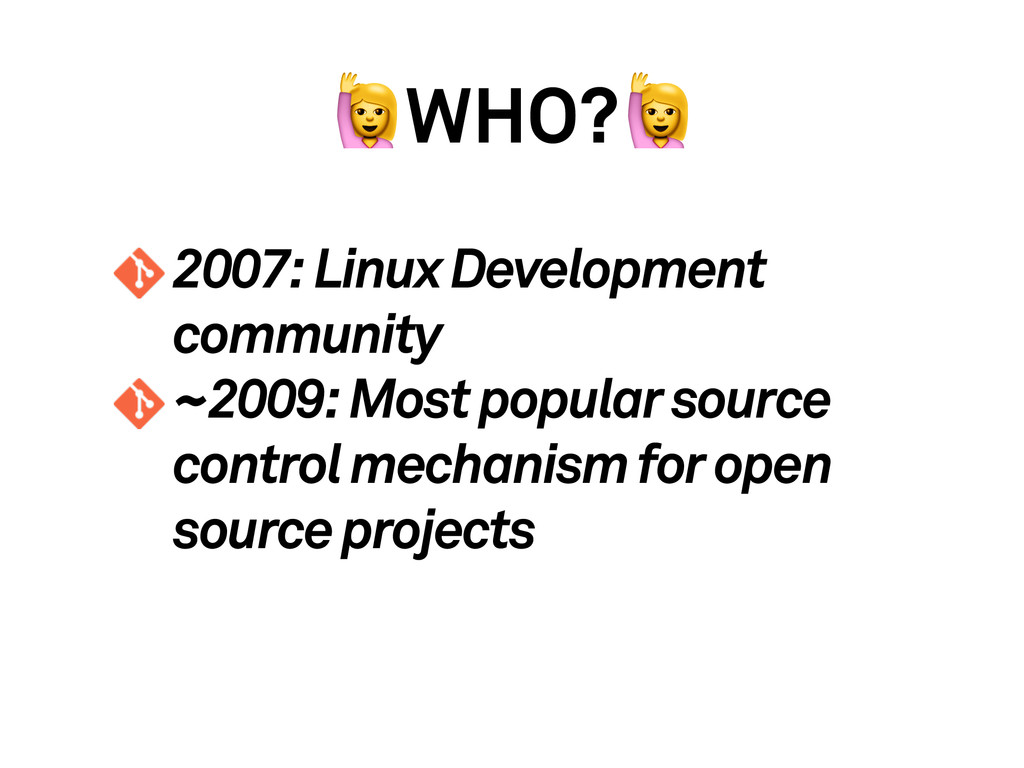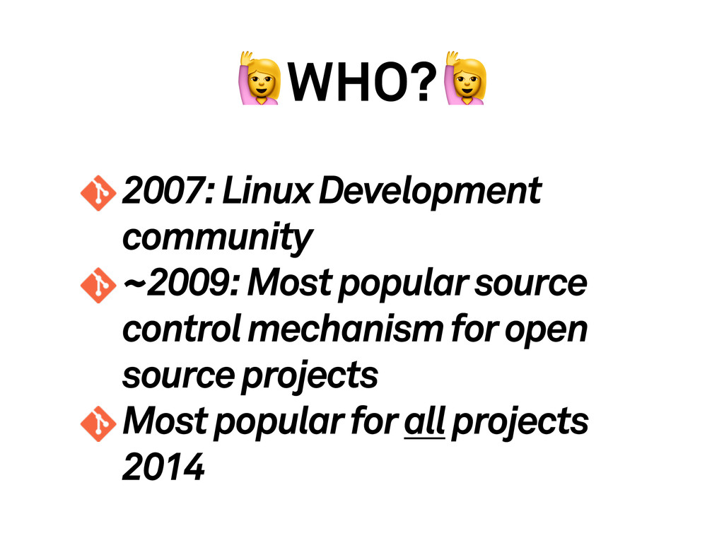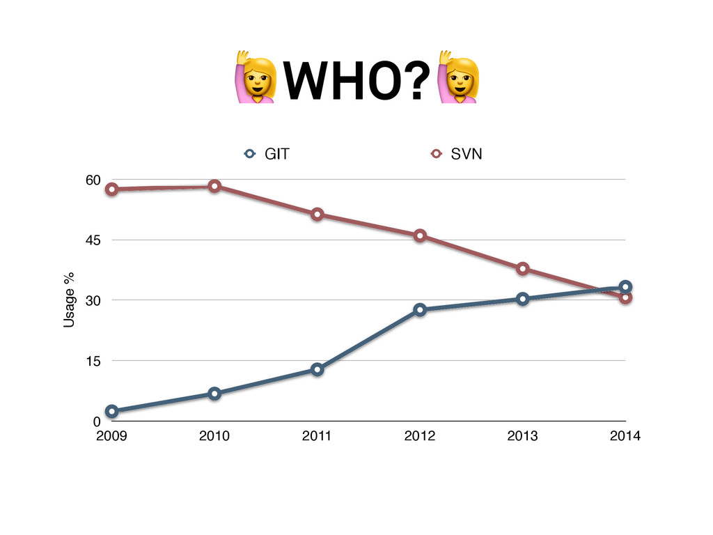 2011 2012 2013 2014 GIT SVN Based on The Eclipse Community Survey, 2009 — 2014 Source: http://programmers.stackexchange.com/questions/136079/are-there-any-statistics-that-show- the-popularity-of-git-versus-svn