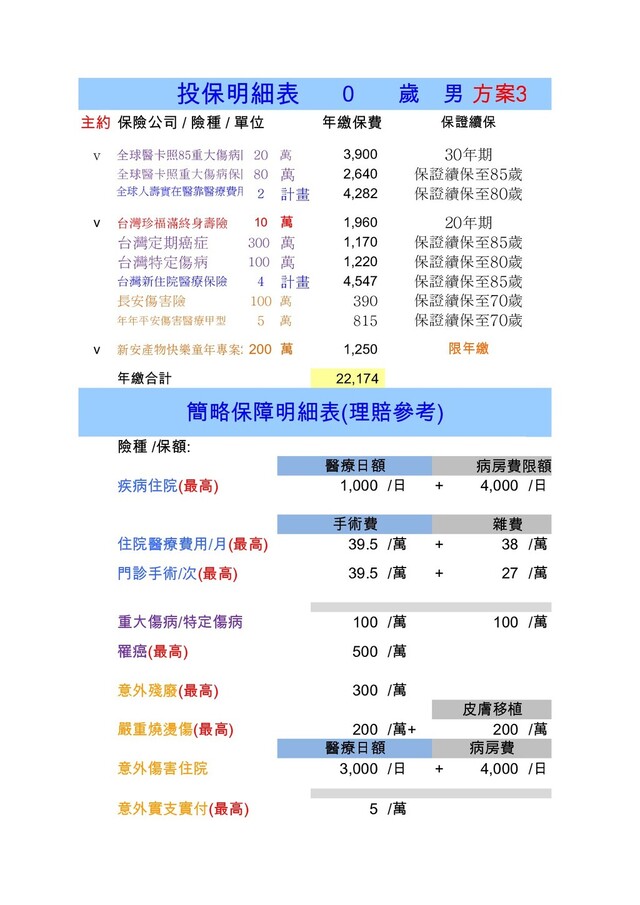 3,900 全球醫卡照重大傷病保險80 萬 2,640 全球人壽實在醫靠醫療費用 2 計畫 4,282 v 台灣珍福滿終身壽險 10 萬 1,960 台灣定期癌症 300 萬 1,170 台灣特定傷病 100 萬 1,220 台灣新住院醫療保險 4 計畫 4,547 長安傷害險 100 萬 390 年年平安傷害醫療甲型 5 萬 815 v 新安產物快樂童年專案2 200 萬 1,250 年繳合計 22,174 險種 /保額: 病房費限額 疾病住院(最高) 1,000 /日 + 4,000 /日 雜費 住院醫療費用/月(最高) 39.5 /萬 + 38 /萬 門診手術/次(最高) 39.5 /萬 + 27 /萬 重大傷病/特定傷病 100 /萬 100 /萬 罹癌(最高) 500 /萬 意外殘廢(最高) 300 /萬 嚴重燒燙傷(最高) 200 /萬+ 200 /萬 意外傷害住院 3,000 /日 + 4,000 /日 意外實支實付(最高) 5 /萬 投保明細表 0 歲 男 方案3 保證續保至70歲 保證續保 30年期 保證續保至85歲 保證續保至80歲 20年期 醫療日額 病房費 醫療日額 手術費 皮膚移植 限年繳 簡略保障明細表(理賠參考) 保證續保至85歲 保證續保至80歲 保證續保至85歲 保證續保至70歲
