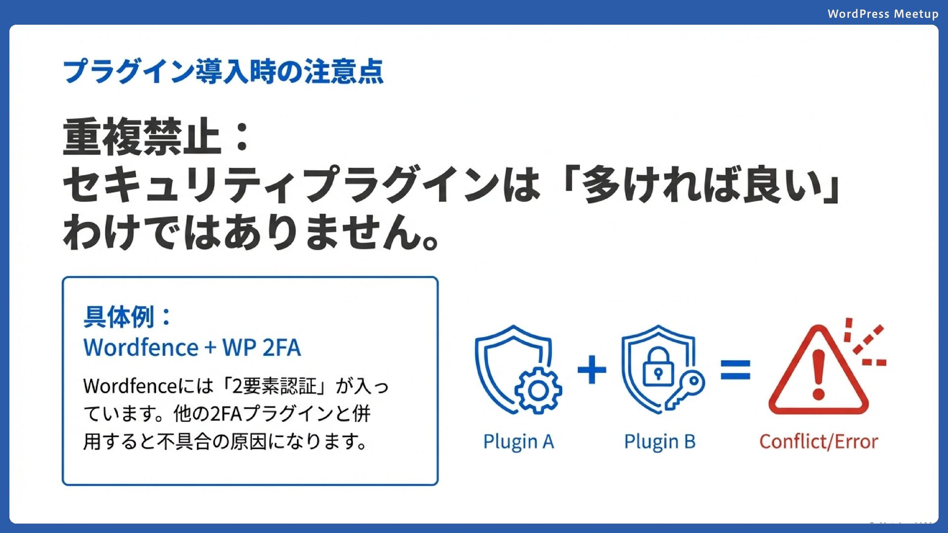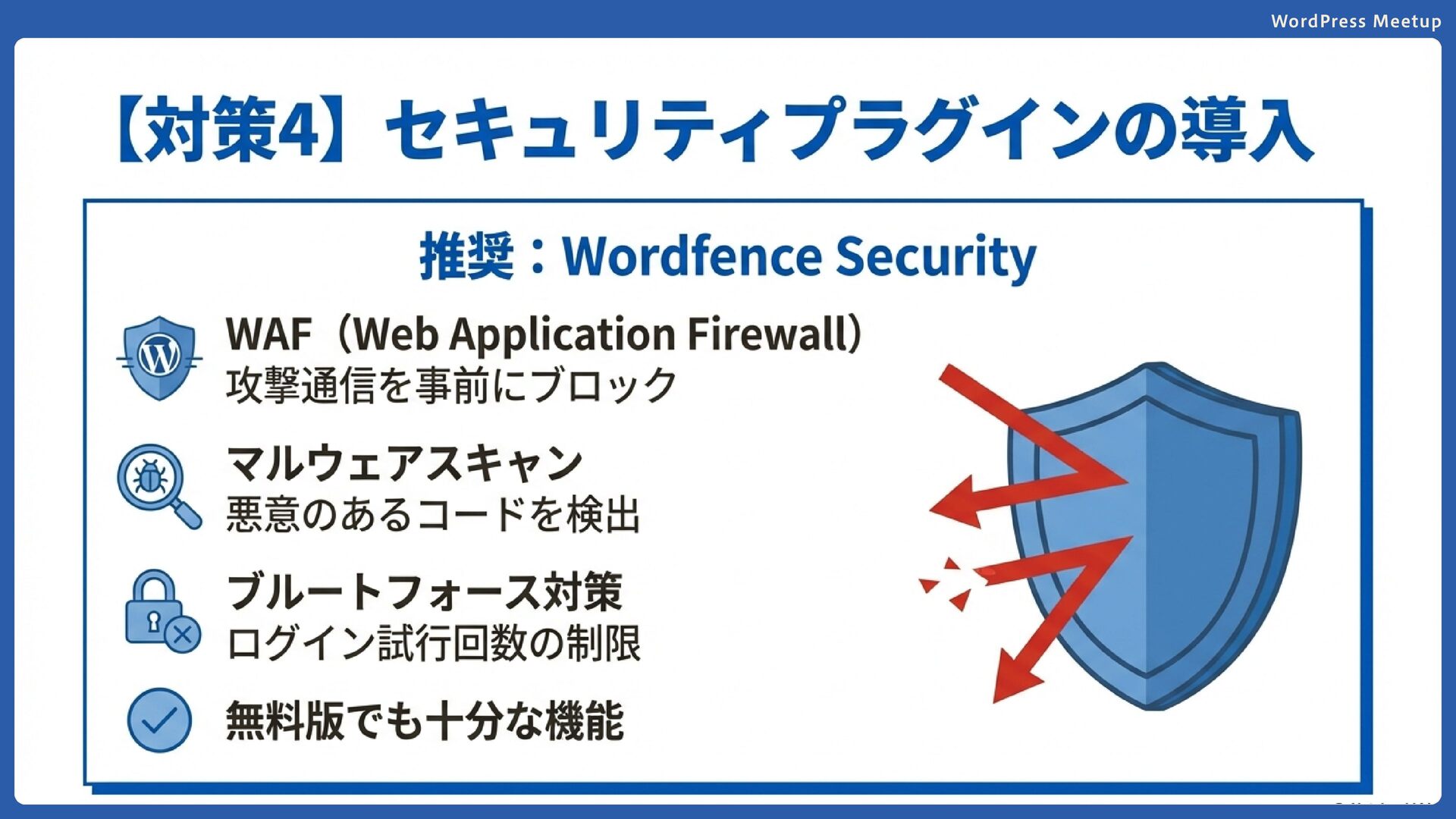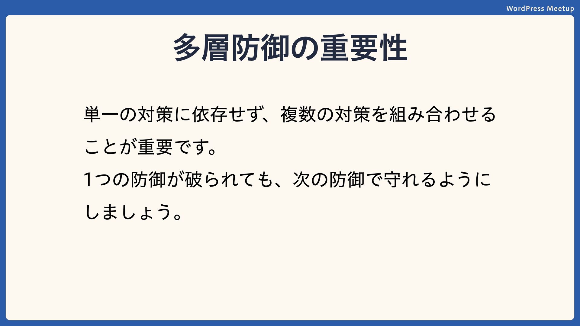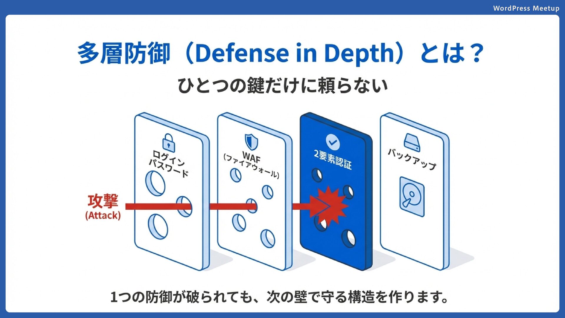 WordPress Meetup 多層防御の重要性 単一の対策に依存せず、複数の対策を組み合わせる ことが重要です。 1つの防御が破られても、次の防御で守れるように しましょう。