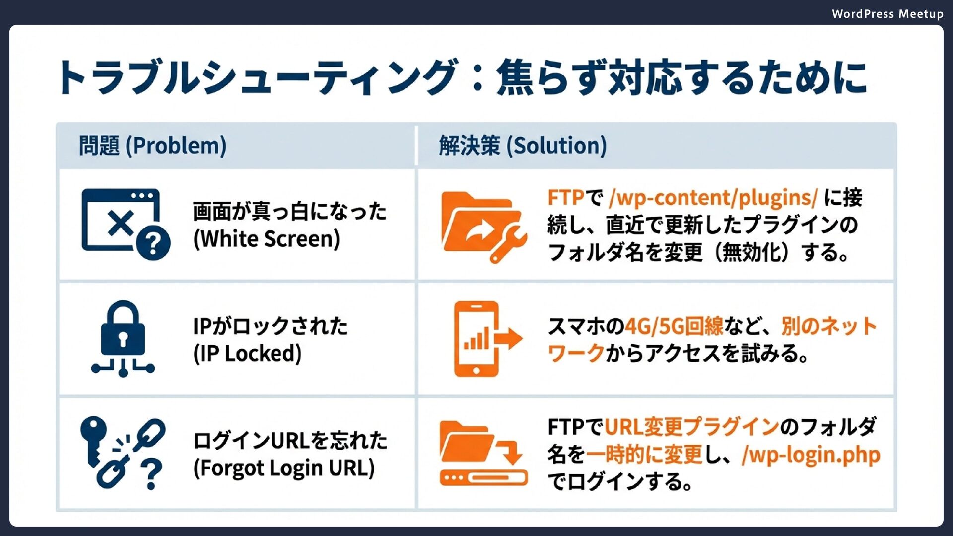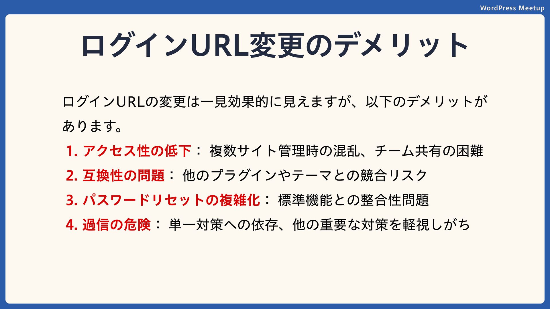 WordPress Meetup ログインURL変更のデメリット ログインURLの変更は一見効果的に見えますが、以下のデメリットが あります。 : 複数サイト管理時の混乱、チーム共有の困難 : 他のプラグインやテーマとの競合リスク :
