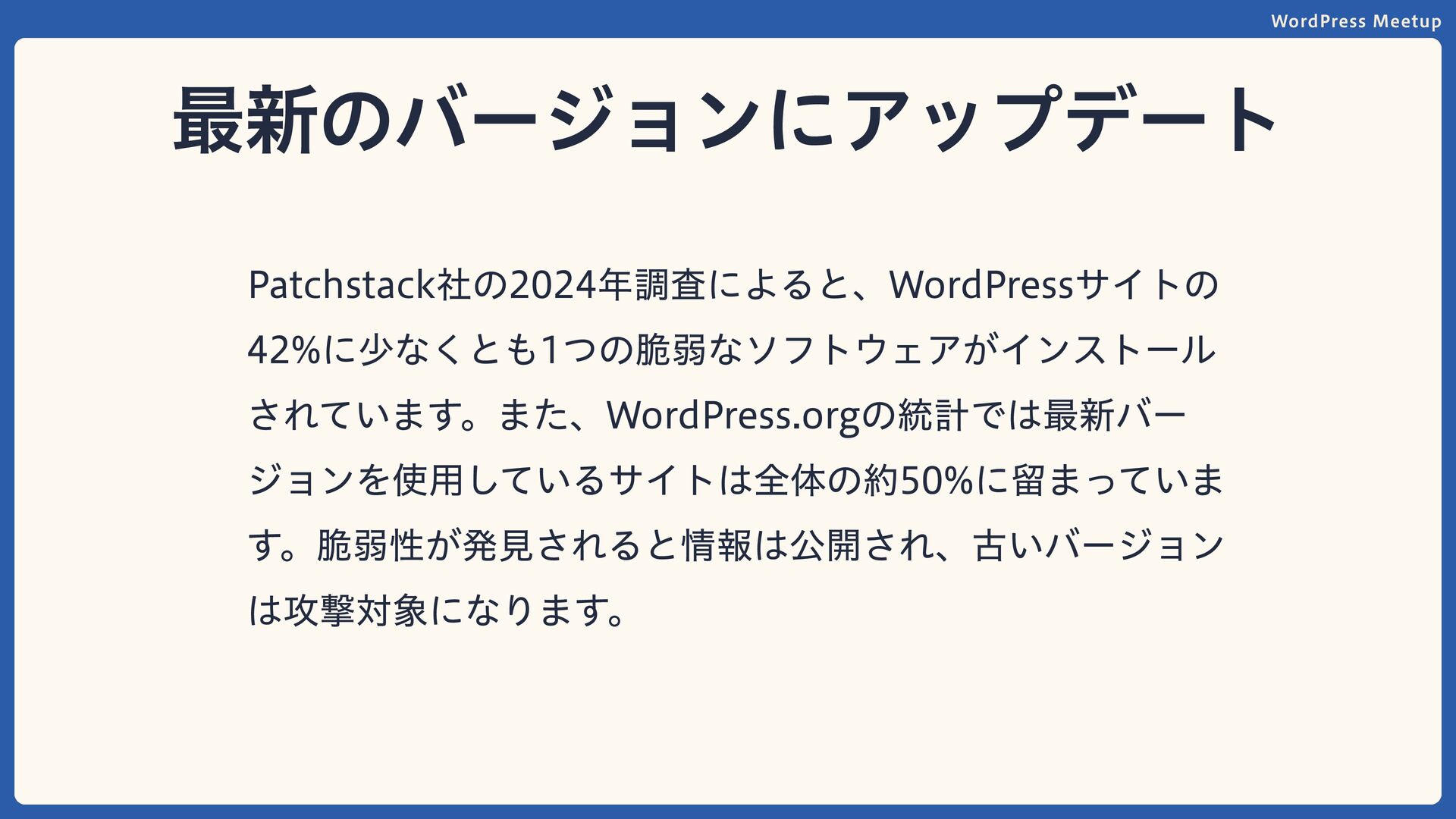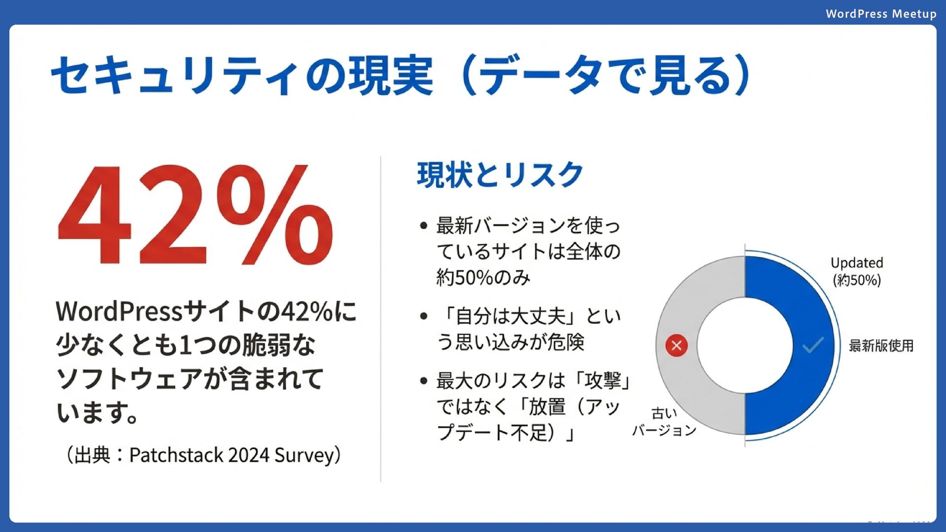 WordPress Meetup 最新のバージョンにアップデート Patchstack社の2024年調査によると、WordPressサイトの 42%に少なくとも1つの脆弱なソフトウェアがインストール されています。また、WordPress.orgの統計では最新バー ジョンを使用しているサイトは全体の約50%に留まっていま す。脆弱性が発見されると情報は公開され、古いバージョン は攻撃対象になります。