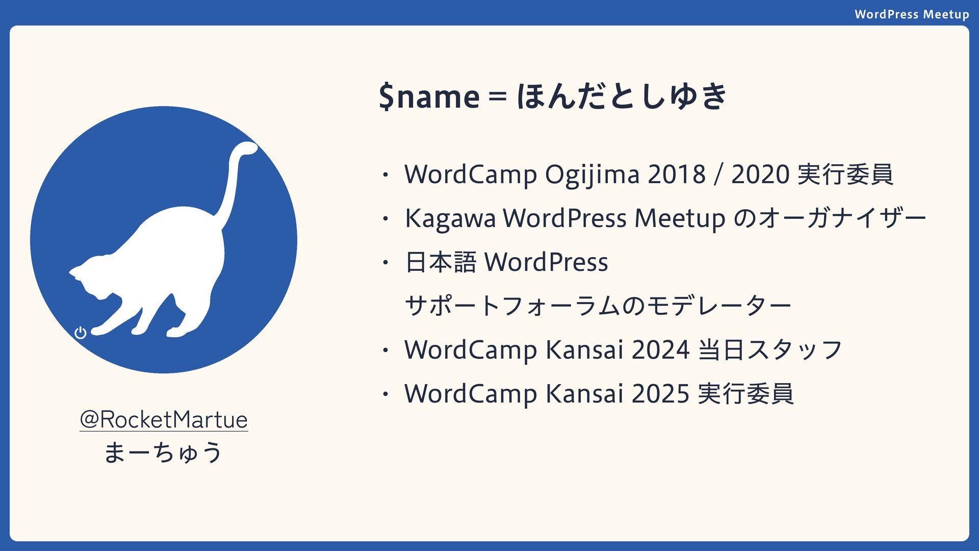 WordPress Meetup $name = ほんだとしゆき まーちゅう @RocketMartue WordCamp Ogijima 2018