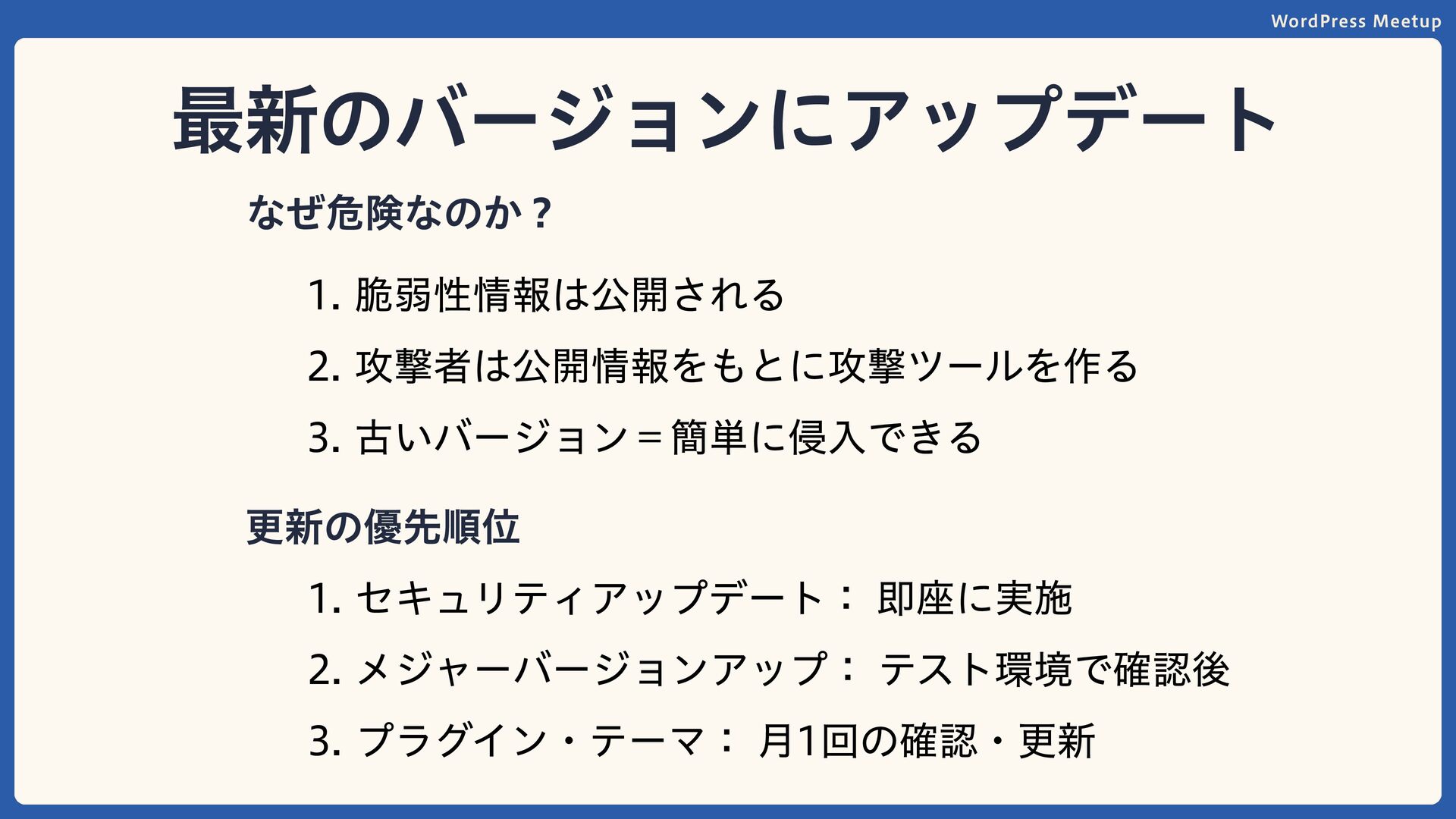 WordPress Meetup 最新のバージョンにアップデート なぜ危険なのか? 更新の優先順位 脆弱性情報は公開される 攻撃者は公開情報をもとに攻撃ツールを作る 古いバージョン=簡単に侵入できる セキュリティアップデート: 即座に実施