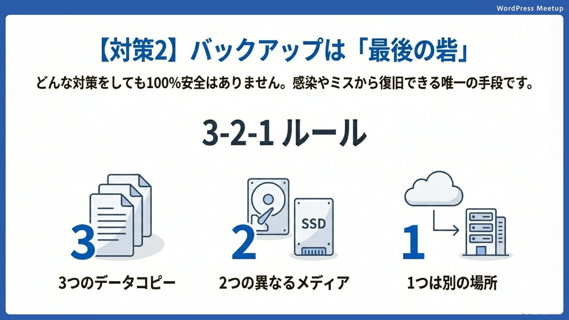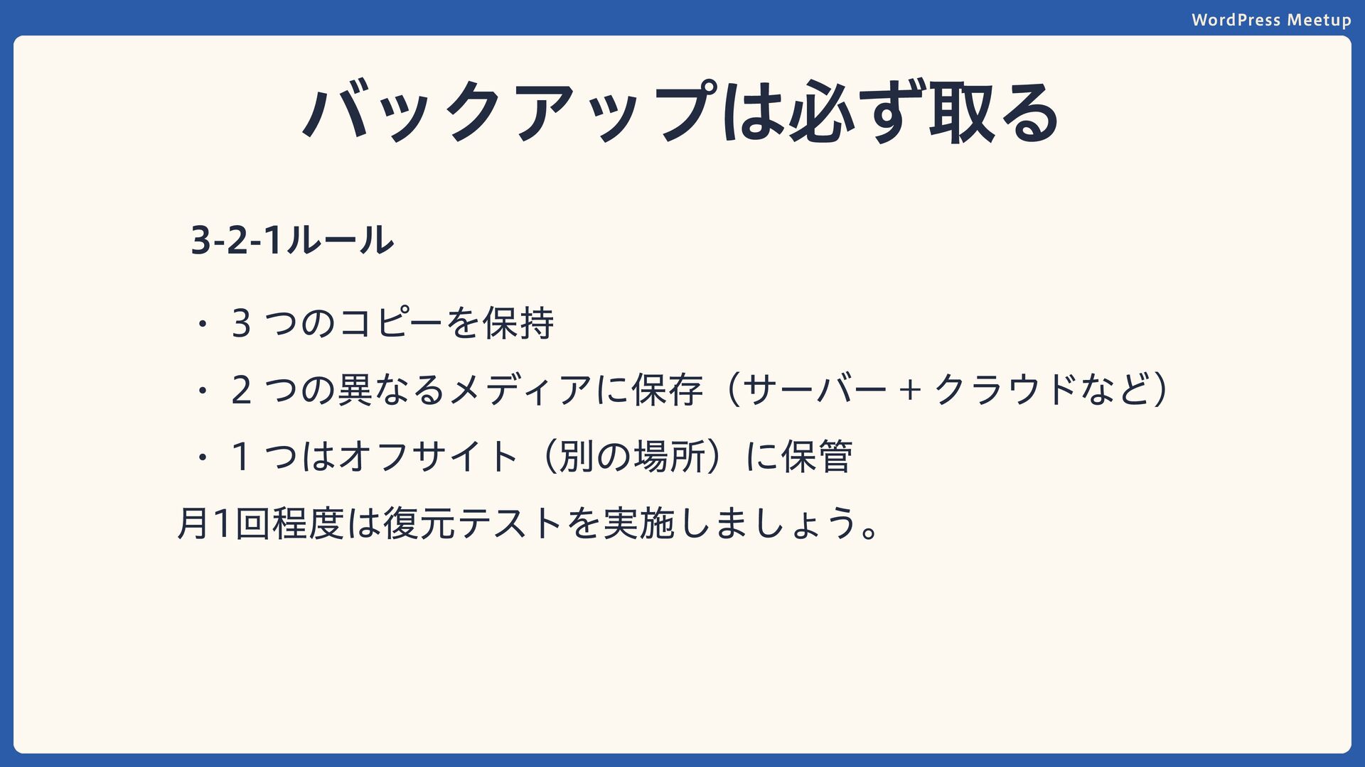 WordPress Meetup バックアップは必ず取る 3 つのコピーを保持 2 つの異なるメディアに保存(サーバー + クラウドなど) 1