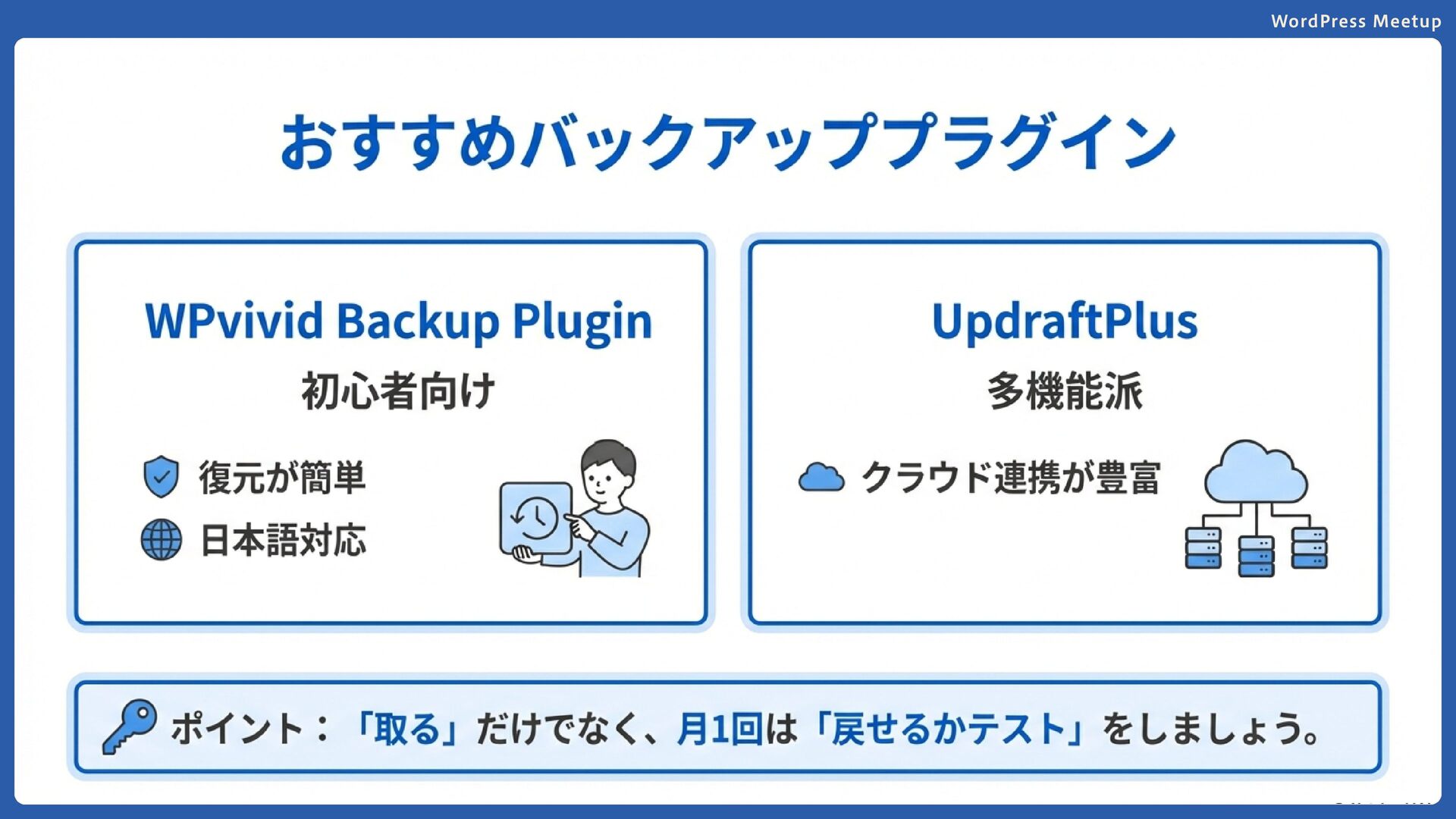WordPress Meetup バックアップは必ず取る バックアップは「最後の砦」です。どんな対策をしても 100%安全はありえません。 マルウェア感染、サーバー障害、人的ミスなど、あらゆ る危機から復旧できる唯一の手段です。