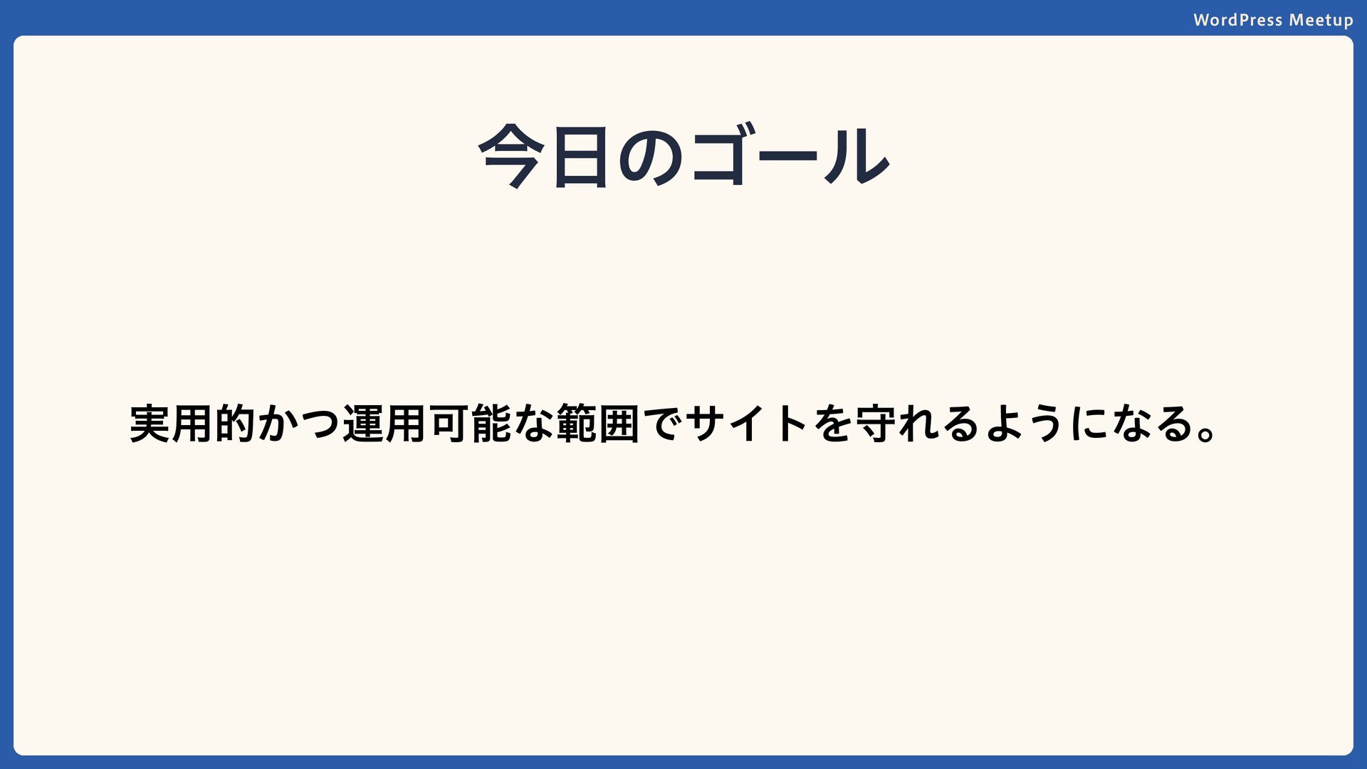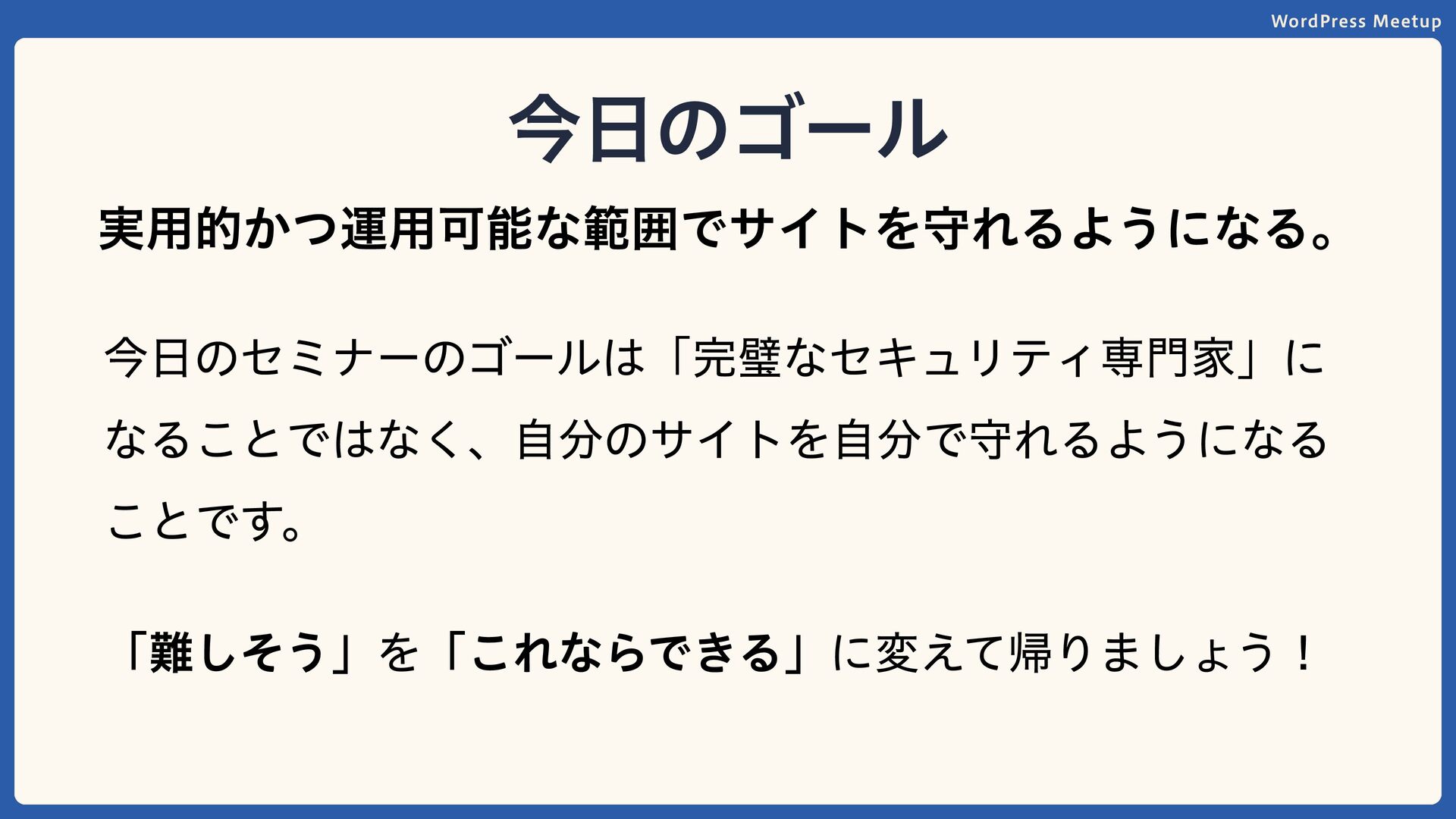 WordPress Meetup 今日のゴール 実用的かつ運用可能な範囲でサイトを守れるようになる。 今日のセミナーのゴールは「完璧なセキュリティ専門家」に なることではなく、自分のサイトを自分で守れるようになる ことです。 「難しそう」を「これならできる」に変えて帰りましょう!