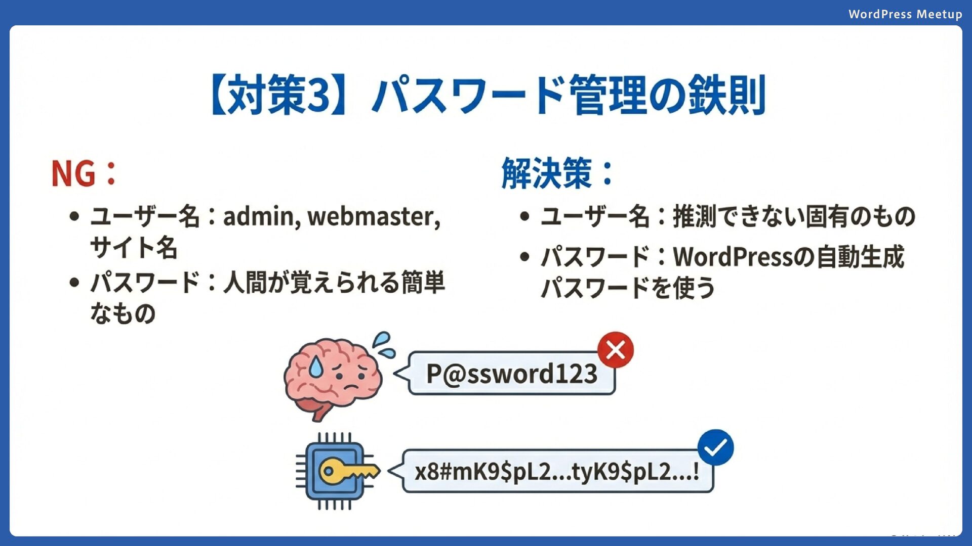 WordPress Meetup 簡単なログインID/パスワードは使わない 避けるべきユーザー名 admin、webmaster、サイト名など推測されやすいもの パスワードは「覚えない」ことが重要 人間が覚えられるパスワード=コンピューターにも推測さ れやすい。WordPressの自動生成パスワードをそのまま使 用しましょう。