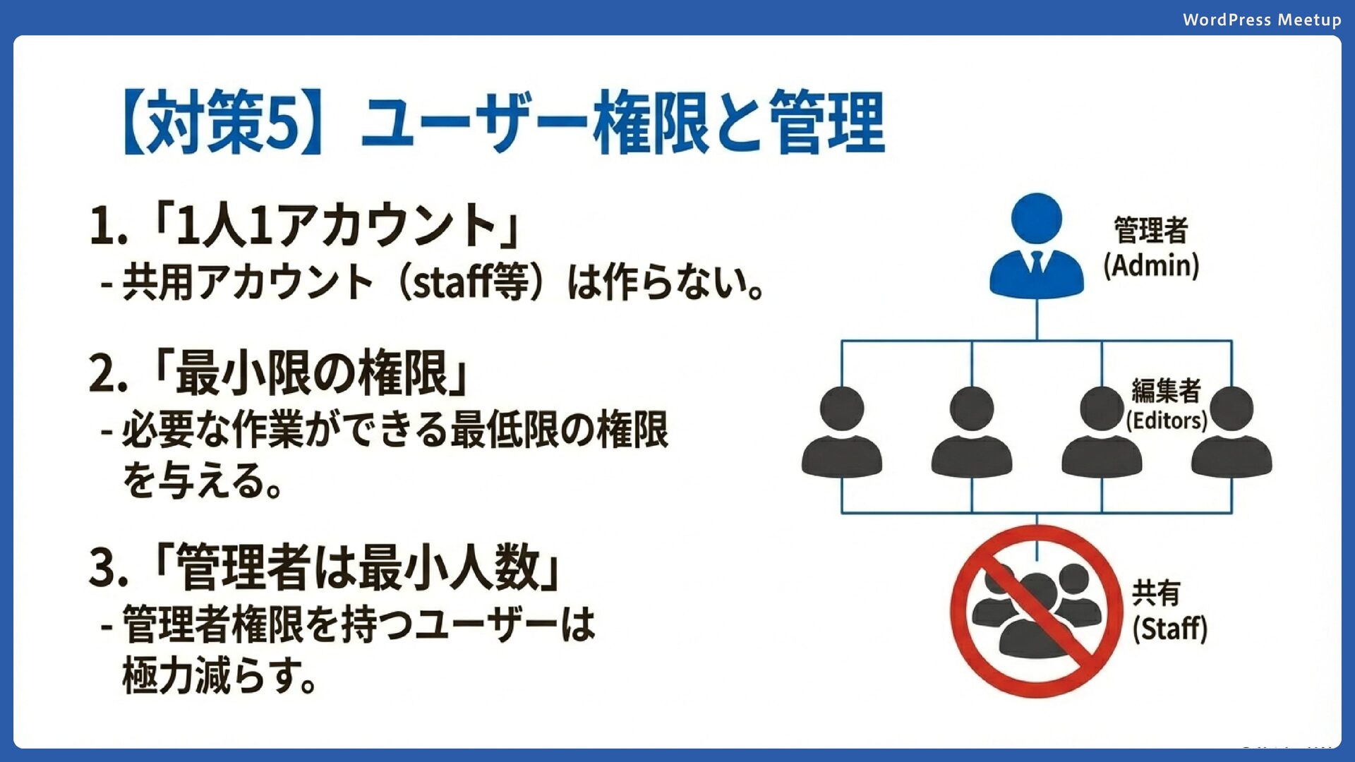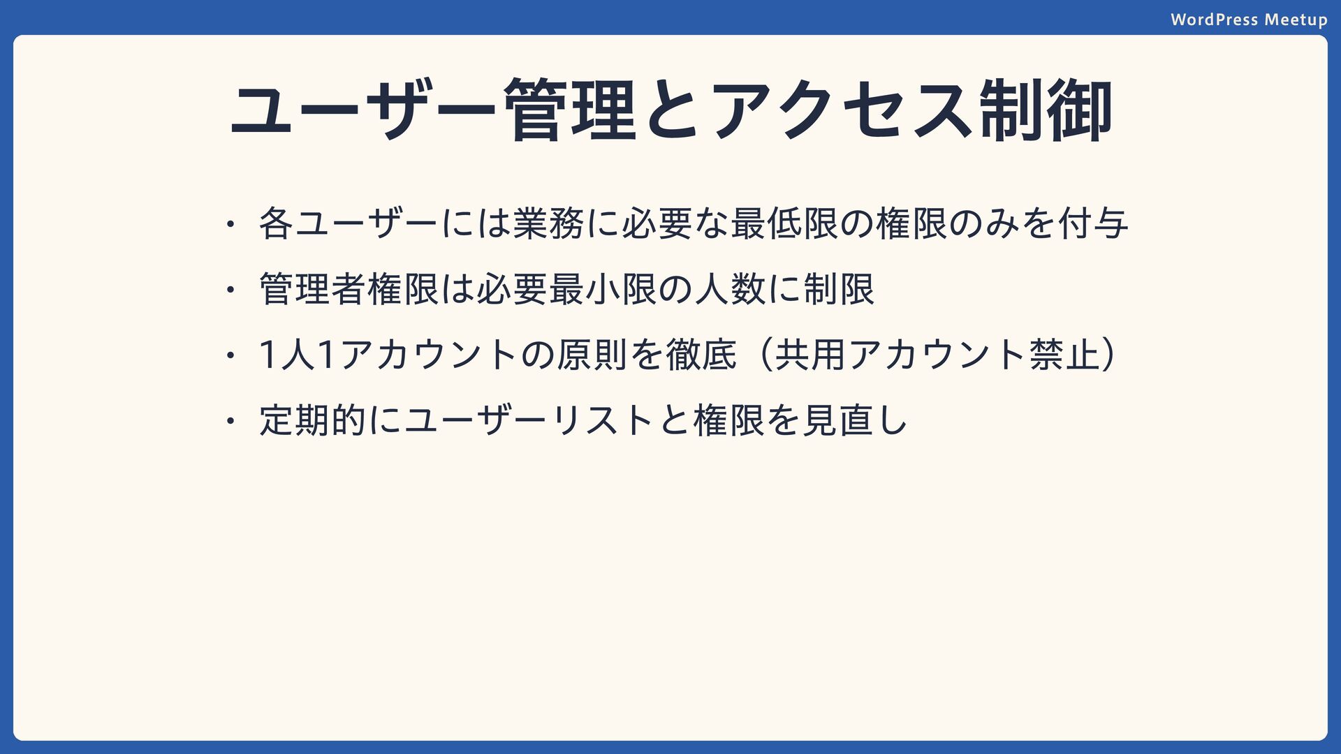 WordPress Meetup ユーザー管理とアクセス制御 各ユーザーには業務に必要な最低限の権限のみを付与 管理者権限は必要最小限の人数に制限 1人1アカウントの原則を徹底(共用アカウント禁止) 定期的にユーザーリストと権限を見直し