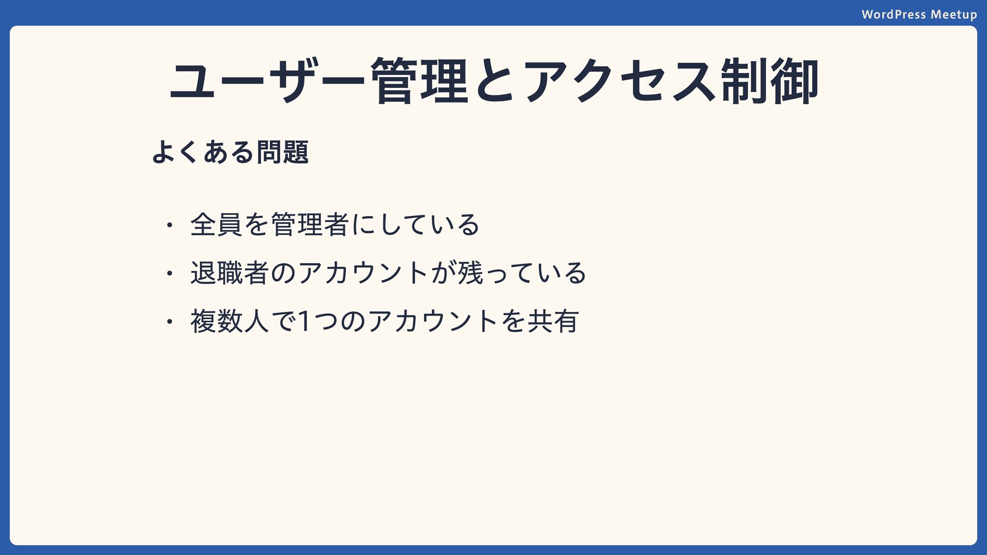 WordPress Meetup ユーザー管理とアクセス制御 全員を管理者にしている 退職者のアカウントが残っている 複数人で1つのアカウントを共有 よくある問題