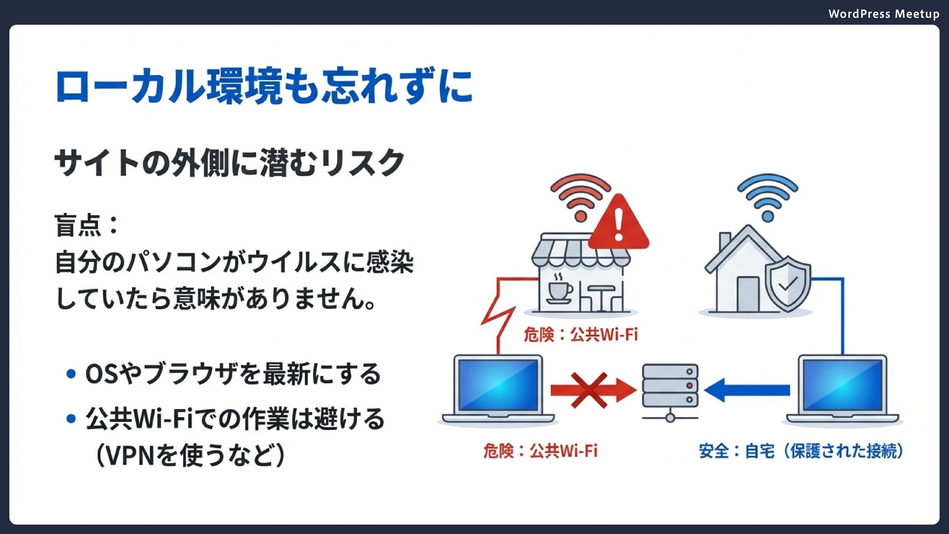 WordPress Meetup もしもの時に備えて ローカルコンピュータ マルウェア、キーロガーに注意。OS・ブラウザを最新に ネットワーク 公共Wi-Fiでの作業は避ける、SFTP/SSLの使用 サーバー 信頼できるホスティングを選ぶ、最新のサーバーソフトウェア 知っておきたい脆弱性のポイント
