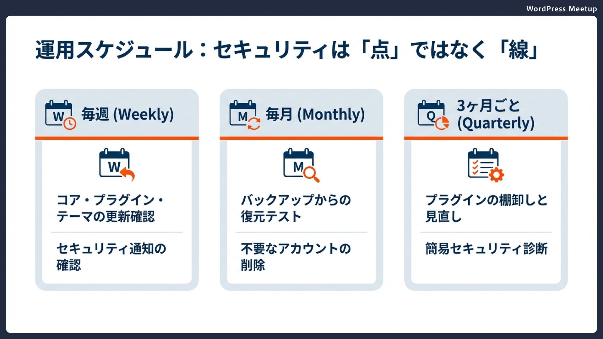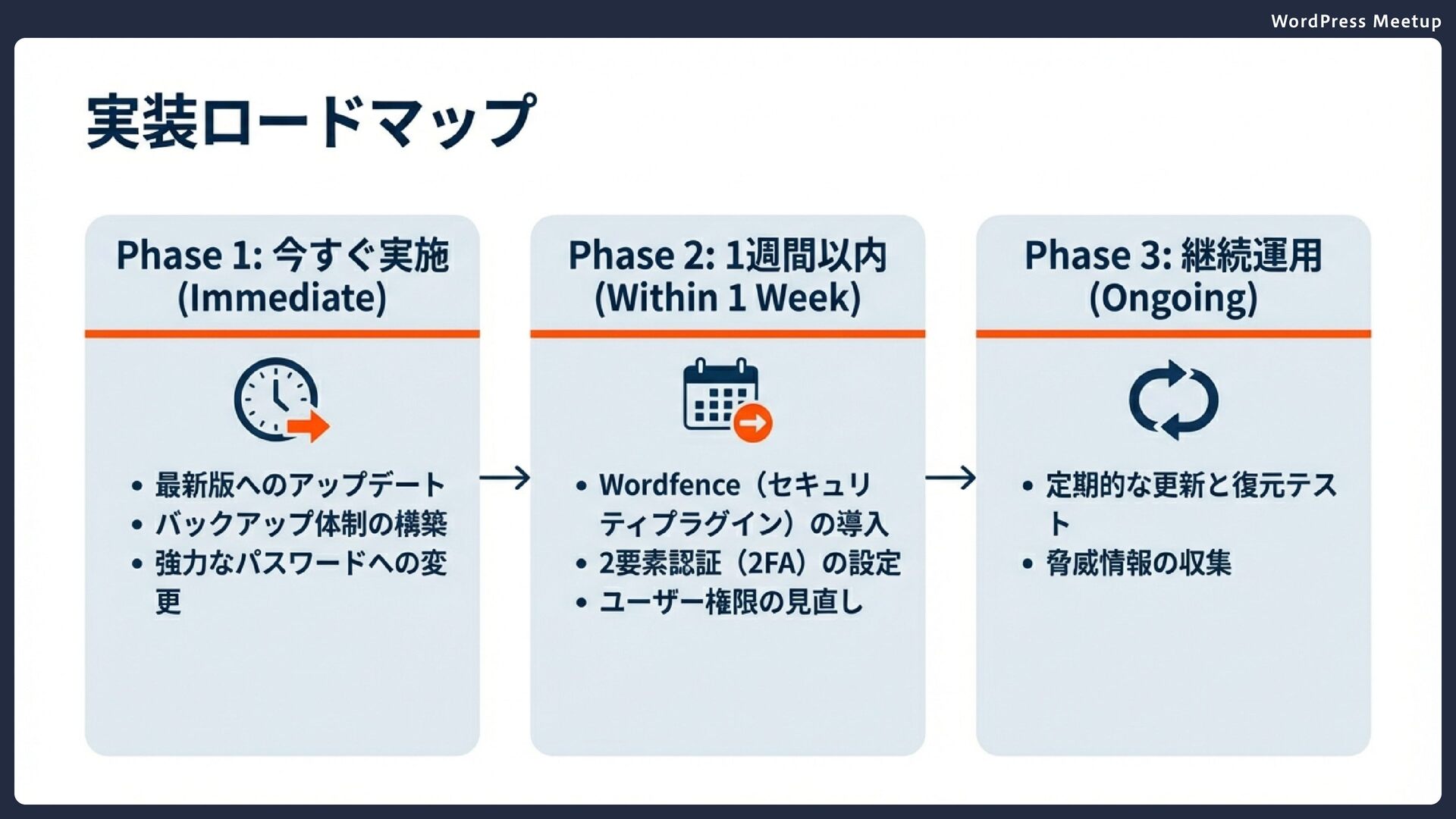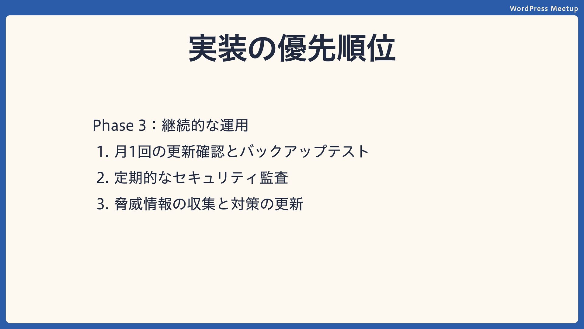 WordPress Meetup 実装の優先順位 Phase 3:継続的な運用 月1回の更新確認とバックアップテスト 定期的なセキュリティ監査 脅威情報の収集と対策の更新