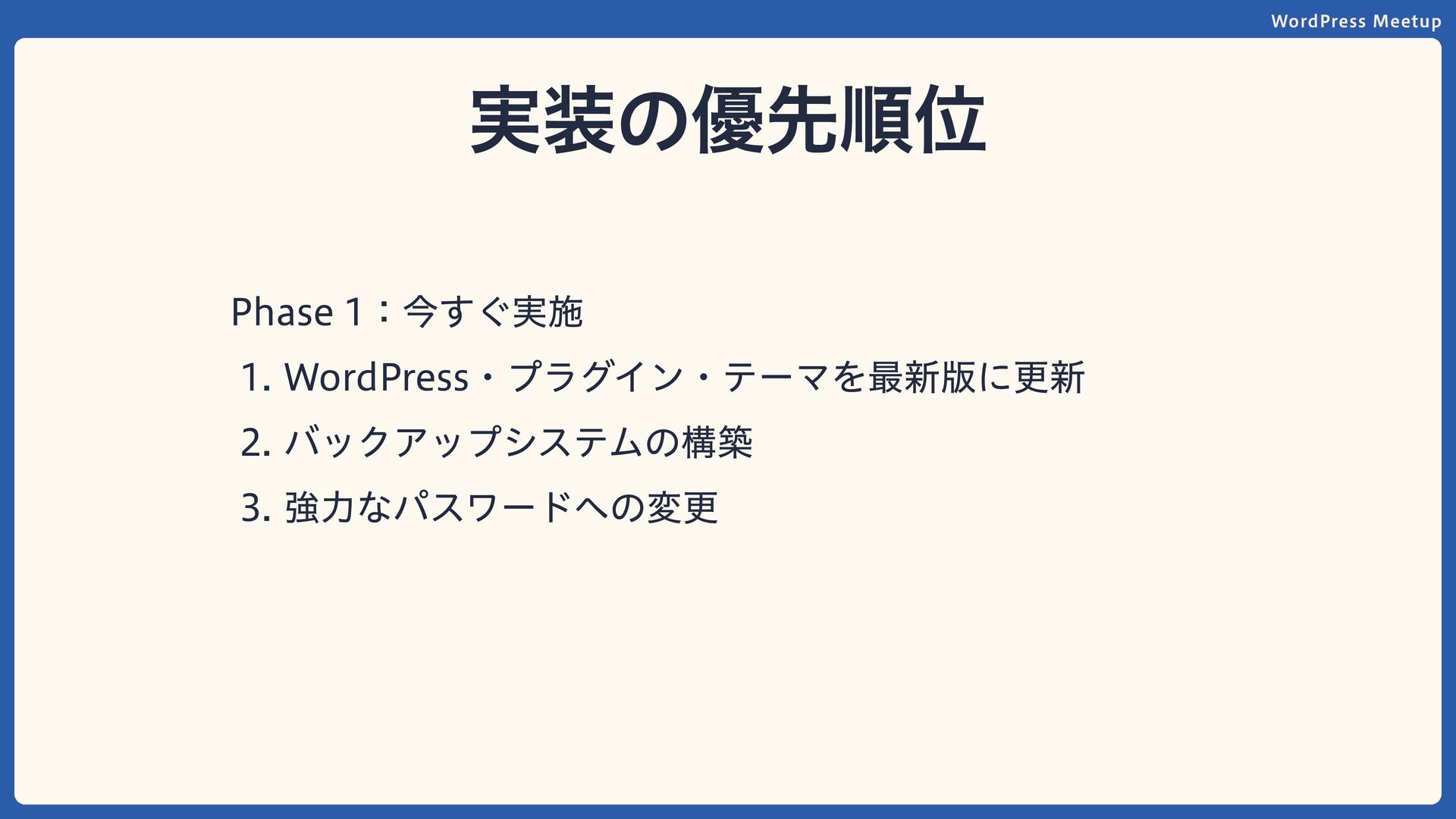WordPress Meetup 実装の優先順位 Phase 1:今すぐ実施 WordPress・プラグイン・テーマを最新版に更新 バックアップシステムの構築 強力なパスワードへの変更
