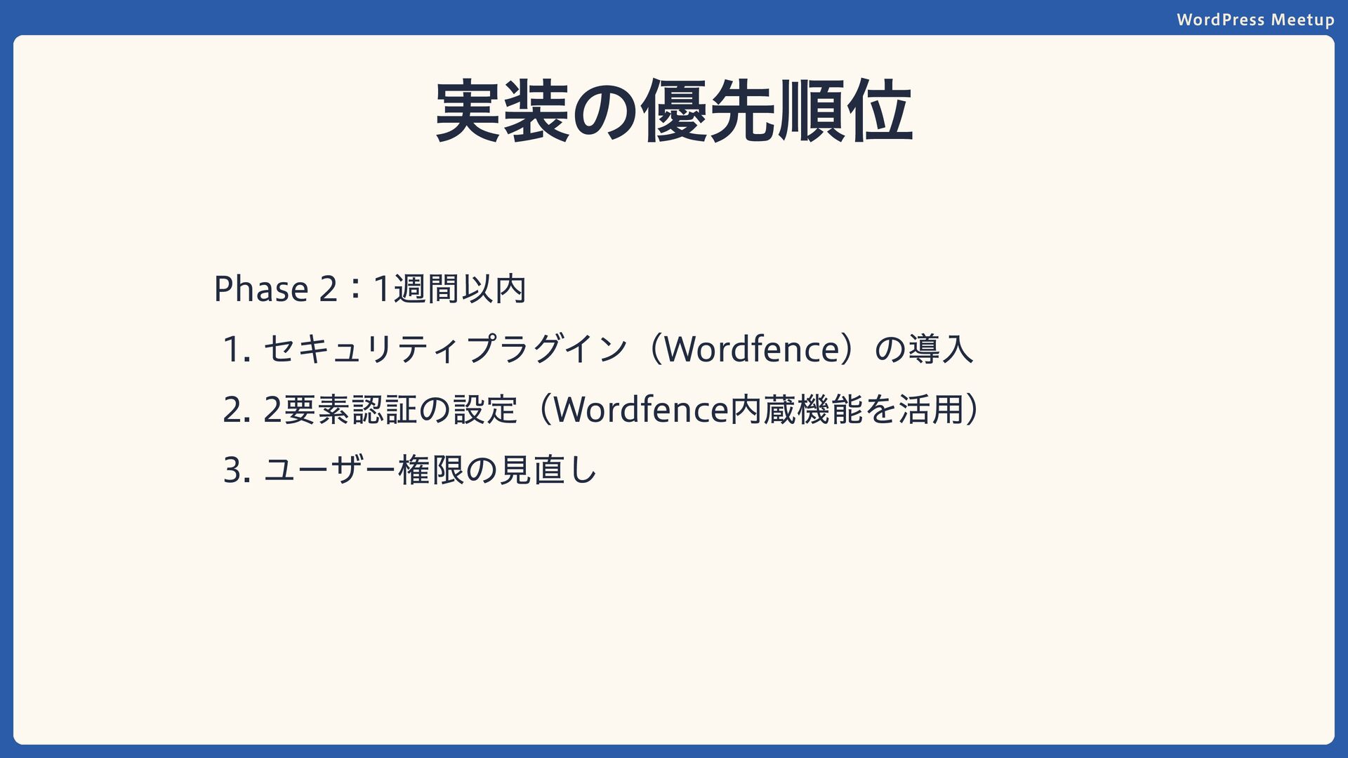 WordPress Meetup 実装の優先順位 Phase 2:1週間以内 セキュリティプラグイン(Wordfence)の導入 2要素認証の設定(Wordfence内蔵機能を活用) ユーザー権限の見直し