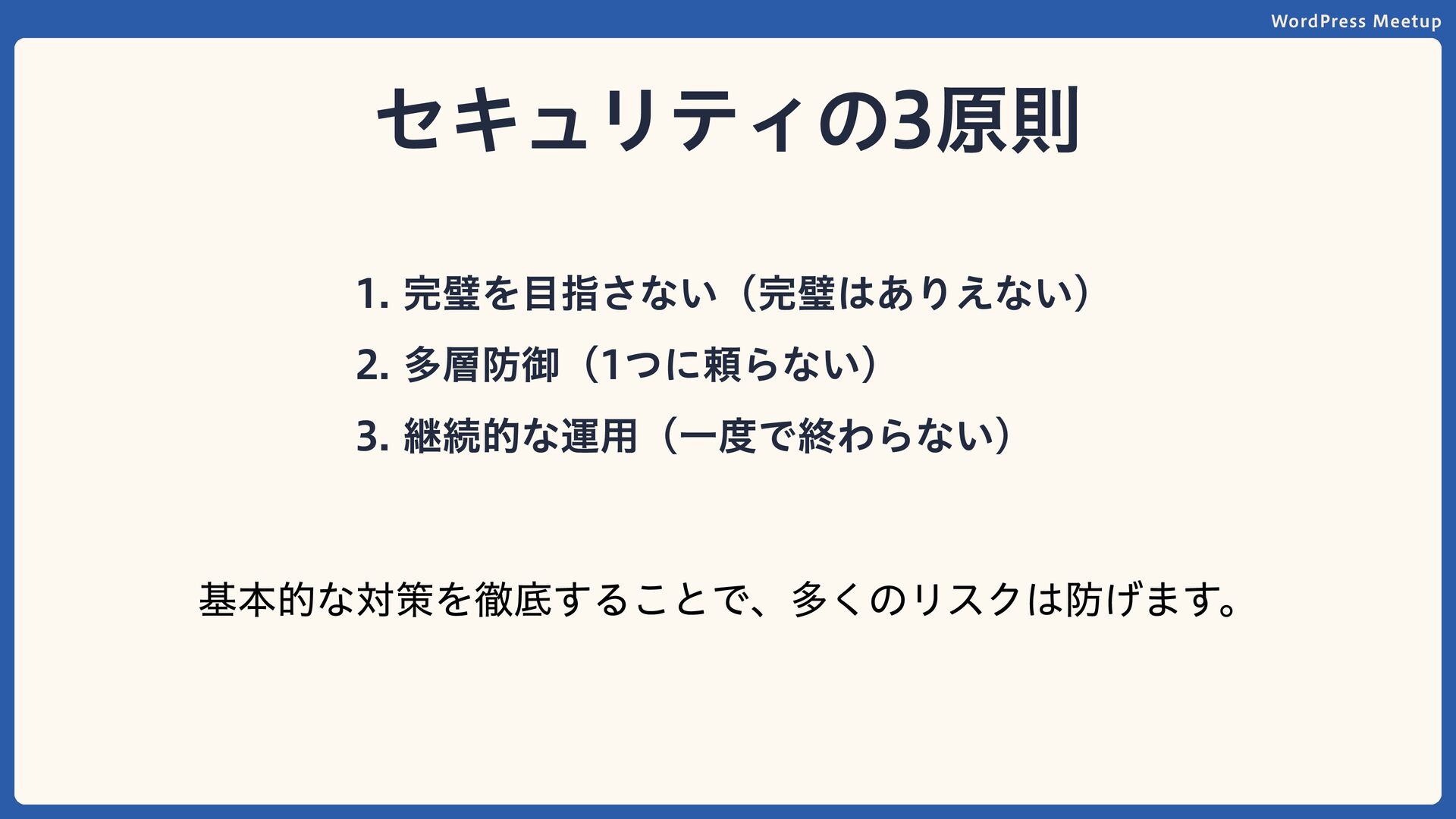 WordPress Meetup セキュリティの3原則 完璧を目指さない(完璧はありえない) 多層防御(1つに頼らない) 継続的な運用(一度で終わらない) 基本的な対策を徹底することで、多くのリスクは防げます。