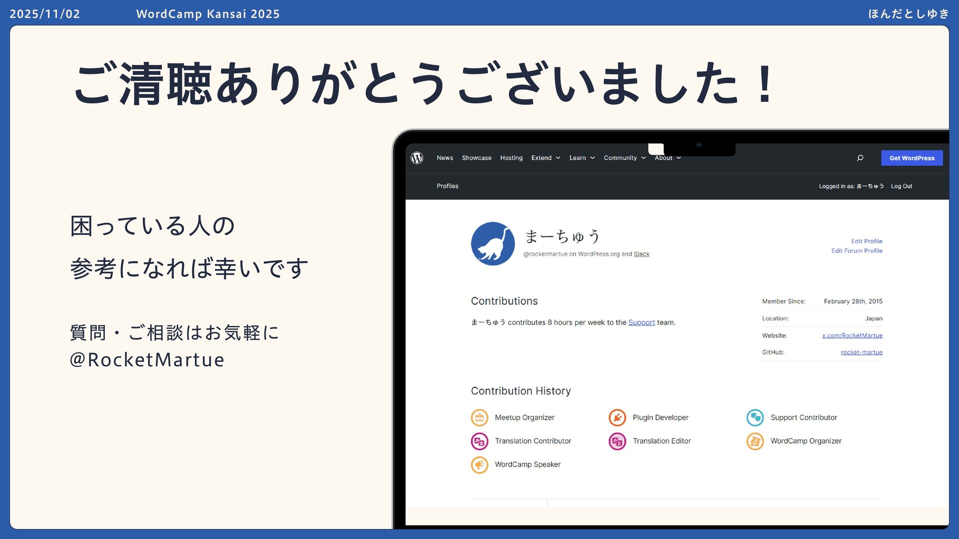 2025/11/02 WordCamp Kansai 2025 ほんだとしゆき 困っている人の 参考になれば幸いです 質問・ご相談はお気軽に @RocketMartue ご清聴ありがとうございました!