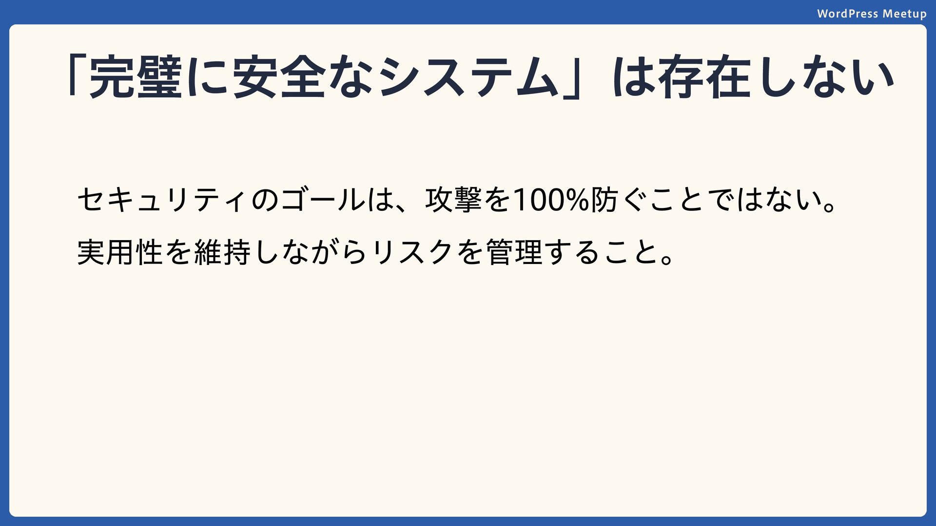 WordPress Meetup 「完璧に安全なシステム」は存在しない セキュリティのゴールは、攻撃を100%防ぐことではない。 実用性を維持しながらリスクを管理すること。