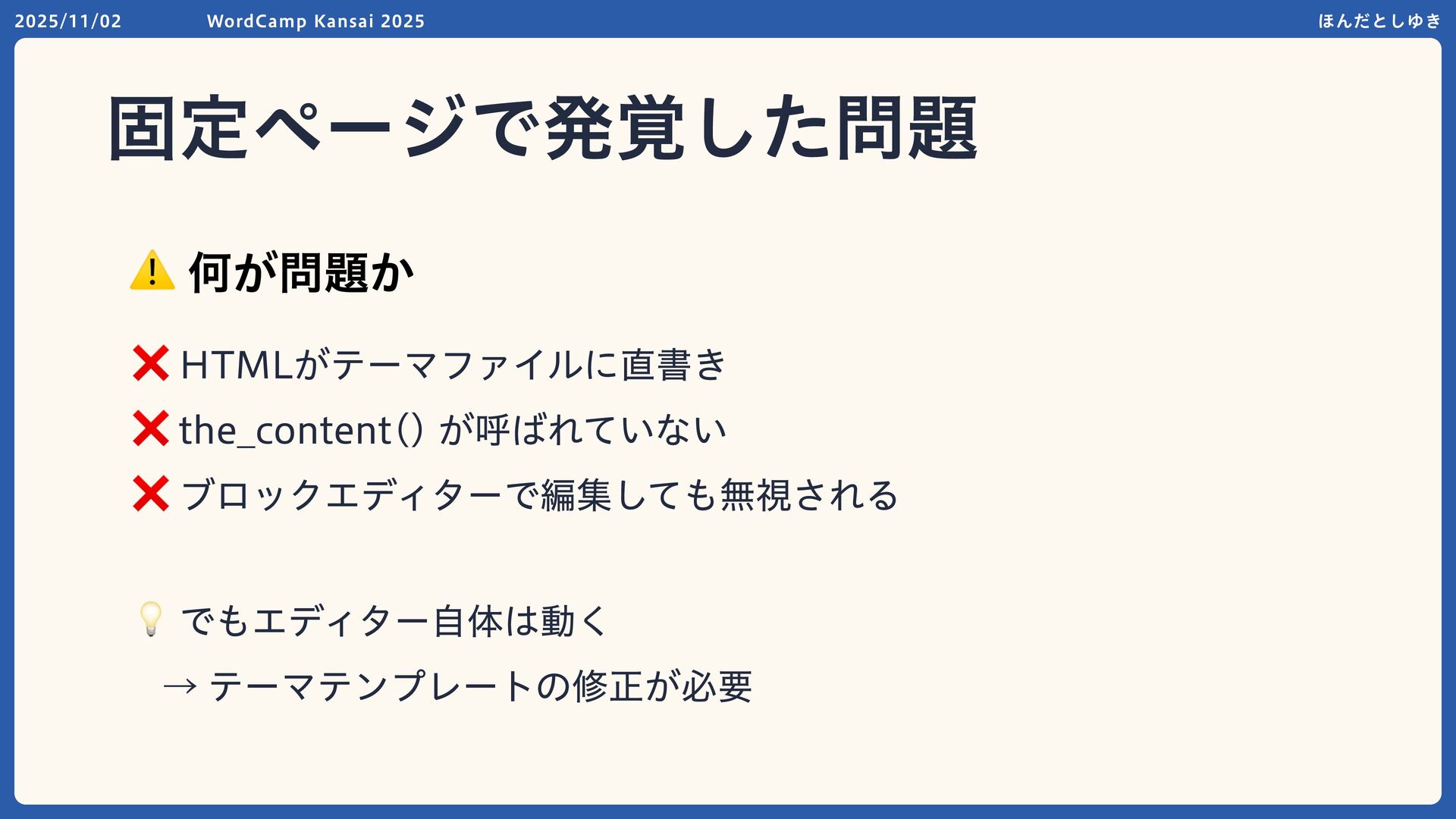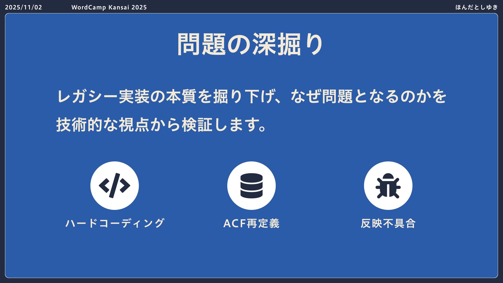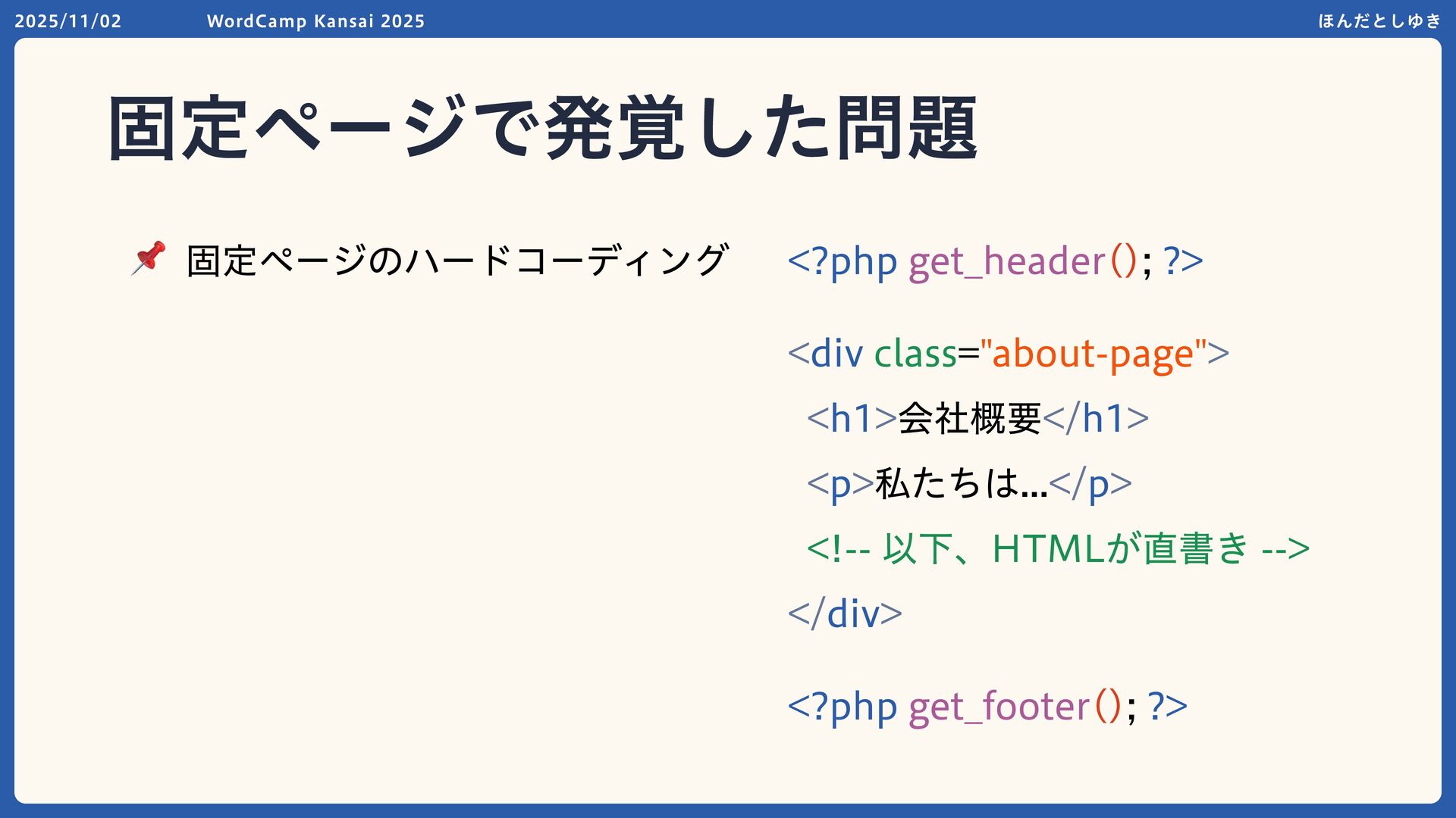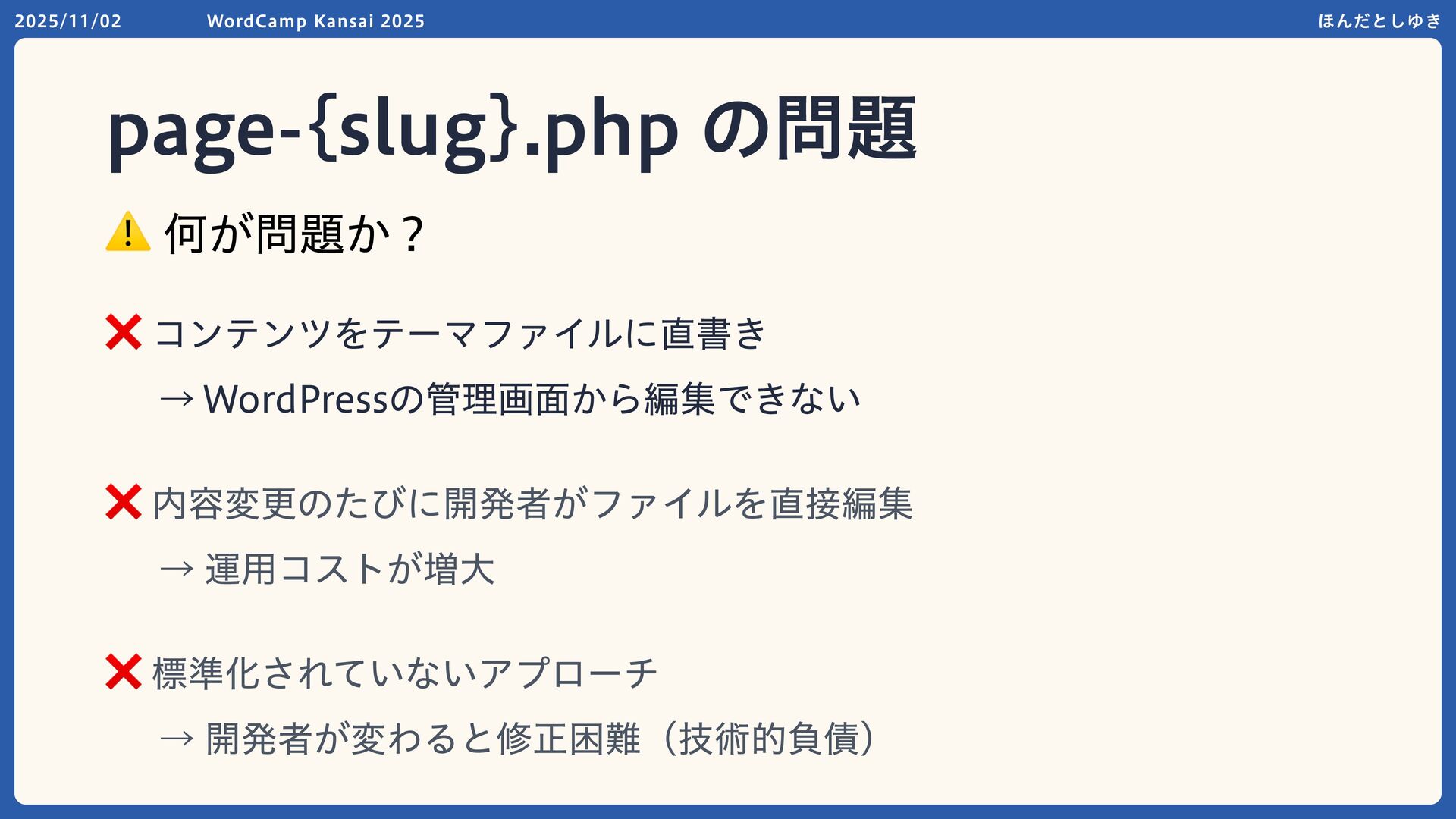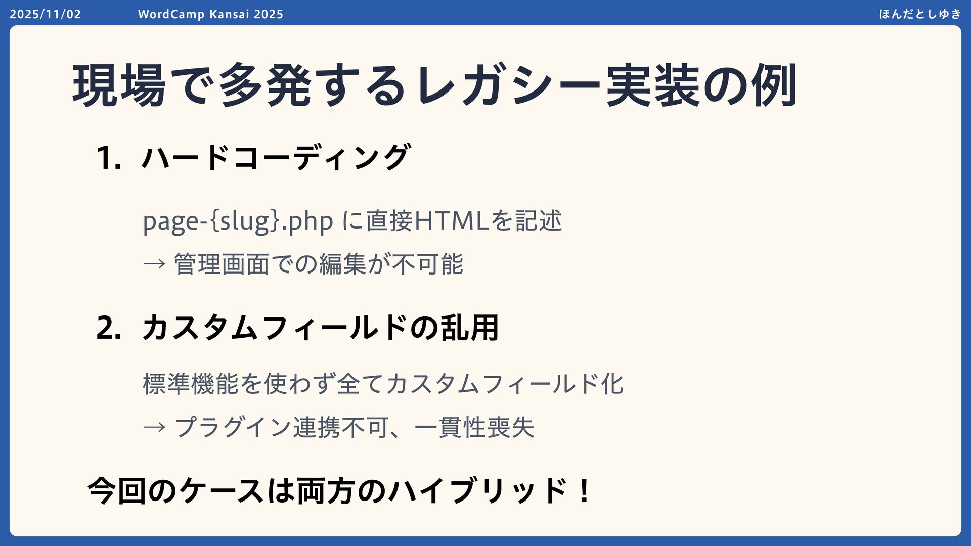 page-{slug}.phpにハードコーディングされた内容や、ページタイトル、アイキャッチ、カテゴリー、コンテンツ部分が全部ACFで定義されたカスタムフィールドになっているなど、現場で遭遇したレガシーな実装をAIの力も借りながら、ブロックエディター対応にした実際の事例をお話ししました。