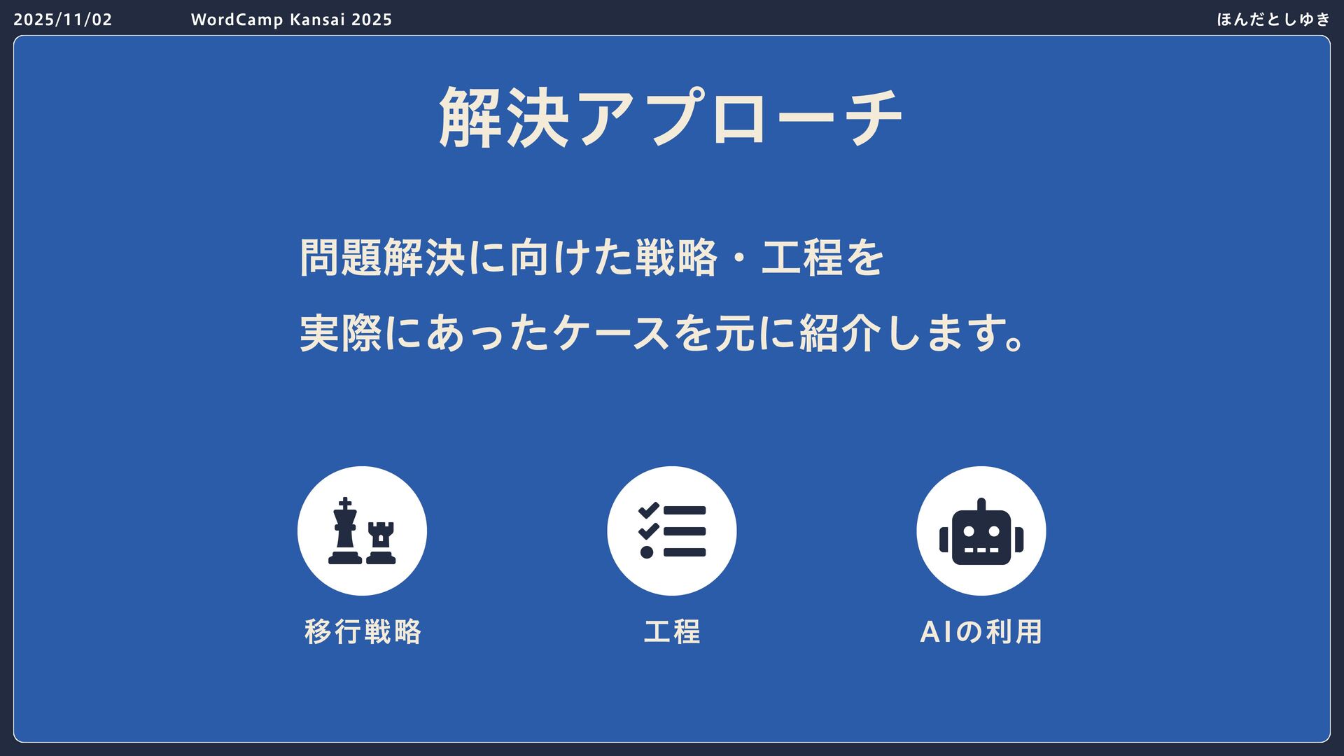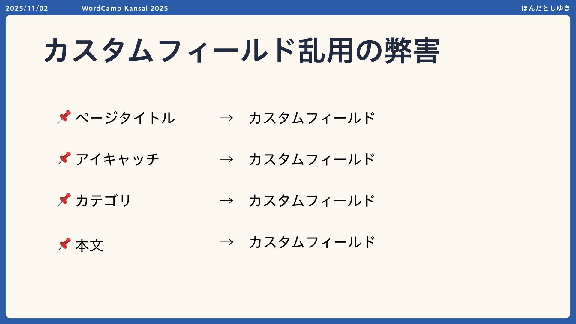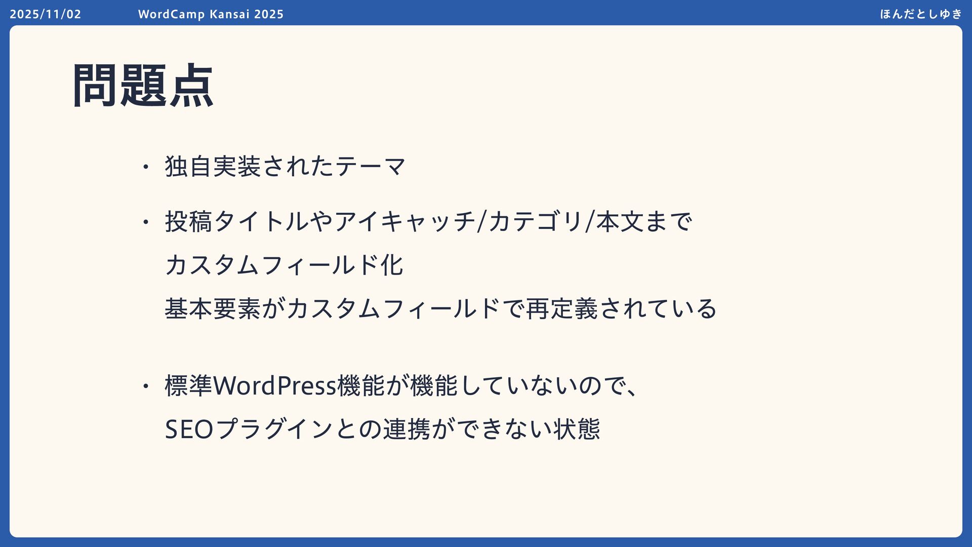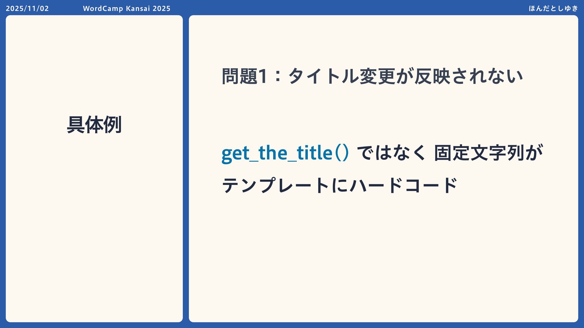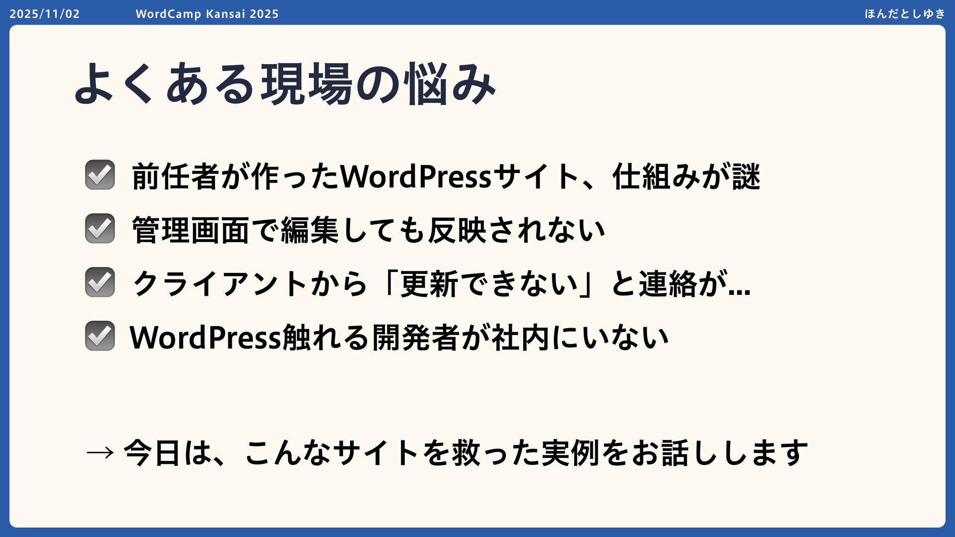 page-{slug}.phpにハードコーディングされた内容や、ページタイトル、アイキャッチ、カテゴリー、コンテンツ部分が全部ACFで定義されたカスタムフィールドになっているなど、現場で遭遇したレガシーな実装をAIの力も借りながら、ブロックエディター対応にした実際の事例をお話ししました。