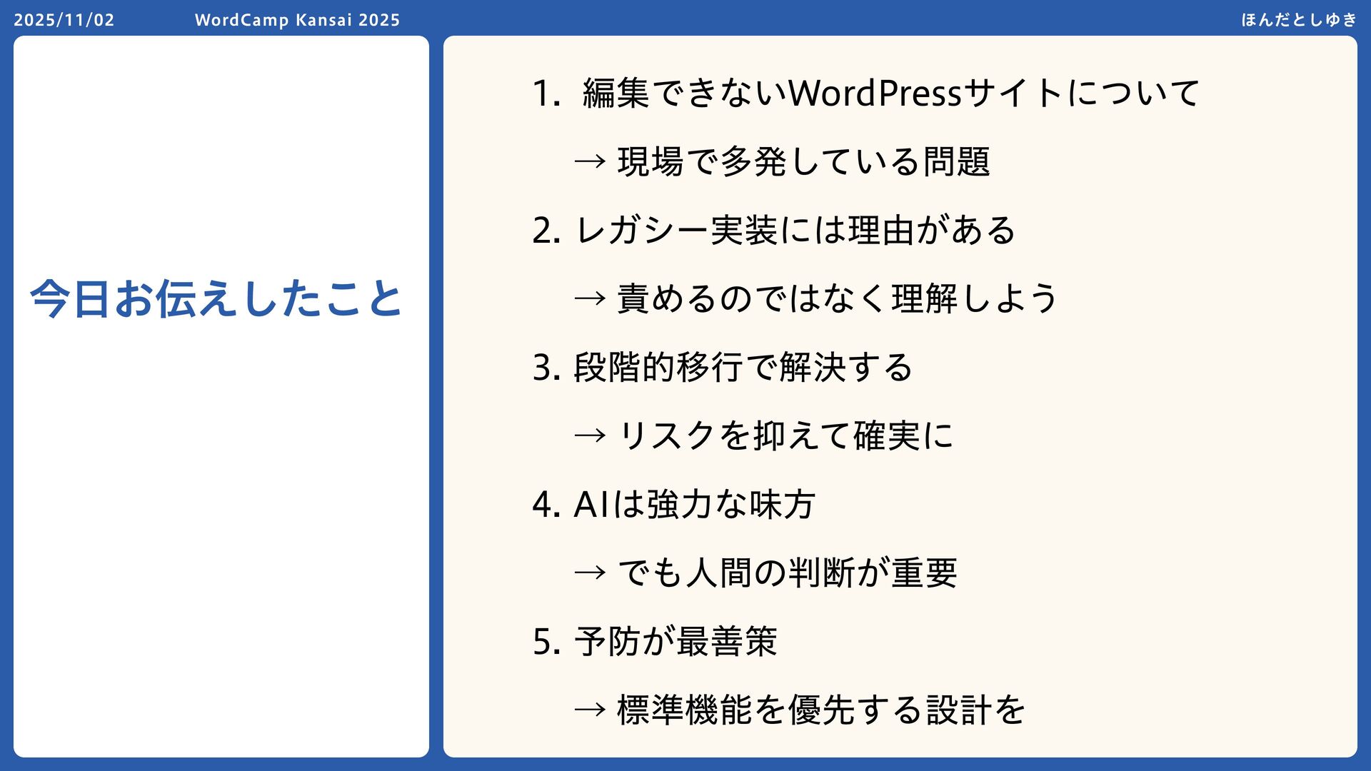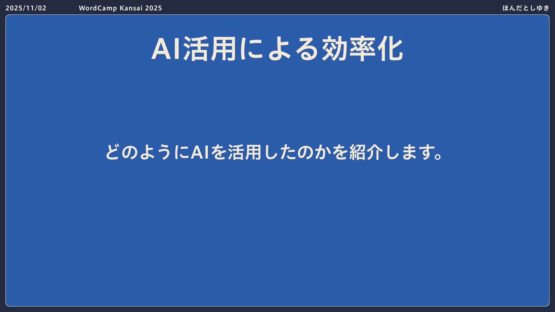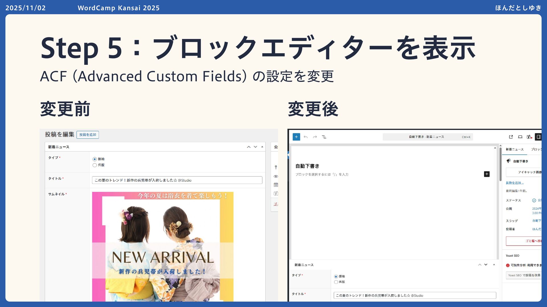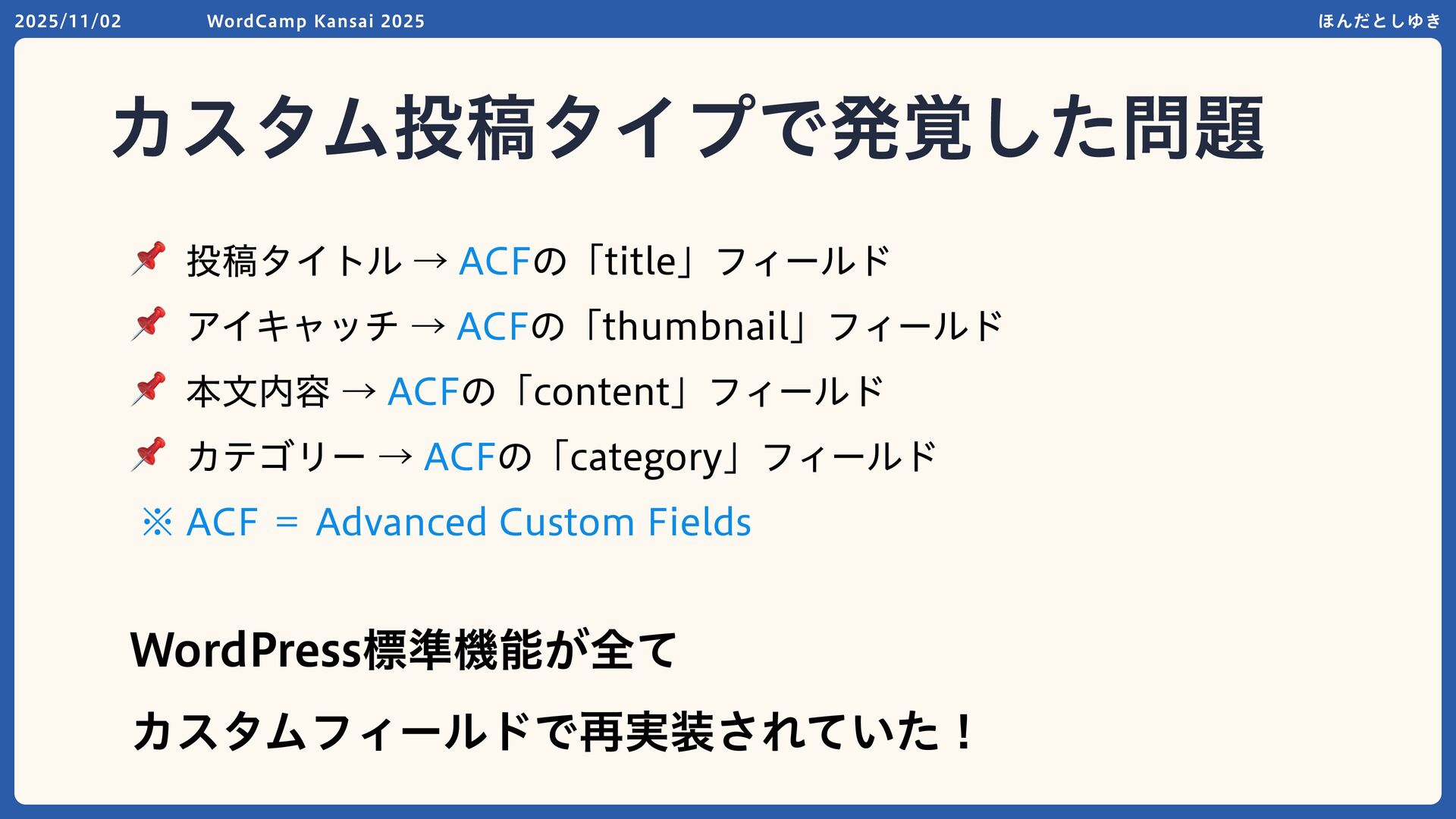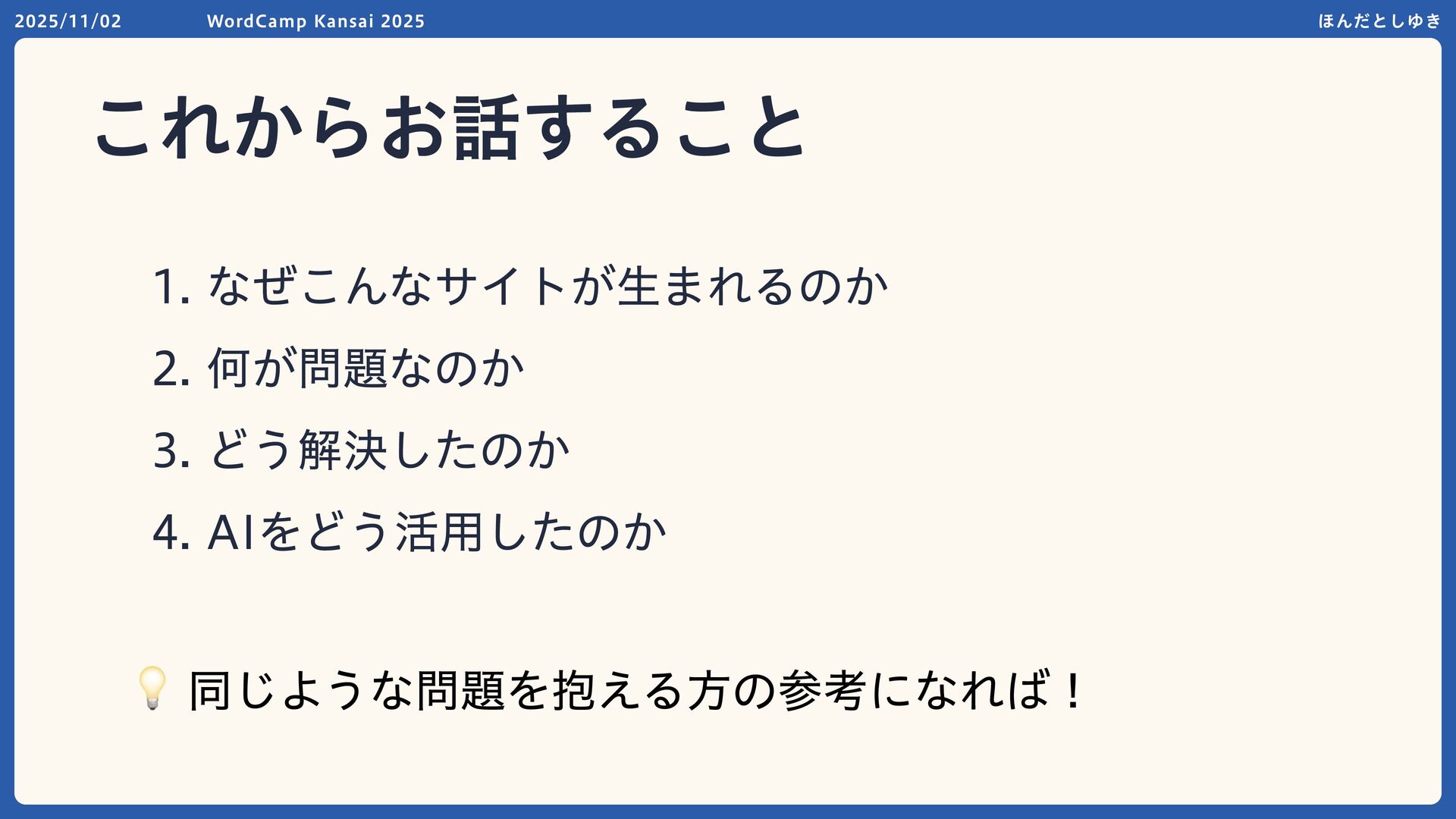 page-{slug}.phpにハードコーディングされた内容や、ページタイトル、アイキャッチ、カテゴリー、コンテンツ部分が全部ACFで定義されたカスタムフィールドになっているなど、現場で遭遇したレガシーな実装をAIの力も借りながら、ブロックエディター対応にした実際の事例をお話ししました。