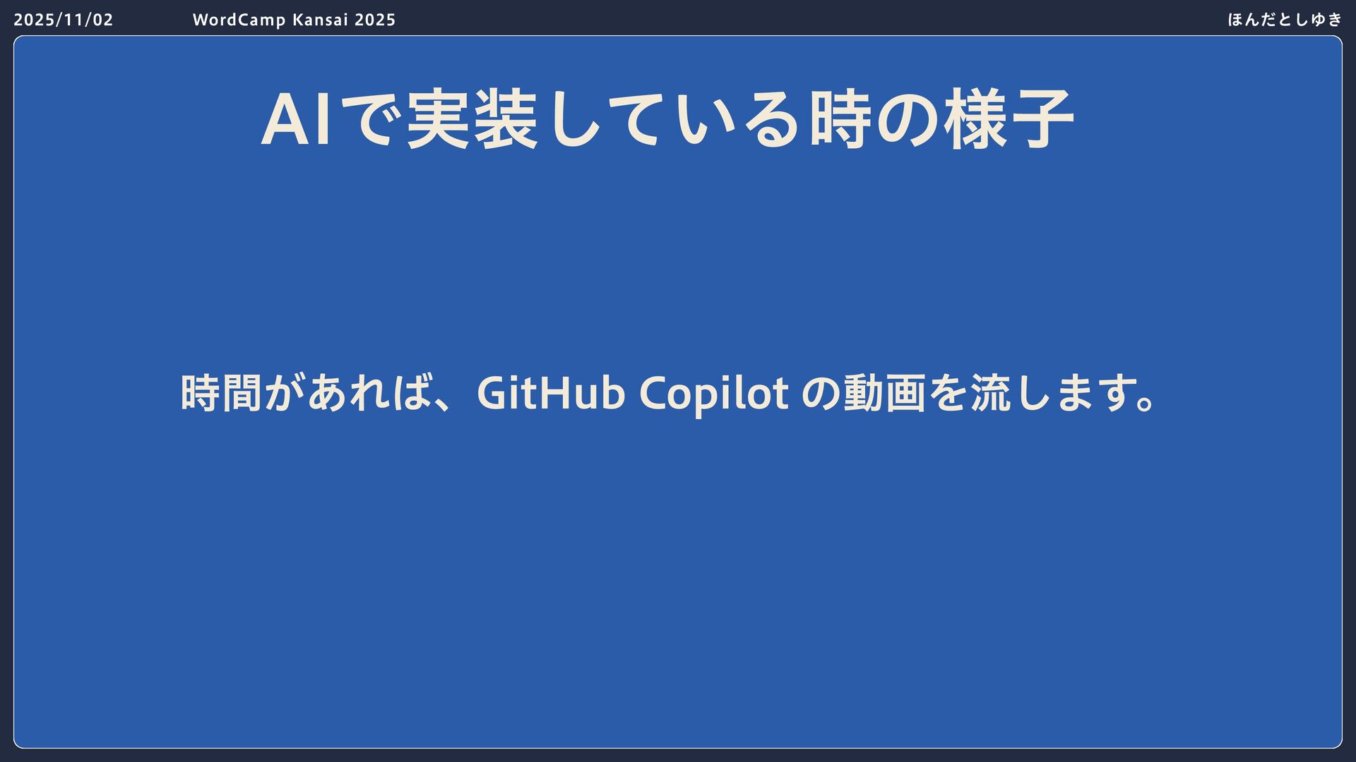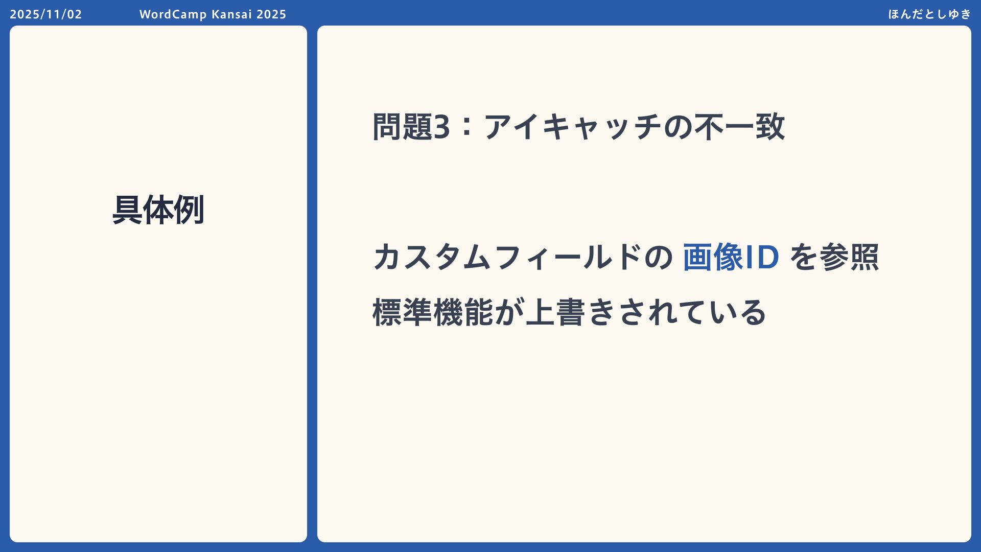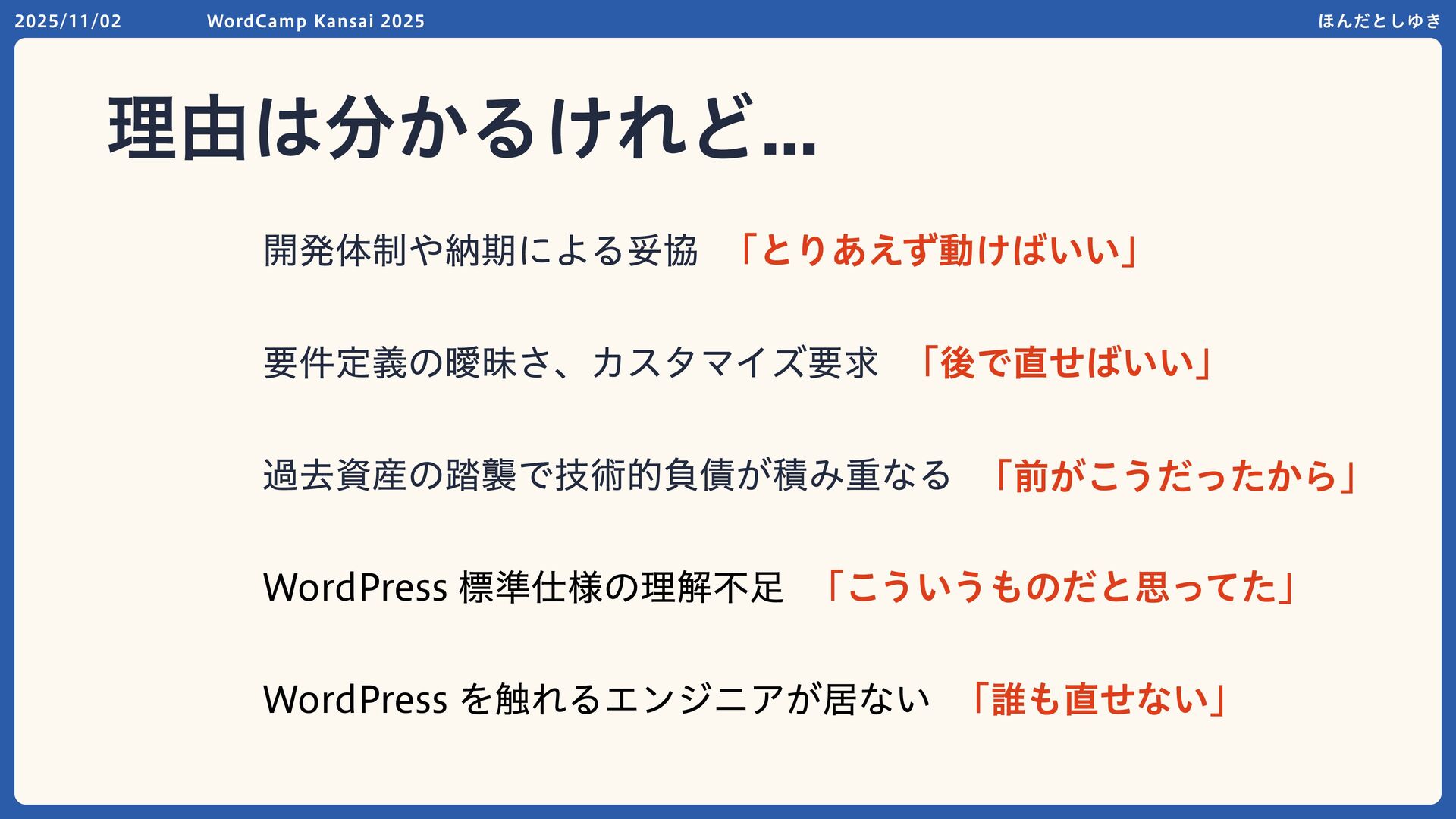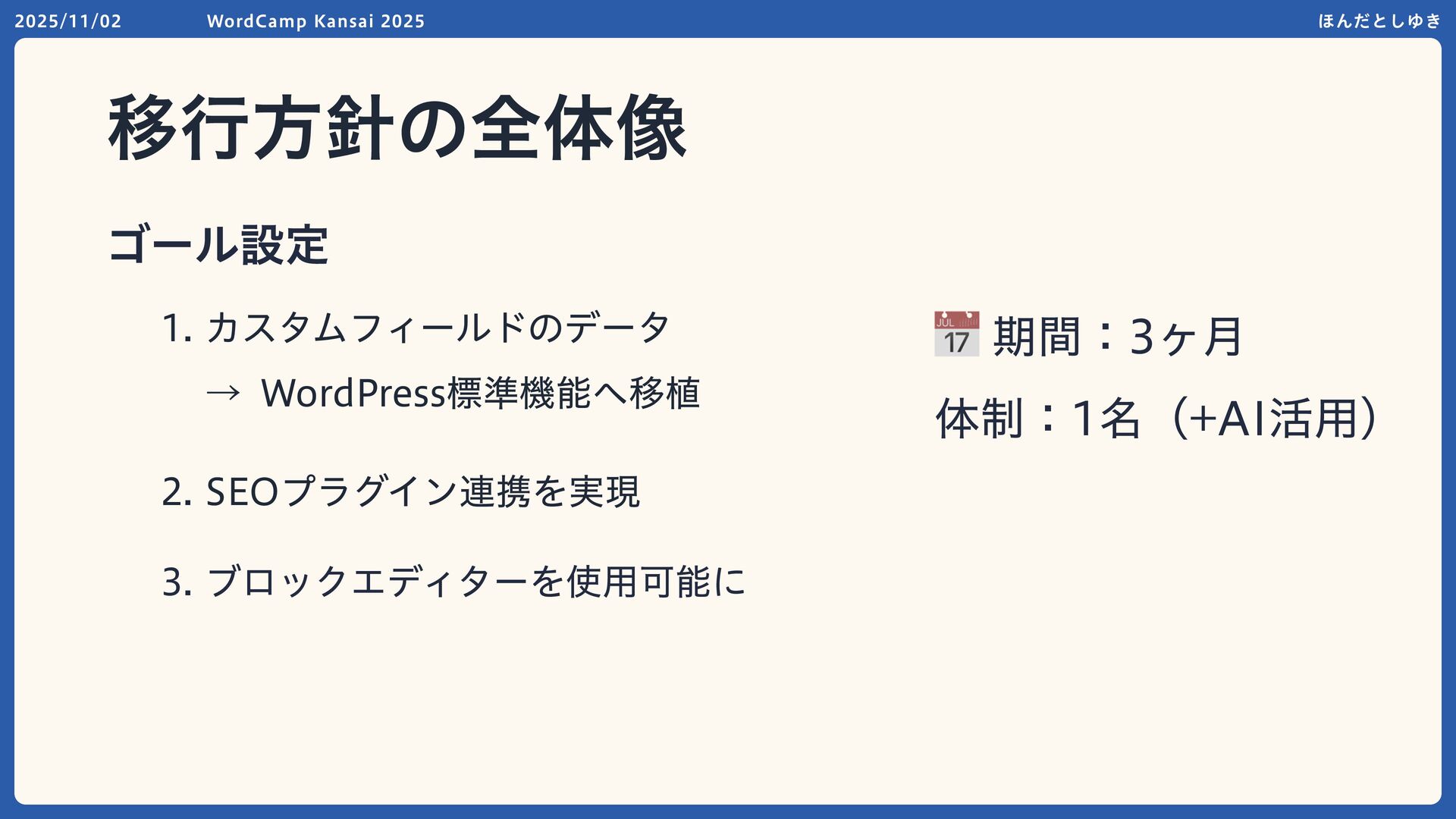 page-{slug}.phpにハードコーディングされた内容や、ページタイトル、アイキャッチ、カテゴリー、コンテンツ部分が全部ACFで定義されたカスタムフィールドになっているなど、現場で遭遇したレガシーな実装をAIの力も借りながら、ブロックエディター対応にした実際の事例をお話ししました。
