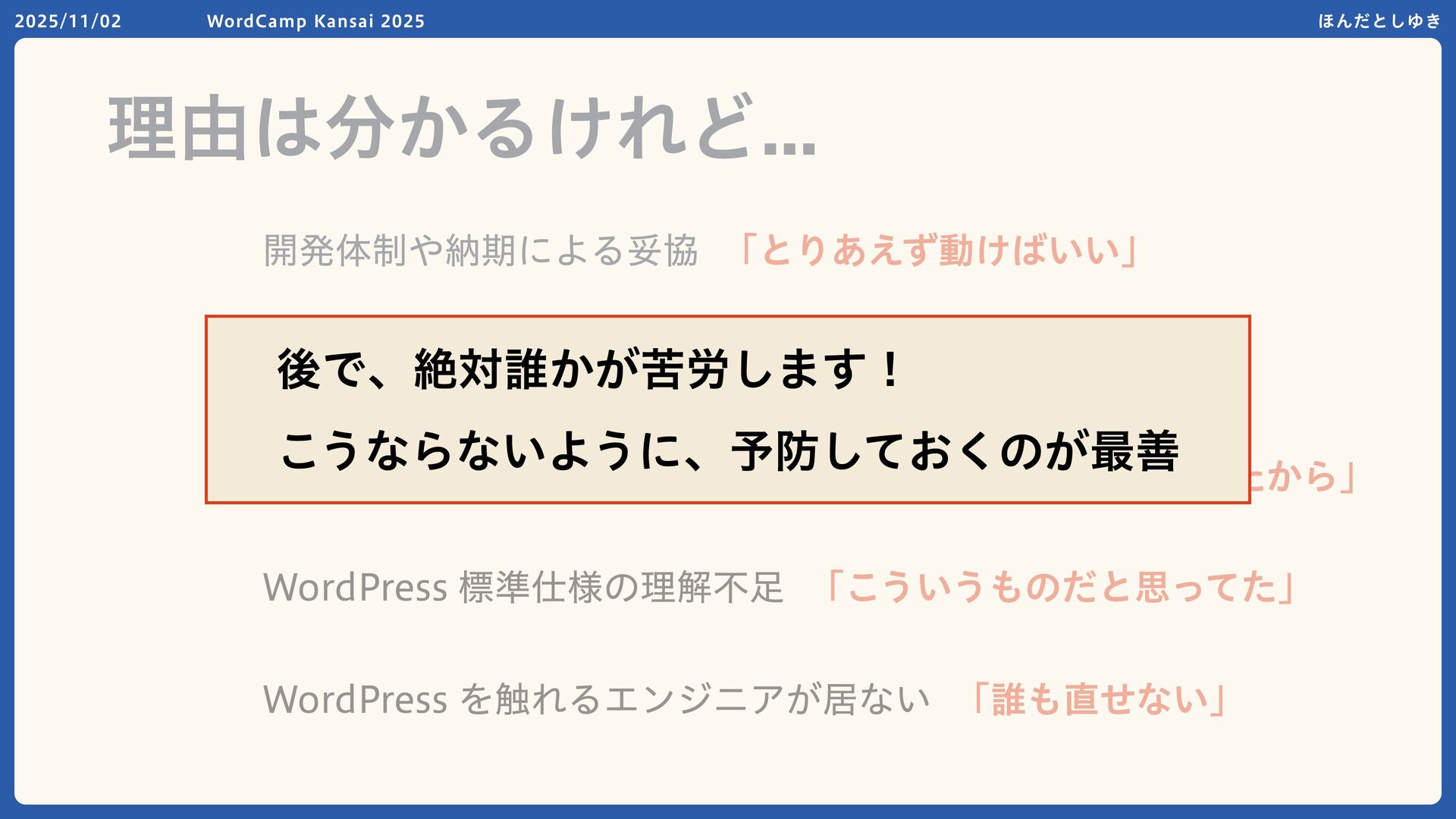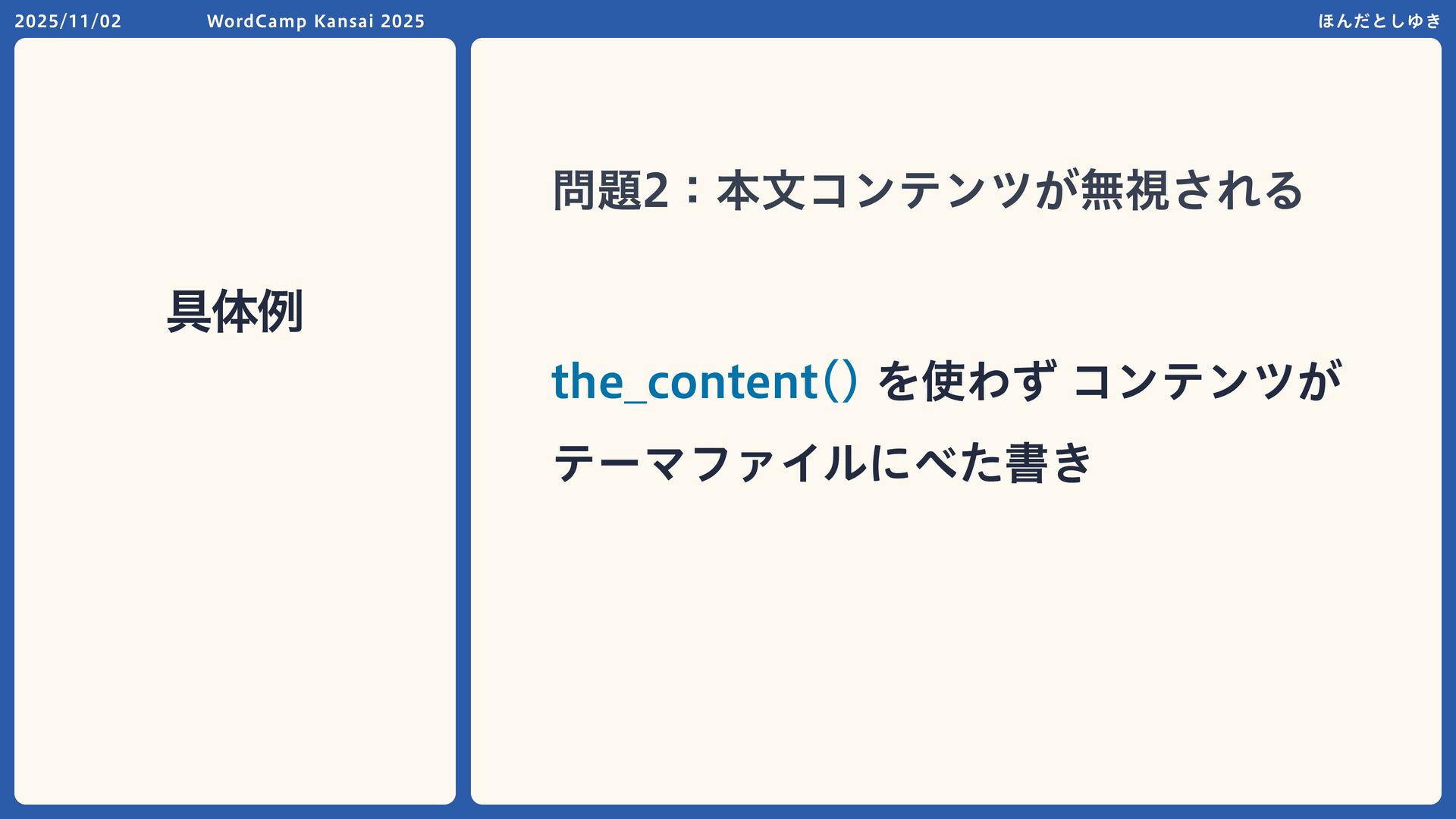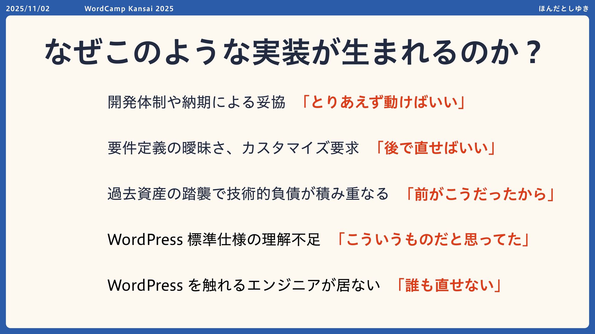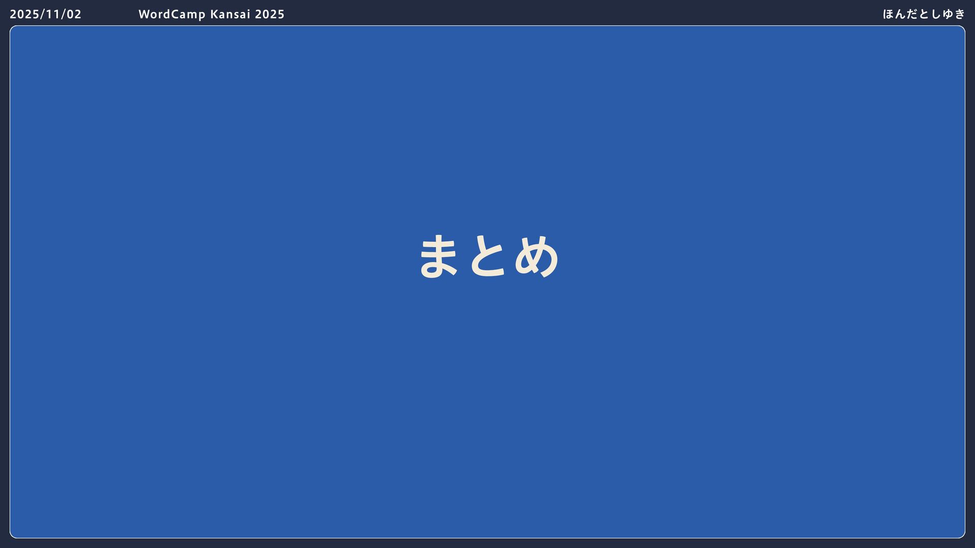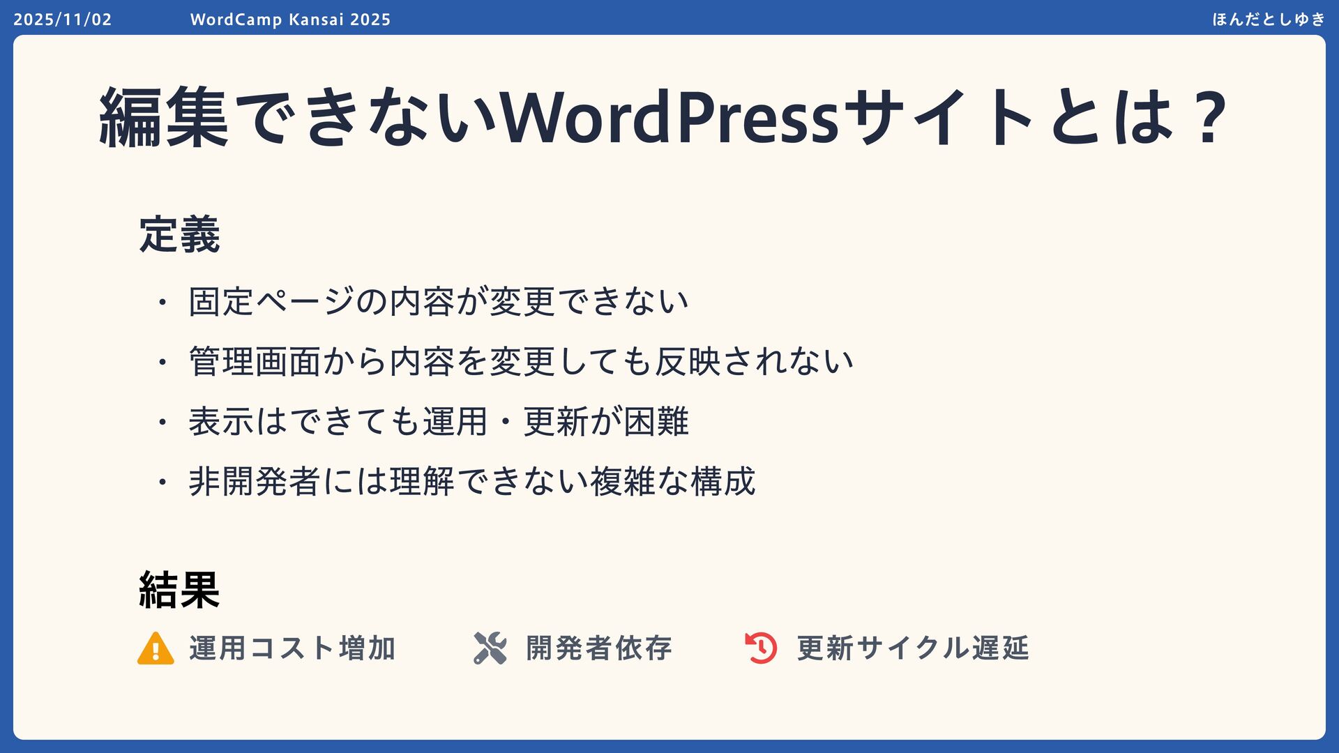 page-{slug}.phpにハードコーディングされた内容や、ページタイトル、アイキャッチ、カテゴリー、コンテンツ部分が全部ACFで定義されたカスタムフィールドになっているなど、現場で遭遇したレガシーな実装をAIの力も借りながら、ブロックエディター対応にした実際の事例をお話ししました。